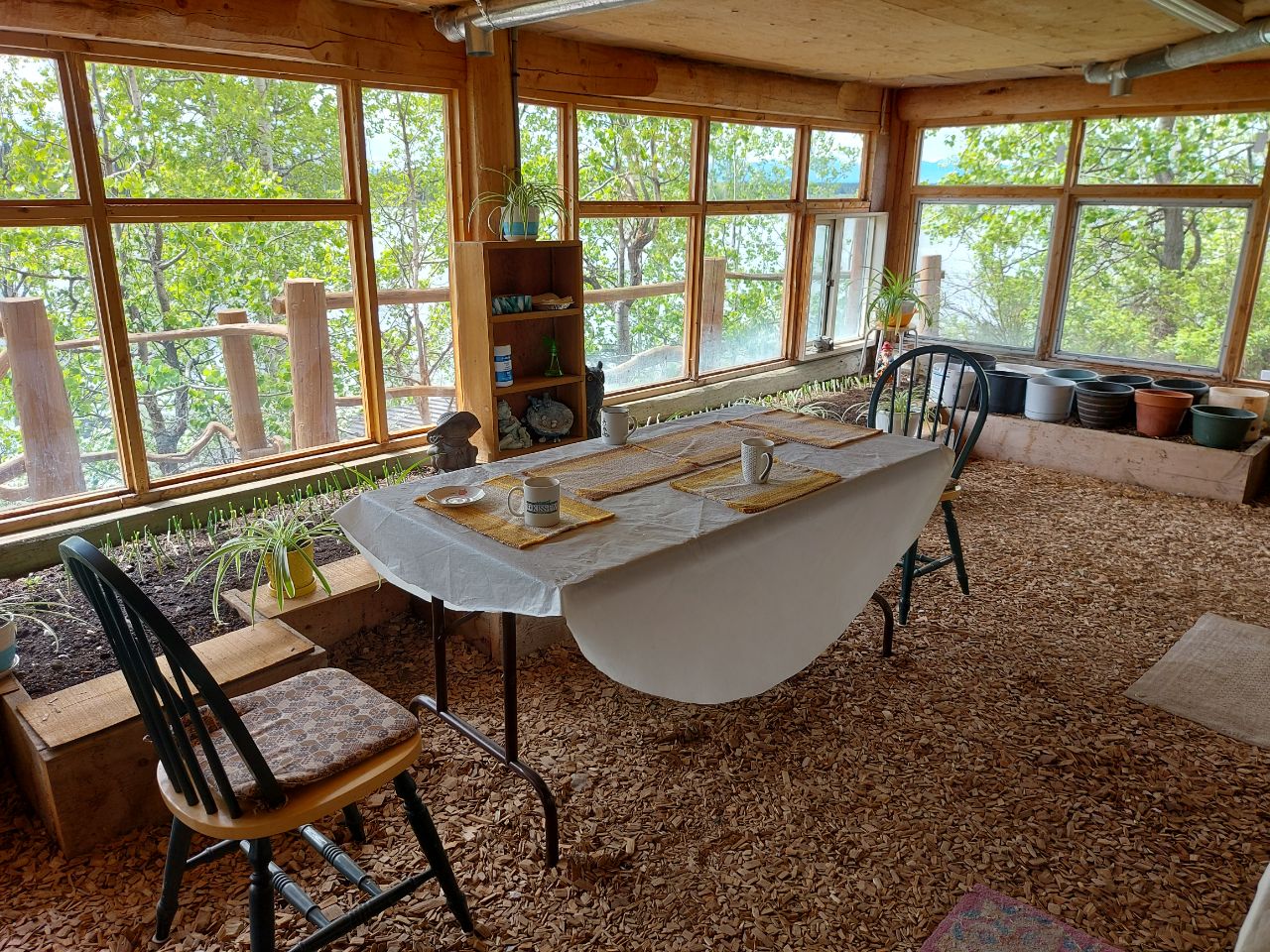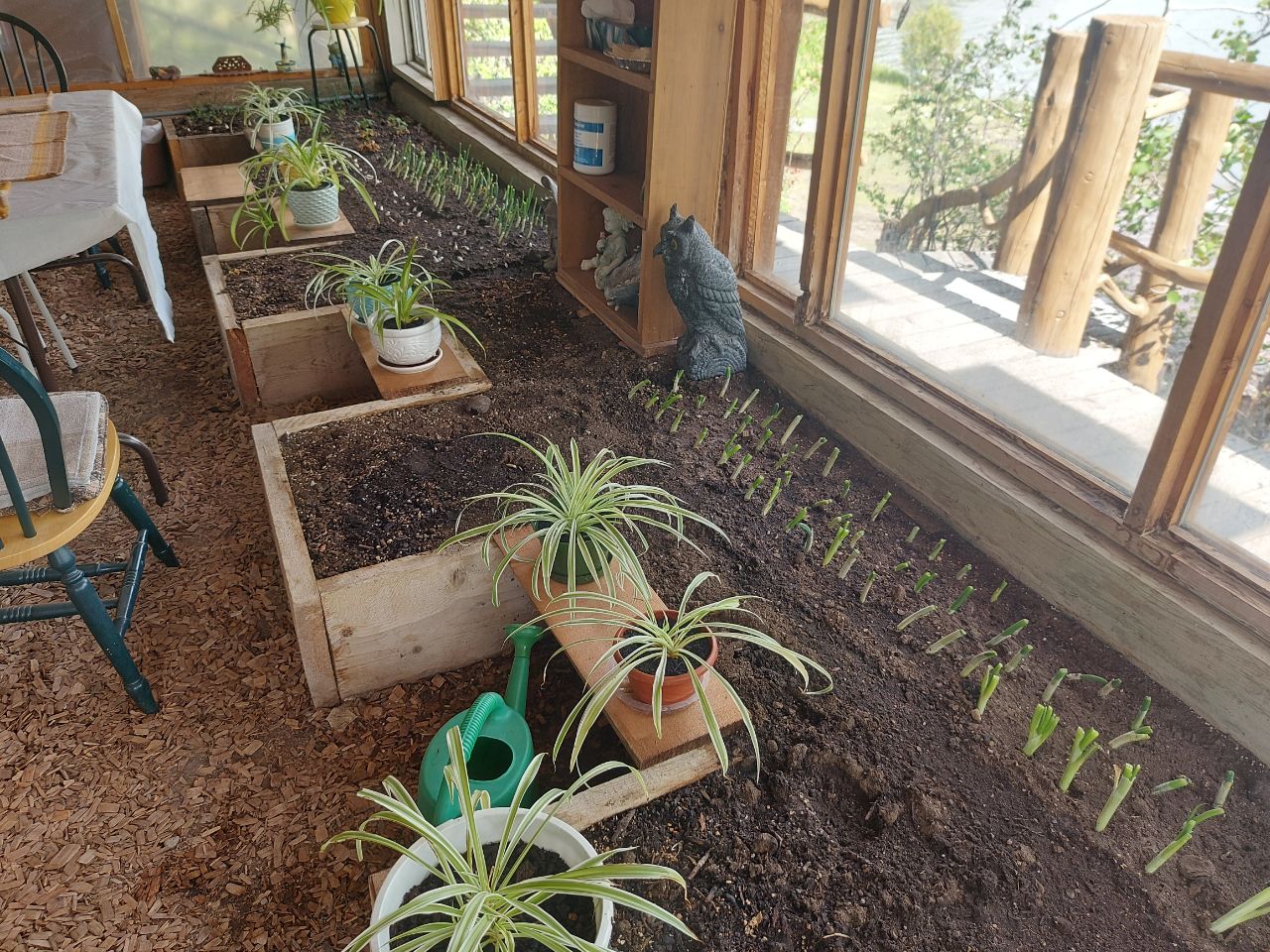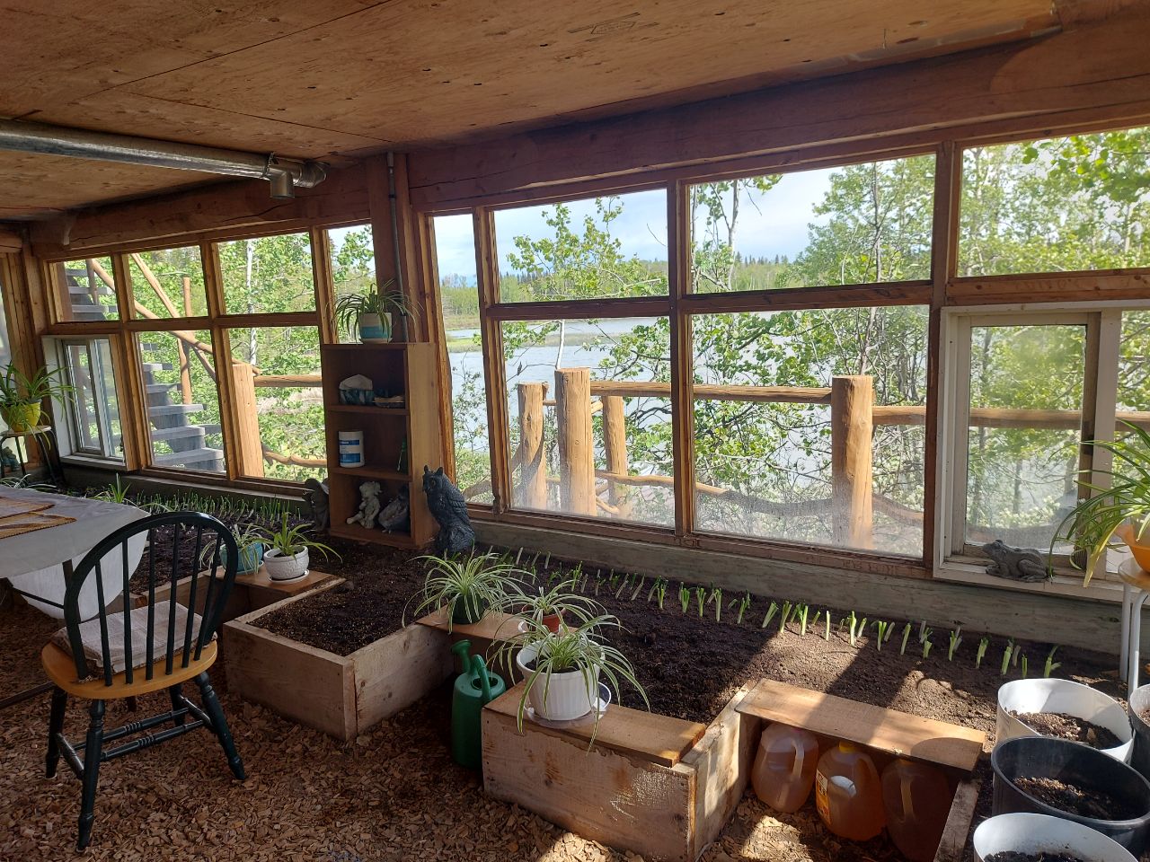 我們的烹調方式與西方人不同,我們要炒菜,炒菜會冒油鹽,油煙會污染房間,所以,我們把連接主樓的溫室改造成了廚房。 初期,溫室只是一個堆放雜物的雜物間,堆滿了亂七八糟的東西,後來,74歲的小姑娘給我們送來蔥和草莓苗,沒地方栽,於是就想到溫室,湖邊的溫室有點遠,不方便管理,於是就在連接主樓的溫室角落裡把雜物挪了挪,栽下了蔥和草莓苗,後來我乾脆把咖啡機搬進去煮咖啡喝,再後來,考慮到來人吃飯問題,於是我們決定把溫室改造成廚房, 經過一個星期的折騰,我又從商店買來好多大蔥栽植上,今日萬事俱備,開張啦!