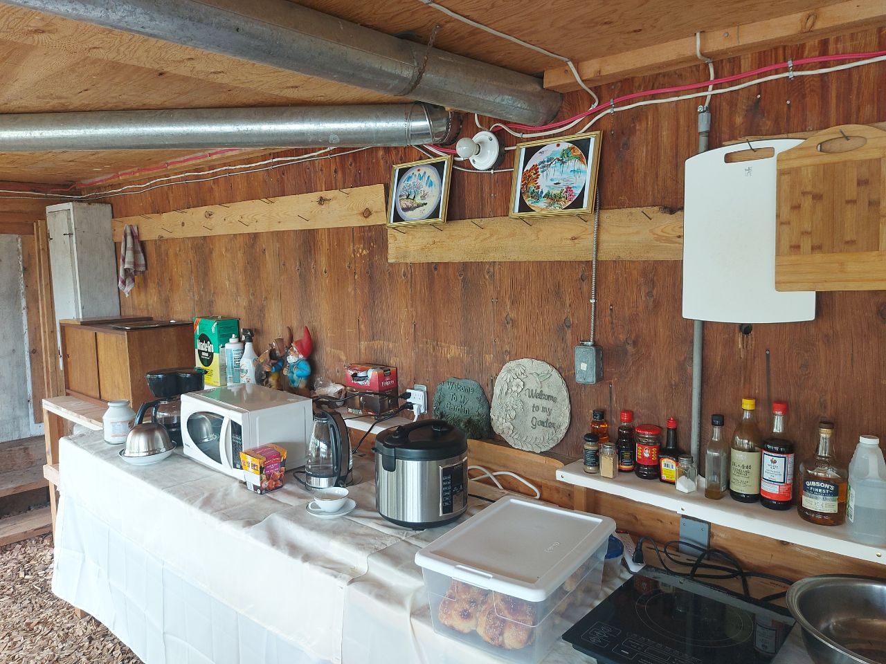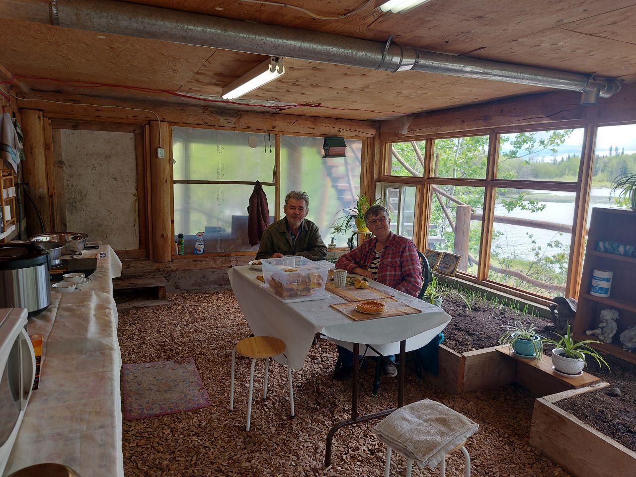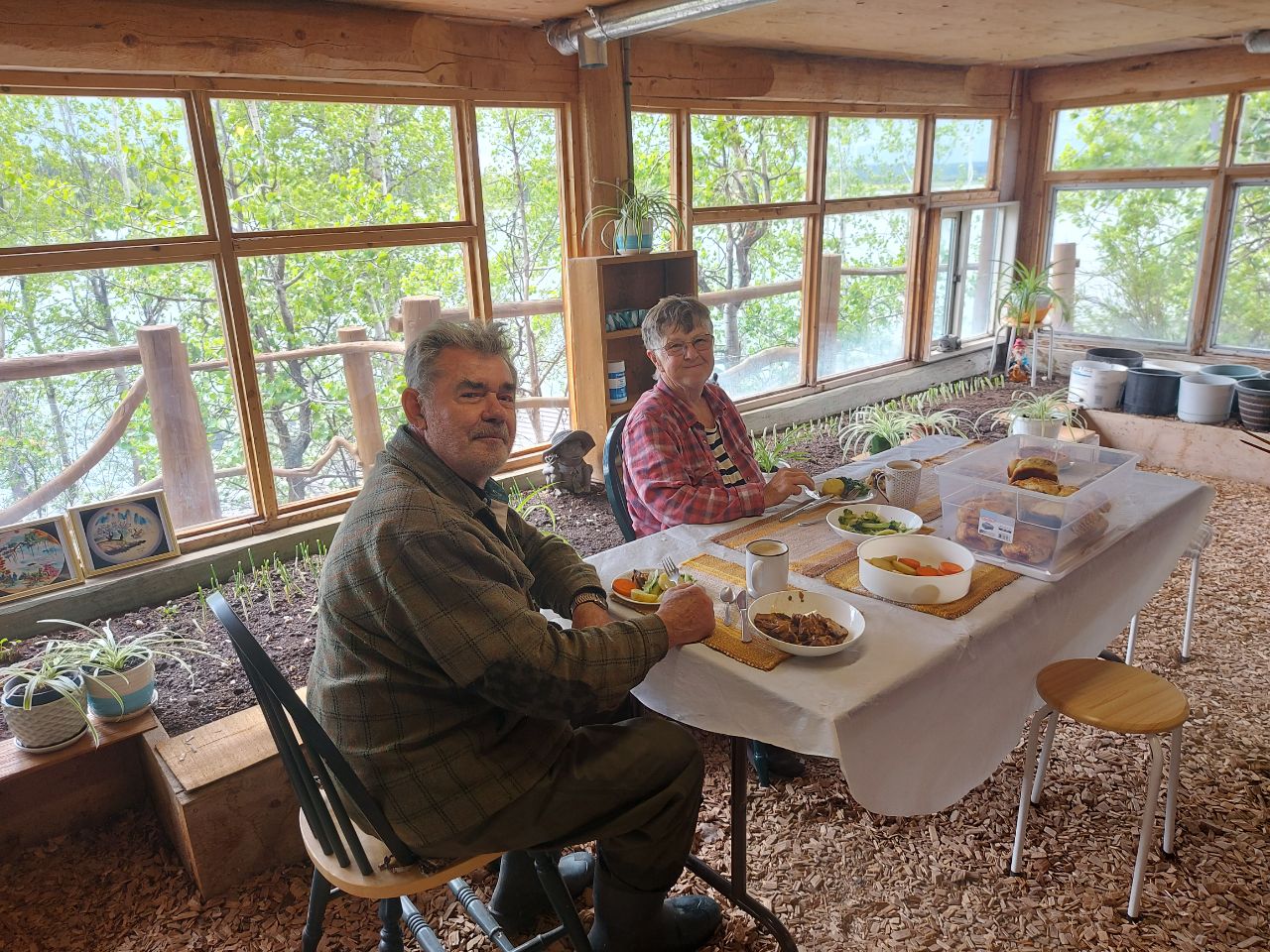 早晨拍了許多菜園+廚房+咖啡廳的照片,恰巧中午時分好像要來大雨,82歲的小夥子和74歲的小姑娘正在湖邊修理和安裝甲板來不及出去吃飯,就來問我們有沒有什麼吃的,我們趕緊把剛好昨晚炒的肉和心蕊牌麵包拿出來招待,還煮了土豆和胡蘿蔔和一點青菜,給他倆沏上咖啡,四個人一起熱熱鬧鬧慶賀新廚房竣工啦! 2024-06-15