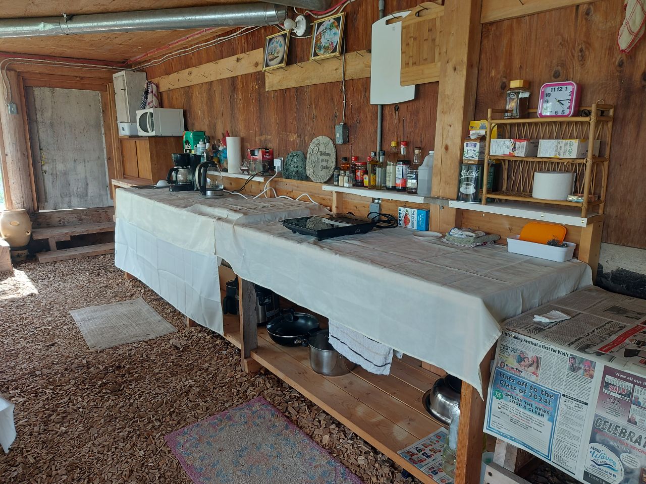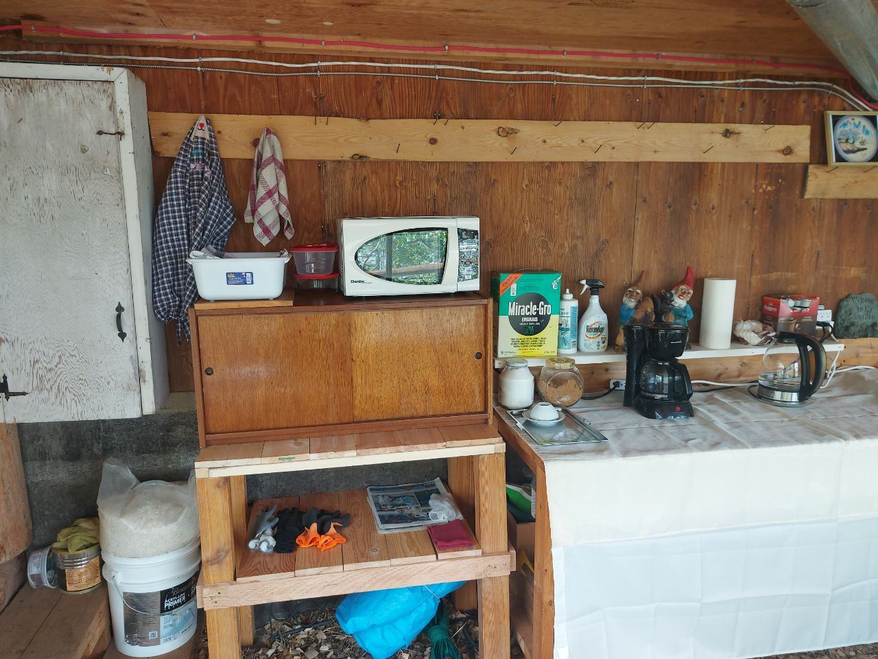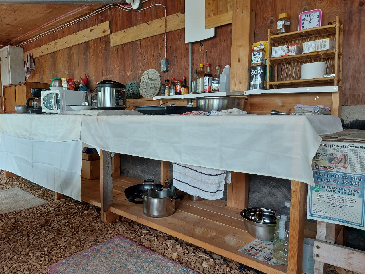 早晨拍了許多菜園+廚房+咖啡廳的照片,恰巧中午時分好像要來大雨,82歲的小夥子和74歲的小姑娘正在湖邊修理和安裝甲板來不及出去吃飯,就來問我們有沒有什麼吃的,我們趕緊把剛好昨晚炒的肉和心蕊牌麵包拿出來招待,還煮了土豆和胡蘿蔔和一點青菜,給他倆沏上咖啡,四個人一起熱熱鬧鬧慶賀新廚房竣工啦! 2024-06-15