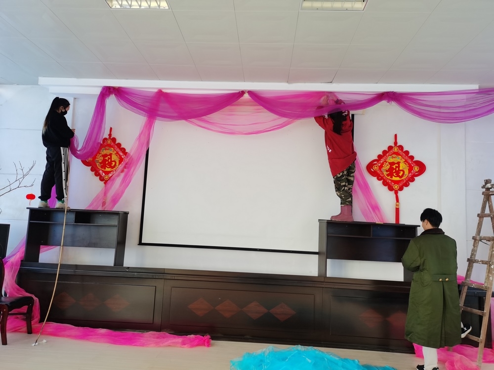 看,仙子仙女們正在裝扮舞臺,大家用簡單的道具便把牆面設計的美輪美奐,充分證明瞭禪院草追求一流的工作品質,為嬌仙丹蕊等人點讚! 瞧,親人們開始彩排晚會節目了,踏著音樂的節拍一起舞起來,已經按耐不住心中的喜悅,臉上燦爛的笑容說明瞭一切。