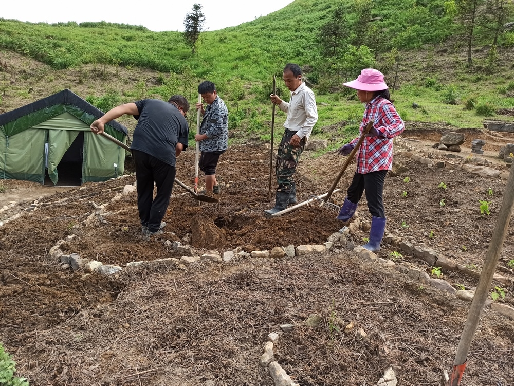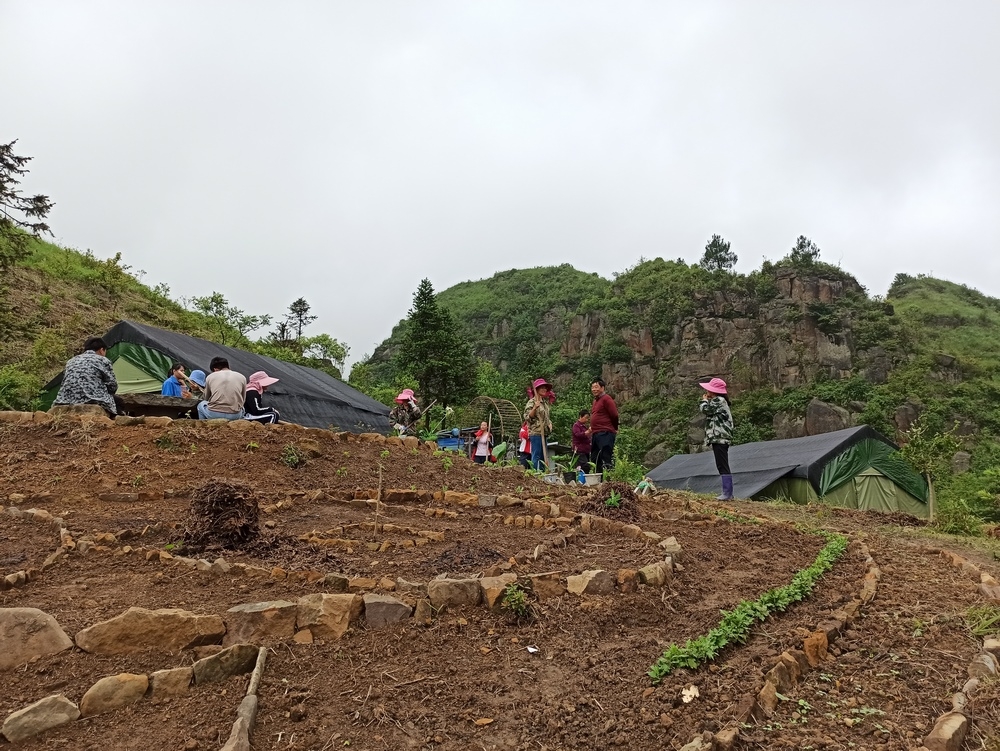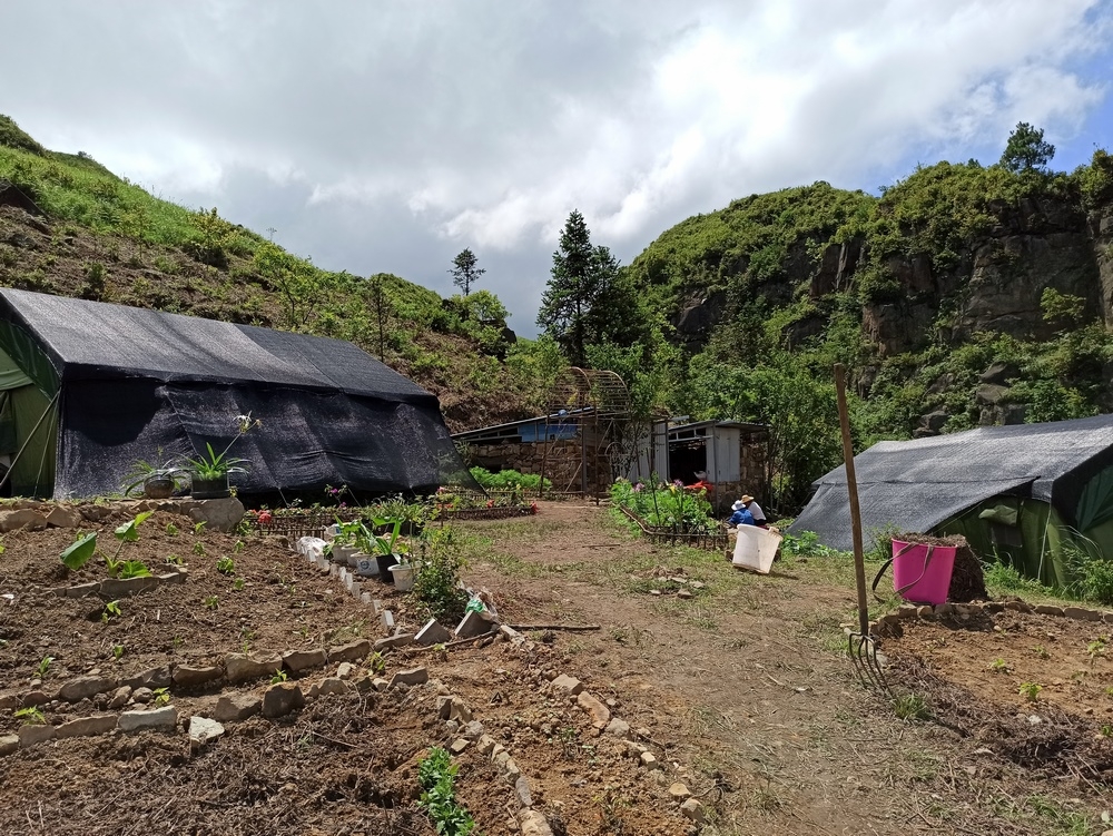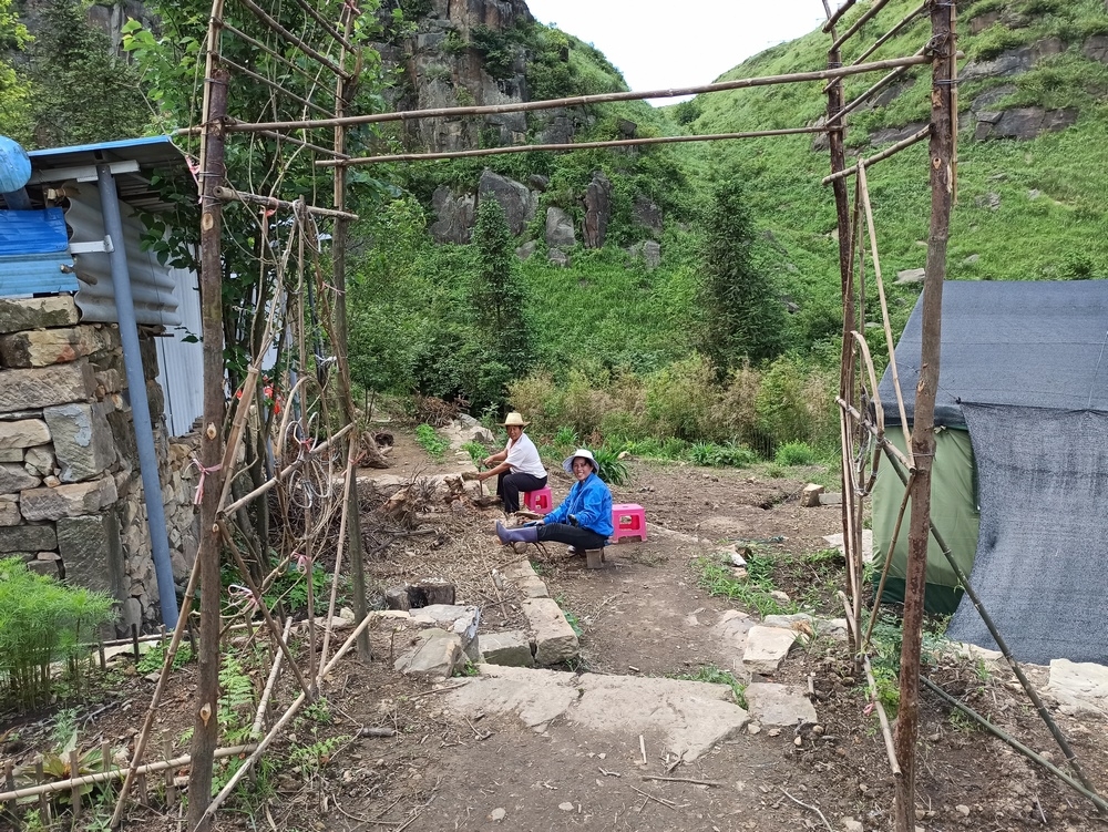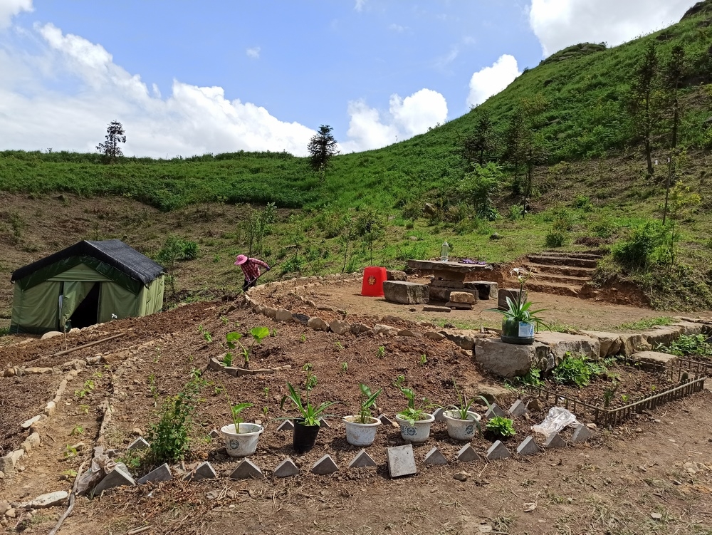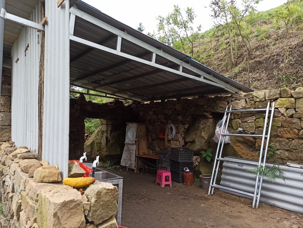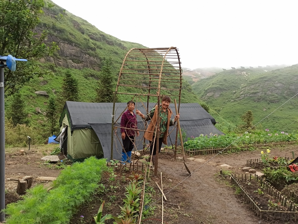 二道灣是個風水寶地,從大斜坡上去到望天崖,穿過一條小溪流就是進基地的路,順著小溪流拐個彎就到了二道灣,那裡有山有水,有溪流有竹林,我們在那裡開闢了一個苗圃園,現在又建設出了一個微型仙家樂園,主體是4頂帳篷,一個改建的廚房和工具房,然後又在周圍種上了各種花卉,周圍山坡上是各種果樹:李子、獼猴桃、橘子、桃樹、梨樹等, 現在正在為三千多株月季花安家落戶,可以預見,幾年後,這裡是鮮花滿園瓜果滿山,帳篷那裡還有手機信號,對面山頭是隔壁縣政府鋪設的太陽能發電板,整個地方又相對封閉,住在那裡也相當的幽靜。