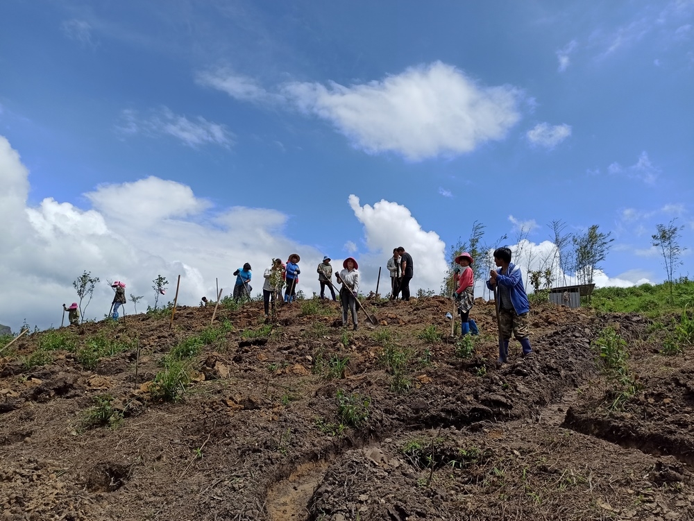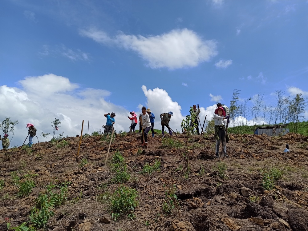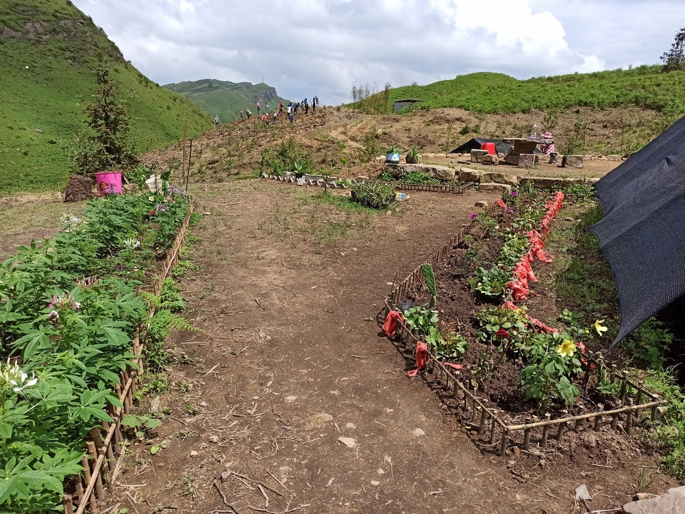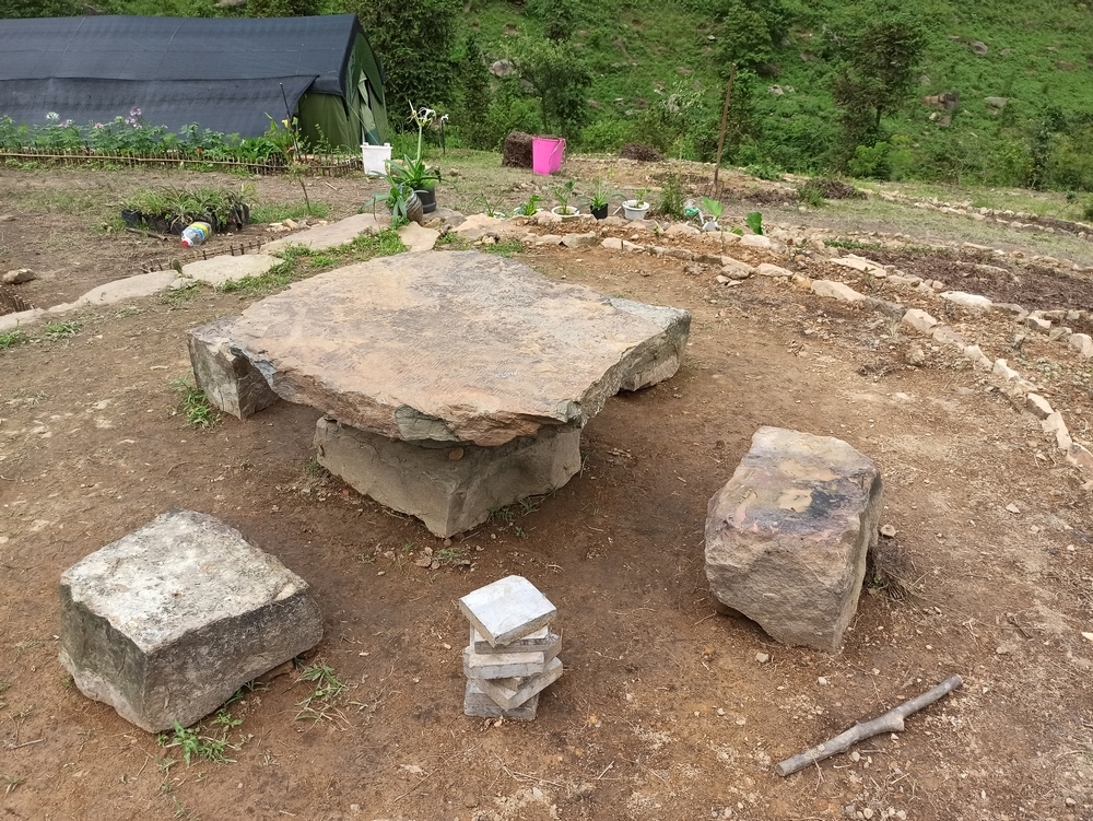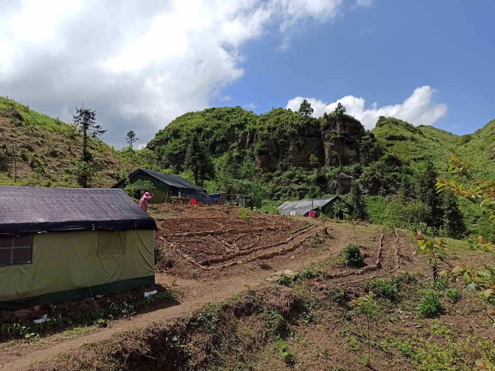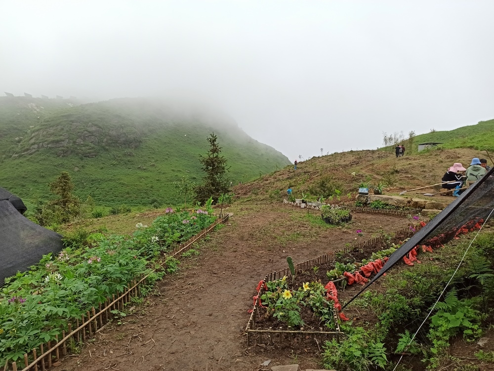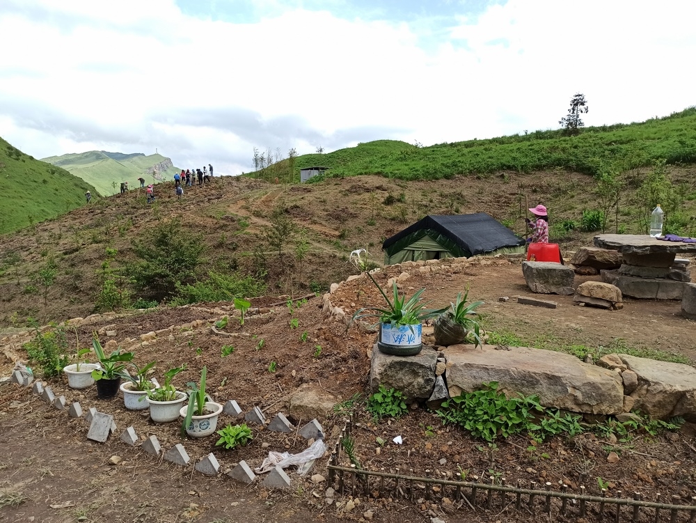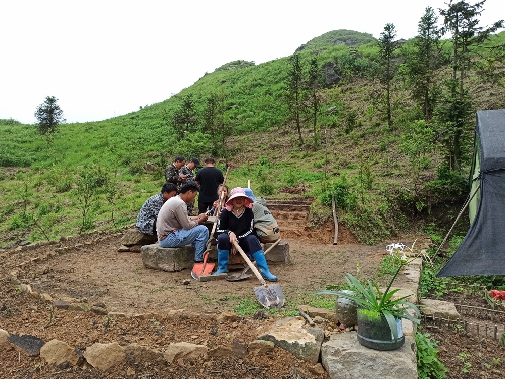 二道灣是個風水寶地,從大斜坡上去到望天崖,穿過一條小溪流就是進基地的路,順著小溪流拐個彎就到了二道灣,那裡有山有水,有溪流有竹林,我們在那裡開闢了一個苗圃園,現在又建設出了一個微型仙家樂園,主體是4頂帳篷,一個改建的廚房和工具房,然後又在周圍種上了各種花卉,周圍山坡上是各種果樹:李子、獼猴桃、橘子、桃樹、梨樹等, 現在正在為三千多株月季花安家落戶,可以預見,幾年後,這裡是鮮花滿園瓜果滿山,帳篷那裡還有手機信號,對面山頭是隔壁縣政府鋪設的太陽能發電板,整個地方又相對封閉,住在那裡也相當的幽靜。