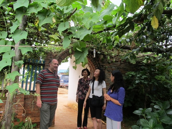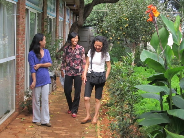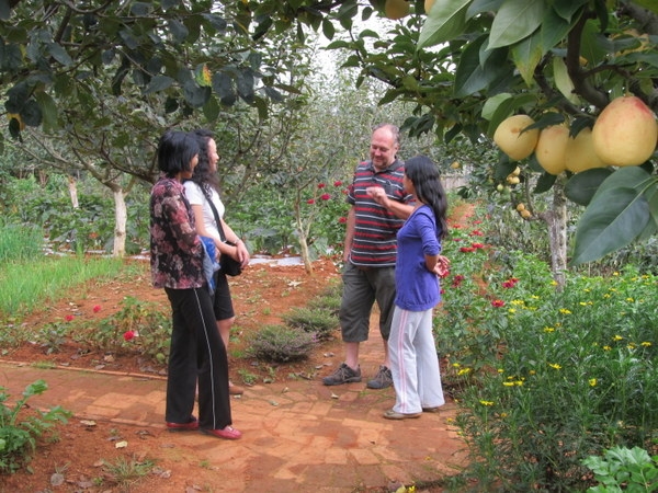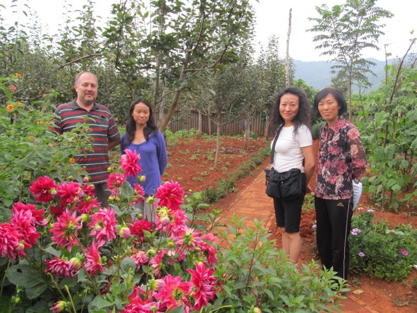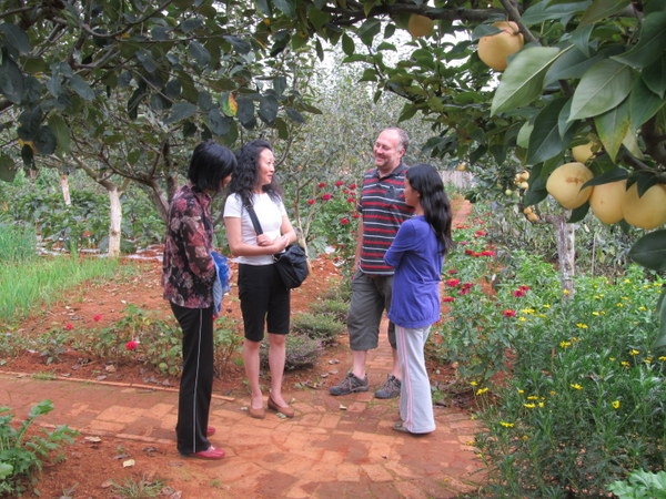 今天下午四點多,我正在屋裡工作,聽到樓下有人交談的聲音,似乎還夾雜著了幾句英文,心裡正尋思著是誰來訪,就聽到正信在樓下叫我,到了樓下見到了滿面笑容的一位中國女士和一位老外。 打過招呼,慢慢交談后才瞭解到原來歐陽女士通過禪院中文網瞭解生命禪院已有兩年之久,她非常同頻導遊寫的文章和生命禪院理念,這次和丈夫回國旅行到了昆明,即想到家園來看看。 她說曾經在網上詢問過家園位址,被告知須發郵件到一個QQ郵箱,但她發了以後信被退了回來,說郵箱不存在,所以她不知道家園的具體位址。 但因為常常上網,所以記住了一分院有個鳳凰峽,也看過照片,知道在溫泉鎮附近,所以這次就憑著自己的感覺找到了鳳凰峽,恰巧今天院長和正信在鳳凰峽附近賣梨,因此跟著一起來到了聚仙台。