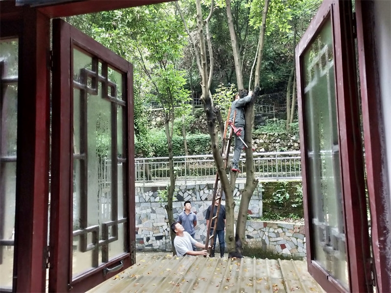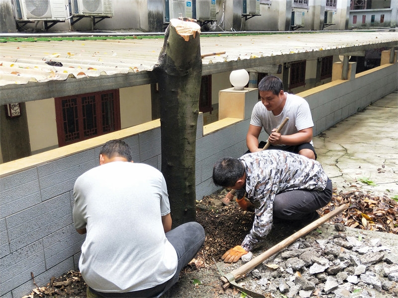 他們在把一棵生長的不合時宜的樹木鋸掉,重新打了周圍的地面,並做了排水溝。