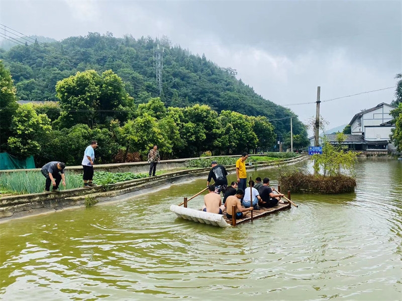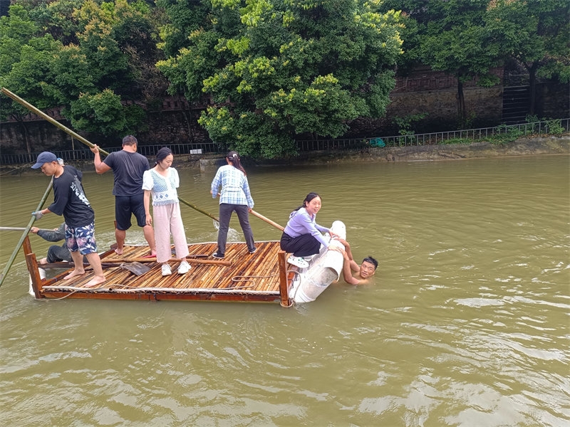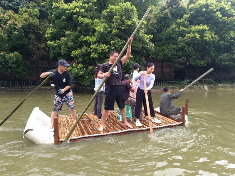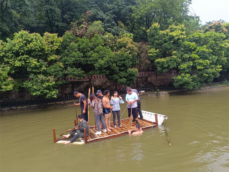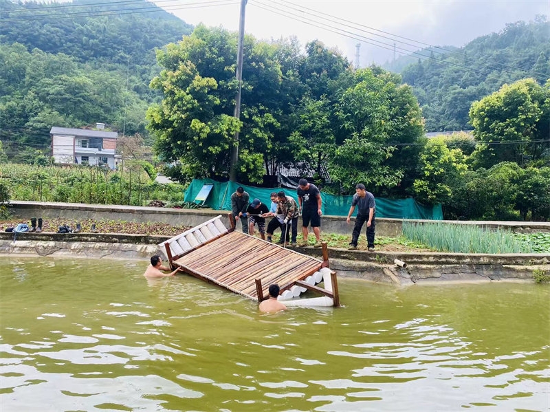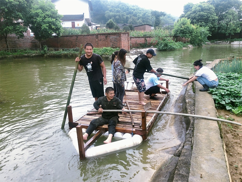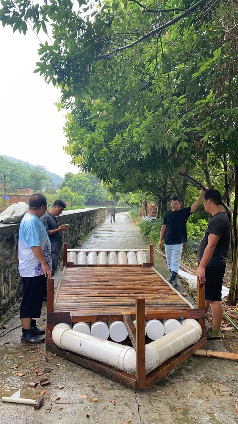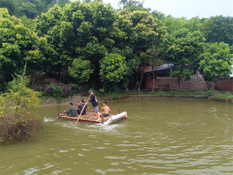 乾龍和方圓是家園裡兩位不可多得的能工巧匠,善於維修家園的大小設備和解決生產生活中遇到的機械難題,這天,他們利用廢舊的塑膠管和閑置的木料製作了一個小木筏,這個小木筏最多可以容納七八位仙人,那天剛製作好的小木筏要在小池塘里試遊,不一會兒功夫,就吸引來了兄弟姐妹們的紛紛好奇躍躍欲試,大家都想體驗一把水上划船的感覺, 旁邊還有幾位游泳高手隨時保駕護航,沒想到「恆茂一號」第一次試遊就成功了,那天大家玩得很盡興,我們又多了一項娛樂項目,當然此專案只限於內部使用,並未對遊客開放。 後續他們又在小船周圍增設了護欄,這下就顯得更加專業了,為他倆的創意設計和動手能力點讚哦!