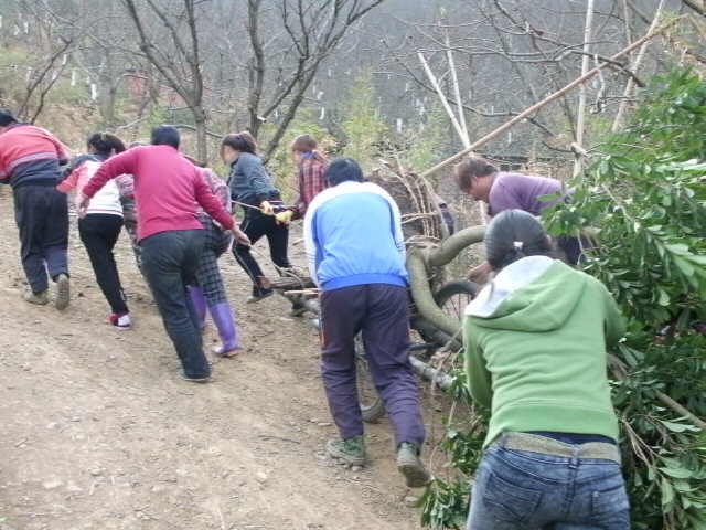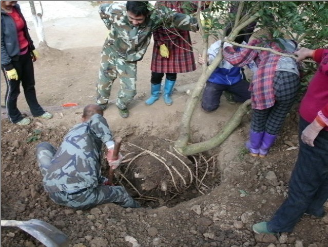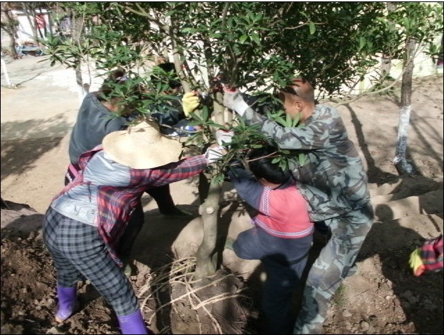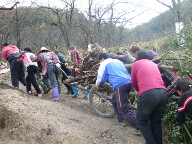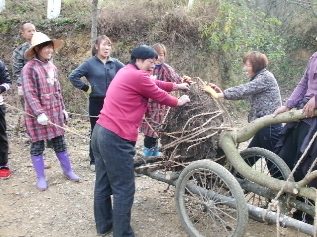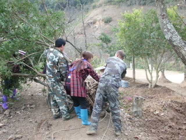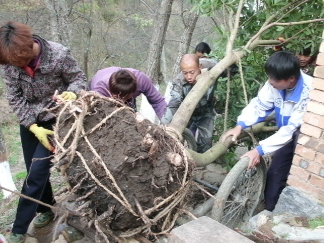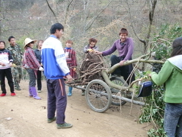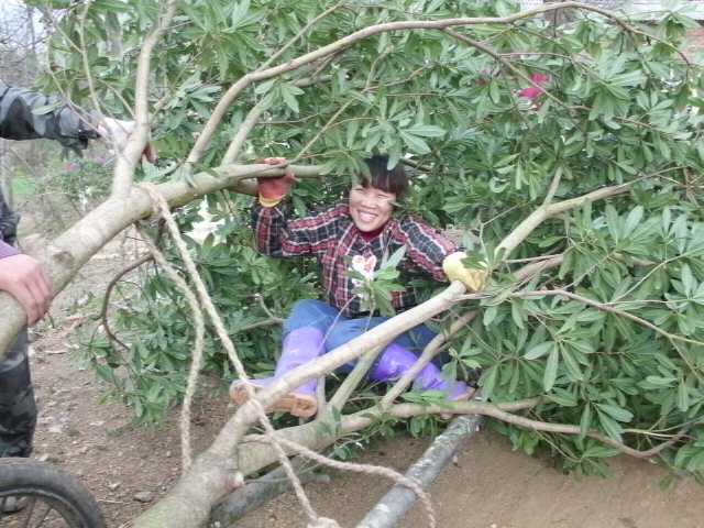 近五六天太極院長準備奔赴新崗位,在走之前,和心濤院長共同組織了一次集體移栽楊梅樹行動! 頭2天是兩棵大楊梅樹,要從地勢低的彎彎繞的菜地里移到地勢高的主樓邊的土坡上,第一次看到移樹,新鮮得很,別看楊梅樹看起來不大,運起來很重,仙子仙女們齊上陣,邊喊口號邊推、抬、扛的場面煞是壯觀! 可惜第一天拍的照片因無傳輸線無法匯出,現將另一部分拿來與親人們共用。 最好玩的是第二天就做了個木推車,神音仙女坐在樹幹上壓陣,以保持平衡,大家齊心協力推著楊梅樹“翻越”一個又一個土坡時,仙子們還叫著“嘿哟嘿”的口號呢,聽著好有勁; 仙女們也來一起幫忙,看著那情景好感動! 覺得禪院草就是小變形金剛加大變形金剛,呵呵,不就幾棵樹嘛,還不把你們栽得一愣一愣的! 好了不多說啦,發照片!