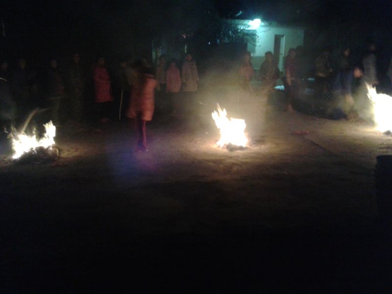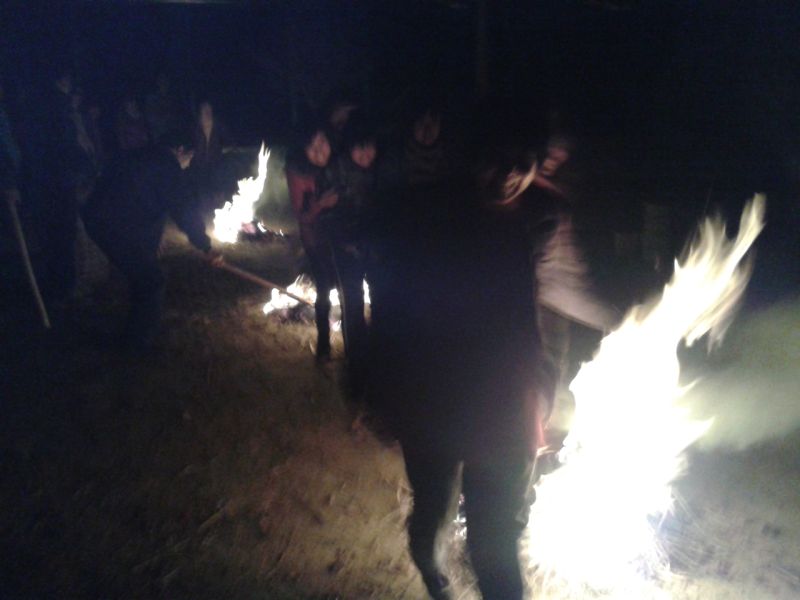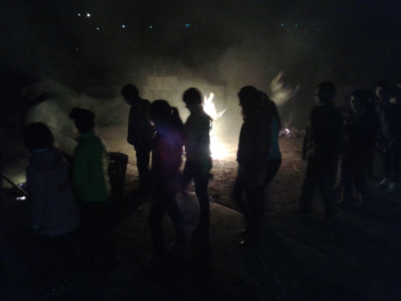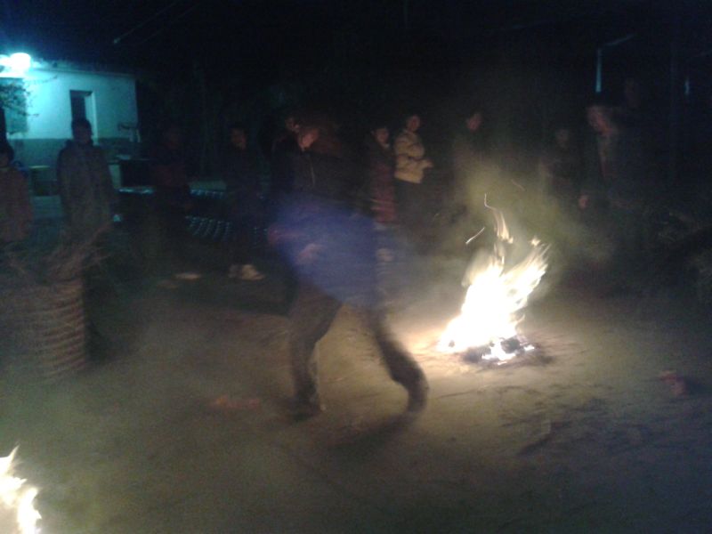 昨夜的跳火堆儀式好熱鬧,院子里點燃了三堆熊熊大火,近四十位兄弟姐妹排著隊一個個從火堆上跳過去,每人一連跳了八遍,好多美女的褲子都差點燒著了。 跳火堆是傳統民間習俗,正月十五玉皇大帝準備懲罰地上惡人,偷偷地告訴地上善人,只要正月十五夜晚門前點上三堆火,就可免於災難,所以,每到正月十五元宵節,家家戶戶門前都點上三堆大火,據說,如果元宵節人們從火堆上跳過去,就能讓火燒掉身上的邪氣、病氣、傲氣,一年裡就可吉祥如意好事降臨,故,隱逸山莊就熱熱鬧鬧地跳火堆了。