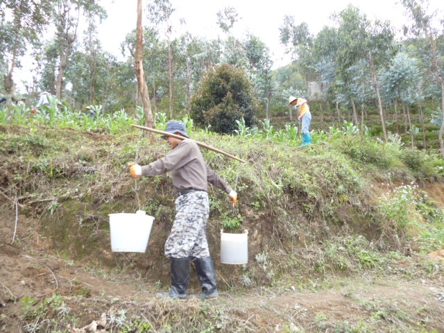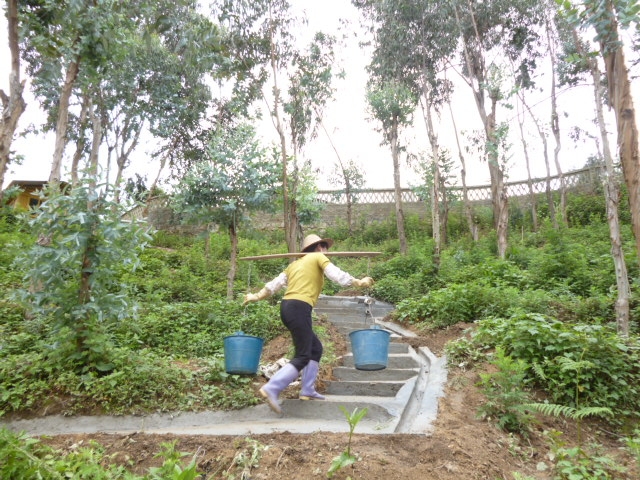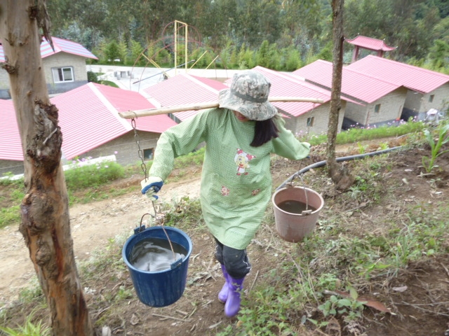在神奇的第二家園里,每一位都是勞動者,這裡大家一律平等,不分背景,今天從化糞池挑大糞,要從鳳鳴嶺穿過大河川挑到天水寨山坡上的玉米地里,往返一公里左右,還要上坡下坡,挑大糞,這是很累很髒的活,可家園裡生活的碩士研究生,大學生,曾經的老闆,學校的校長和老師都在挑糞,下面五張圖片分別是碩士研究生鳳性草、大學生襲黛草、老闆金夫草、 校長彼岸草、教師百川草挑糞的情景。