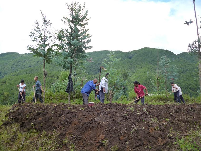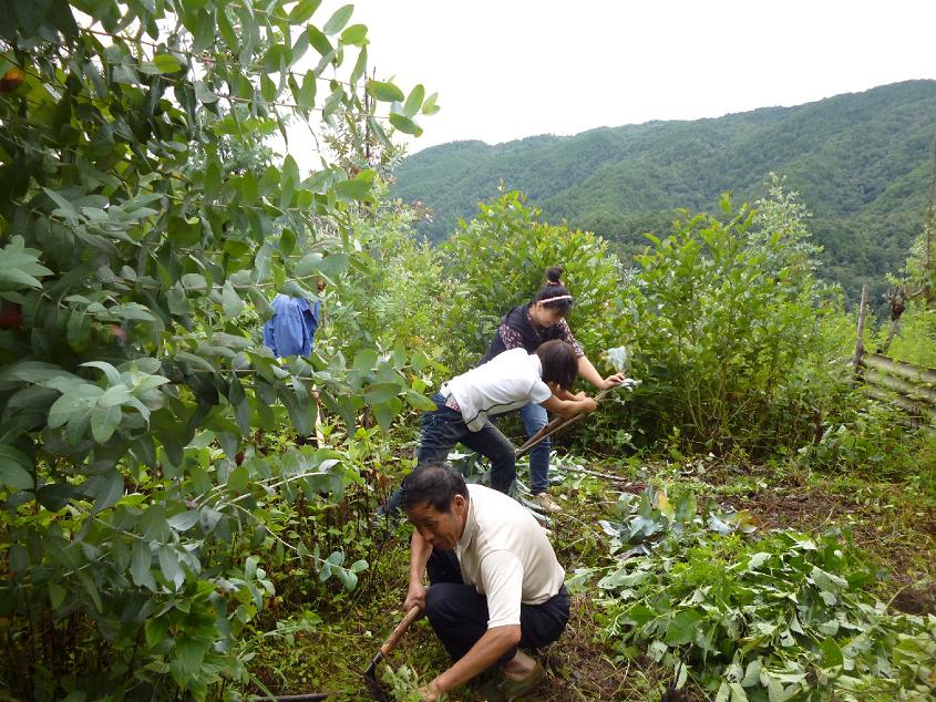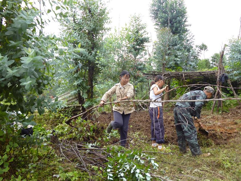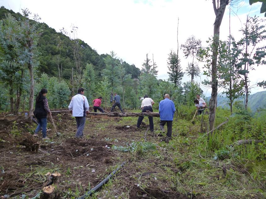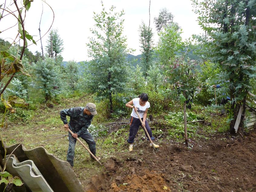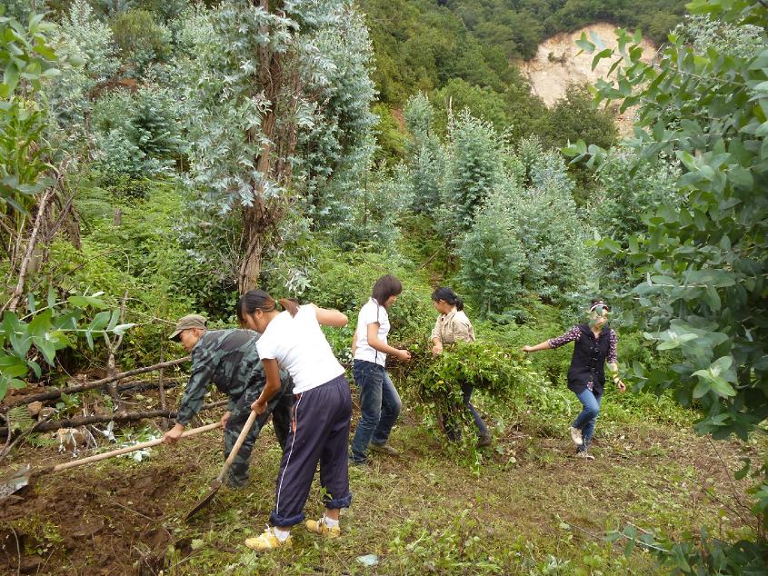 前天我們一行14人乘兩部車從一分院出發歷時九個小時達到四分院,原定的床沒有送到,大家打地鋪,昨天早晨七點大家開始開闢菜地,經過一天的勞動,從樹木很多雜草叢生的地方開闢出一塊菜地,傍晚床送到,靈子、滄海、祥君去採購東西,我今天早晨7:30離開四分院現已返回一分院,請欣賞圖片。