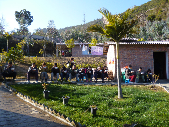 為了調節大家的疲累,太極草在大廳四面牆山安裝了四個高音大喇叭,每天七點準時播送瀟菡草選來的音樂,悠揚的旋律在四分院每一處空間迴響,不論是天水寨的兄弟姐妹,還是靜月峽的兄弟姐妹,都能聽到,每天七點十分左右,五十多位兄弟姐妹基本都在工地開始了一天繁重的勞作,剛來幾天的法恩草第二天就參與了勞動,頭三天勞動下來,累得腰酸背痛, 我說要是受不了就休息一天吧! 她說看到這裡大家如此勤勞,非常感動,無論如何我也要堅持勞動。