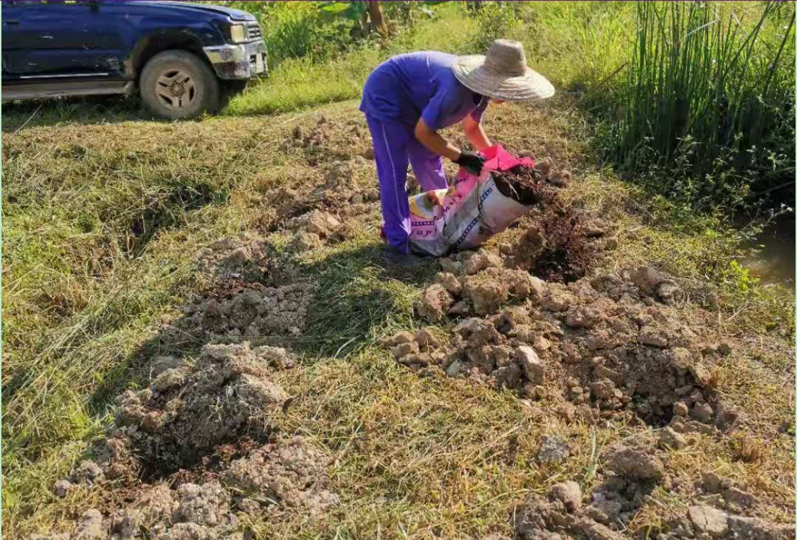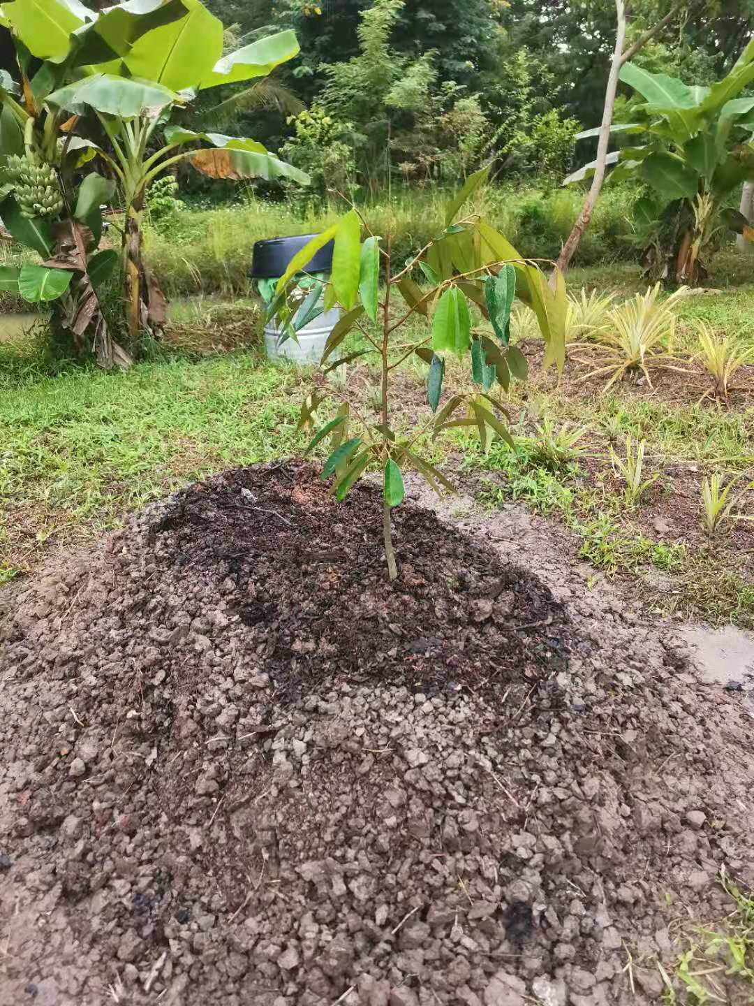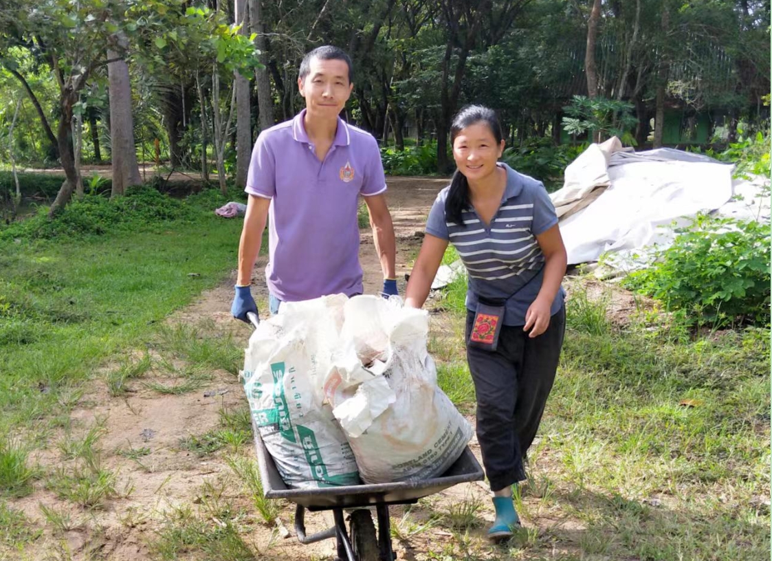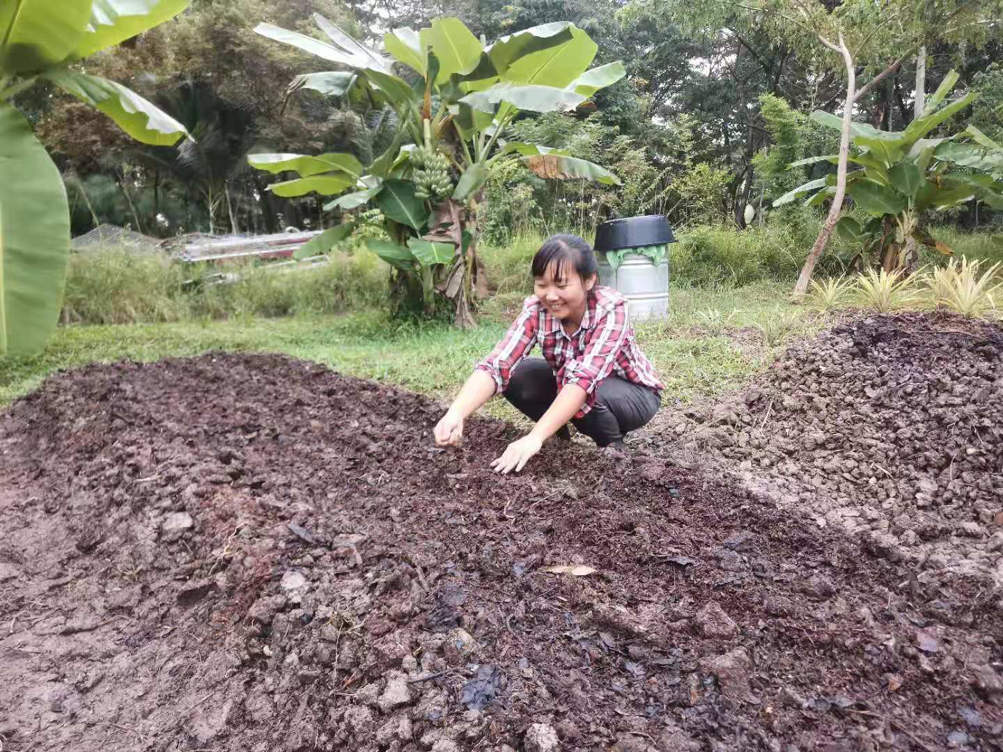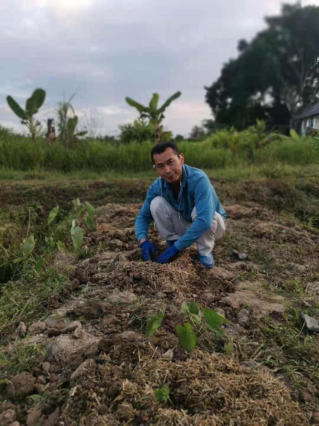 大氣哥一本正經的幽默,幹起活來耐力十足,細緻認真,第一次見識到,種果樹挖這麼大的坑(深一米、長寬一米五),先把腐爛的木頭和雜草填進坑底,一層土壤一層肥料,然後再一層em噴灑,為買來的榴槤樹和龍宮果樹做了厚厚的“三明治”,不僅感歎這兩棵樹真是好運氣,未來幾年的養料都備足了。