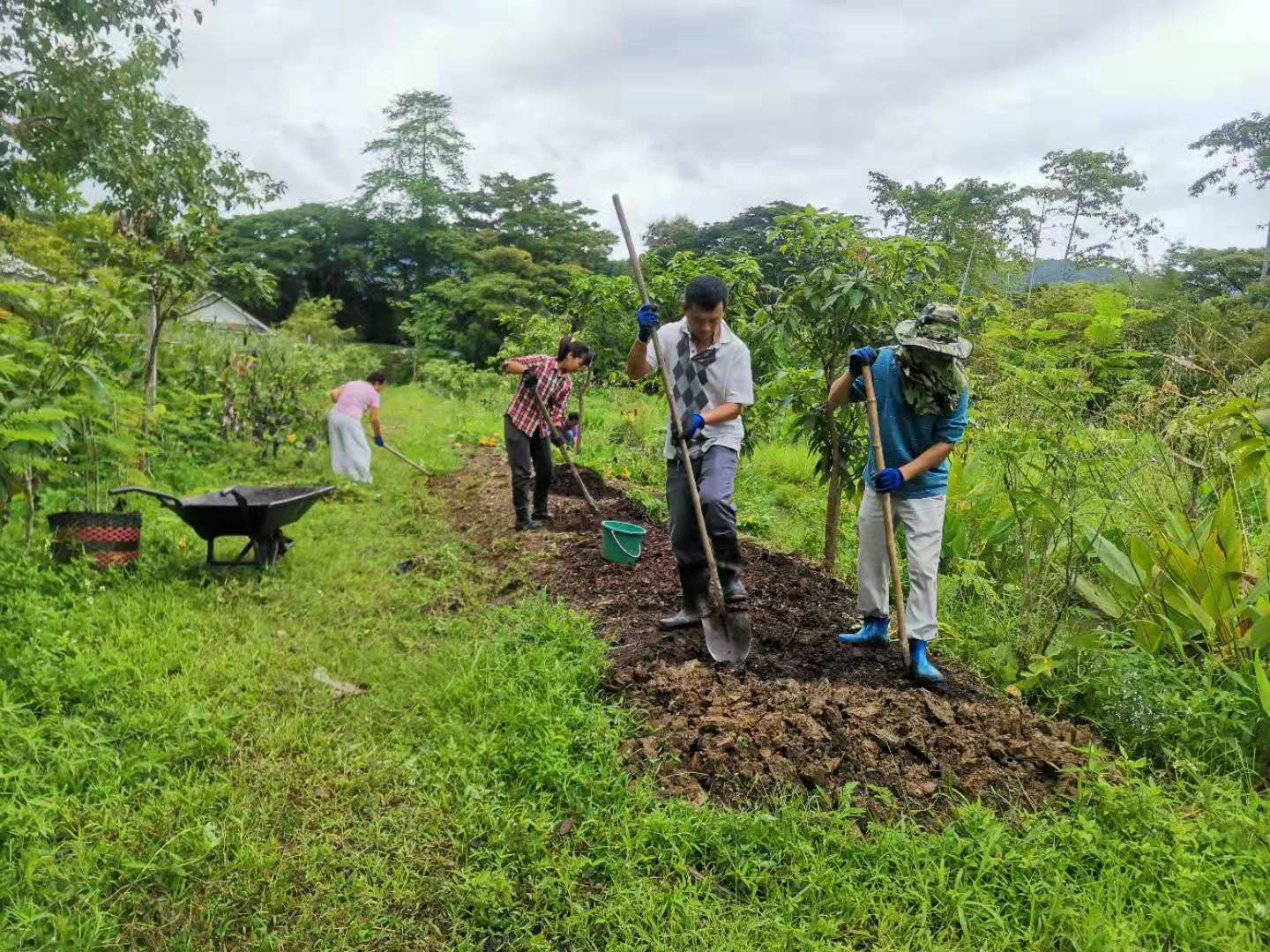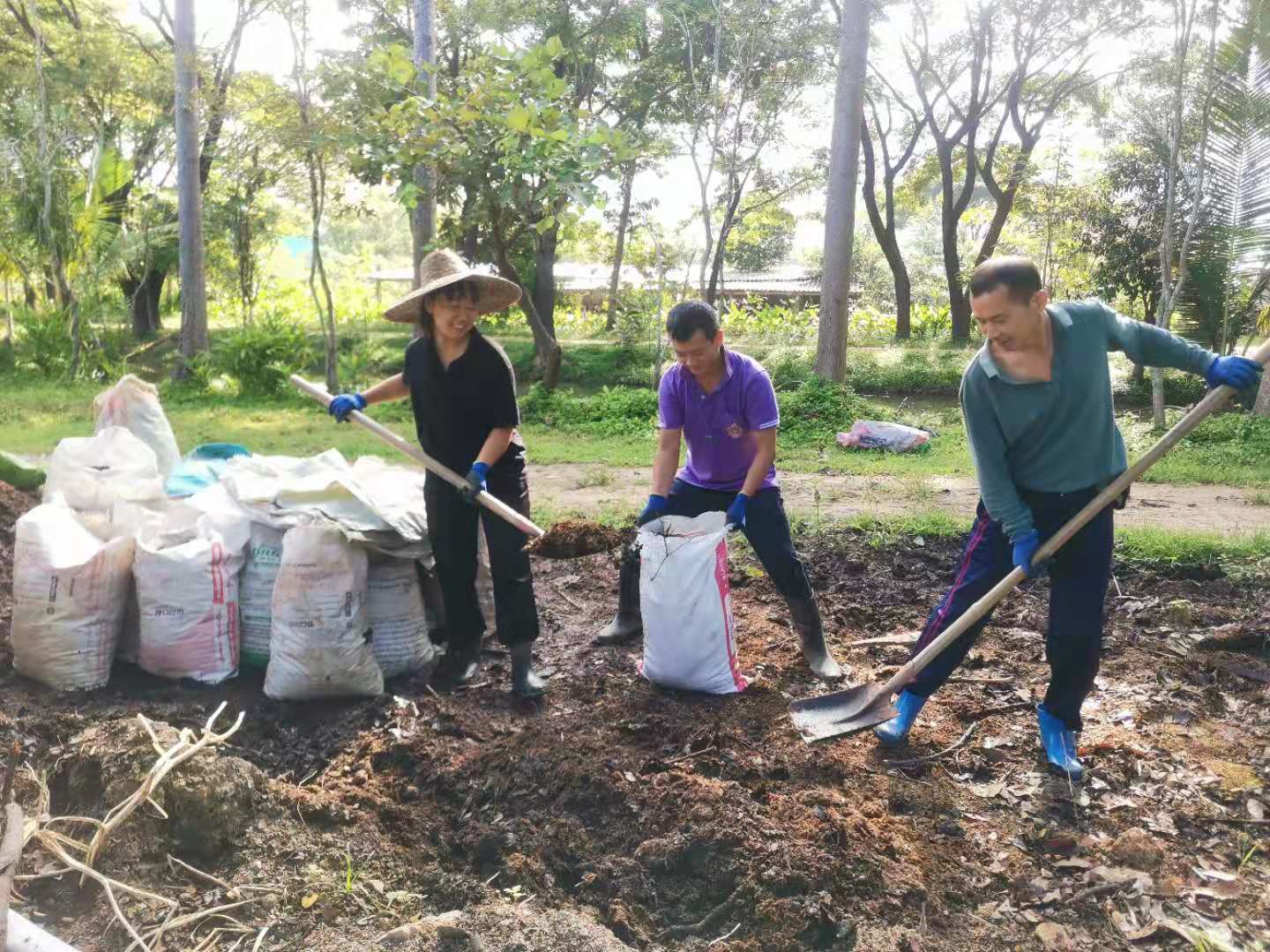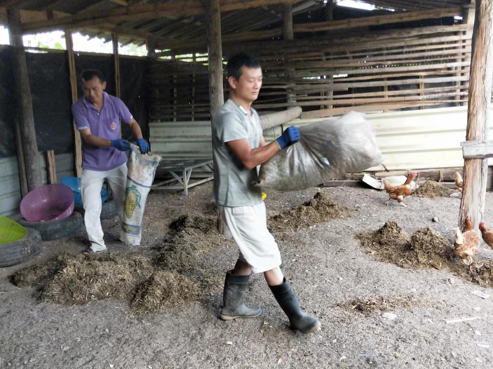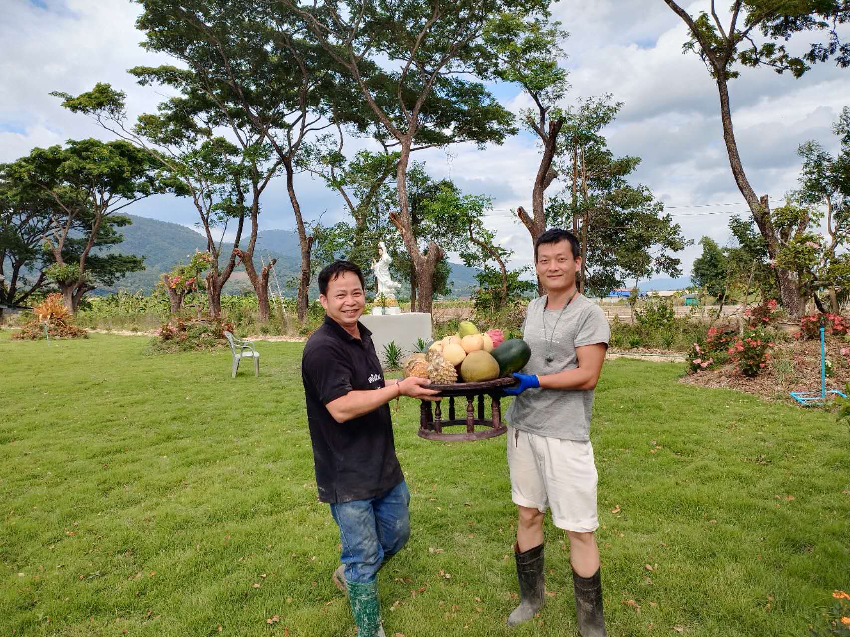 大氣哥一本正經的幽默,幹起活來耐力十足,細緻認真,第一次見識到,種果樹挖這麼大的坑(深一米、長寬一米五),先把腐爛的木頭和雜草填進坑底,一層土壤一層肥料,然後再一層em噴灑,為買來的榴槤樹和龍宮果樹做了厚厚的“三明治”,不僅感歎這兩棵樹真是好運氣,未來幾年的養料都備足了。