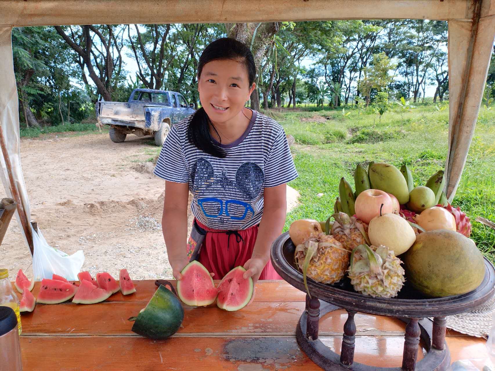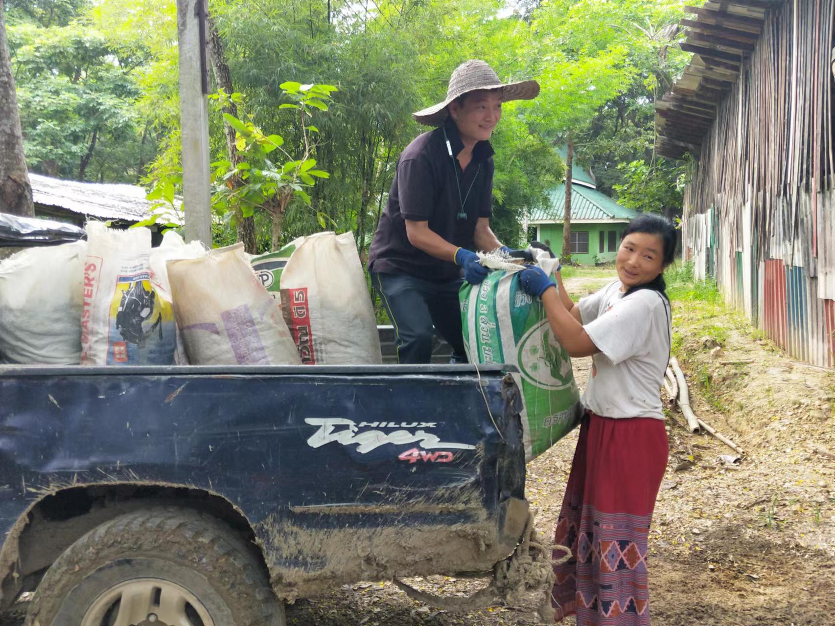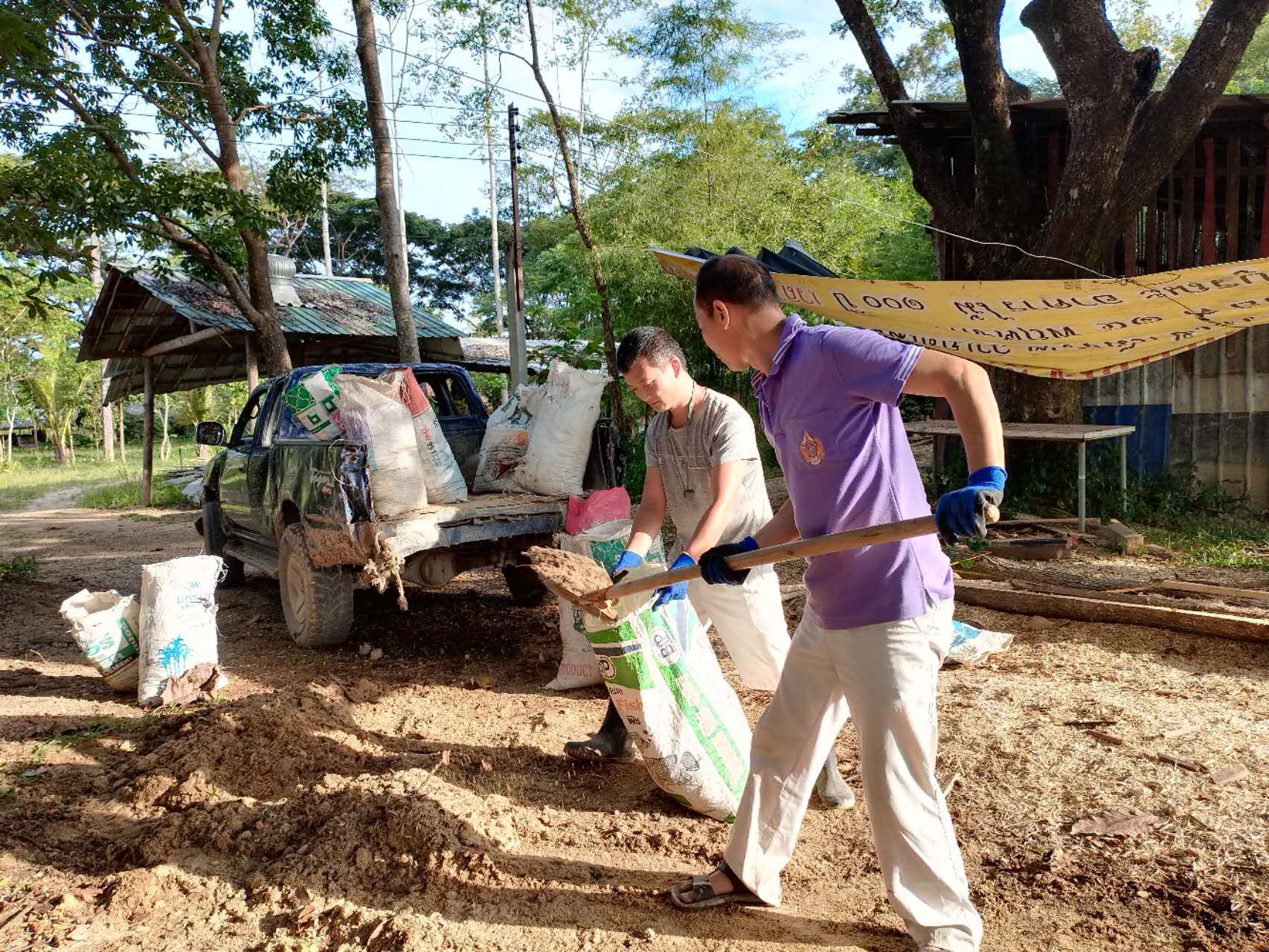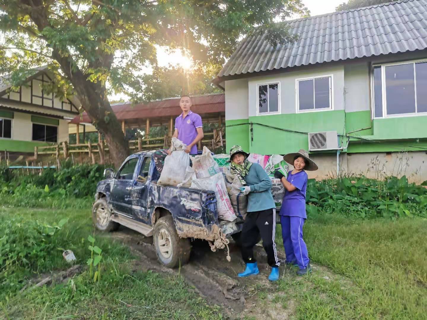 大氣哥一本正經的幽默,幹起活來耐力十足,細緻認真,第一次見識到,種果樹挖這麼大的坑(深一米、長寬一米五),先把腐爛的木頭和雜草填進坑底,一層土壤一層肥料,然後再一層em噴灑,為買來的榴槤樹和龍宮果樹做了厚厚的“三明治”,不僅感歎這兩棵樹真是好運氣,未來幾年的養料都備足了。