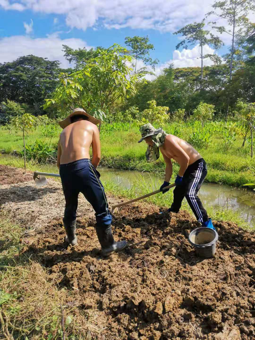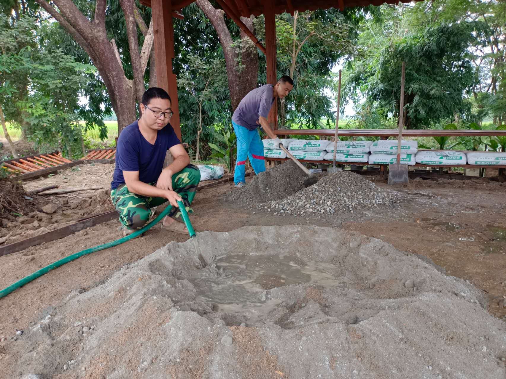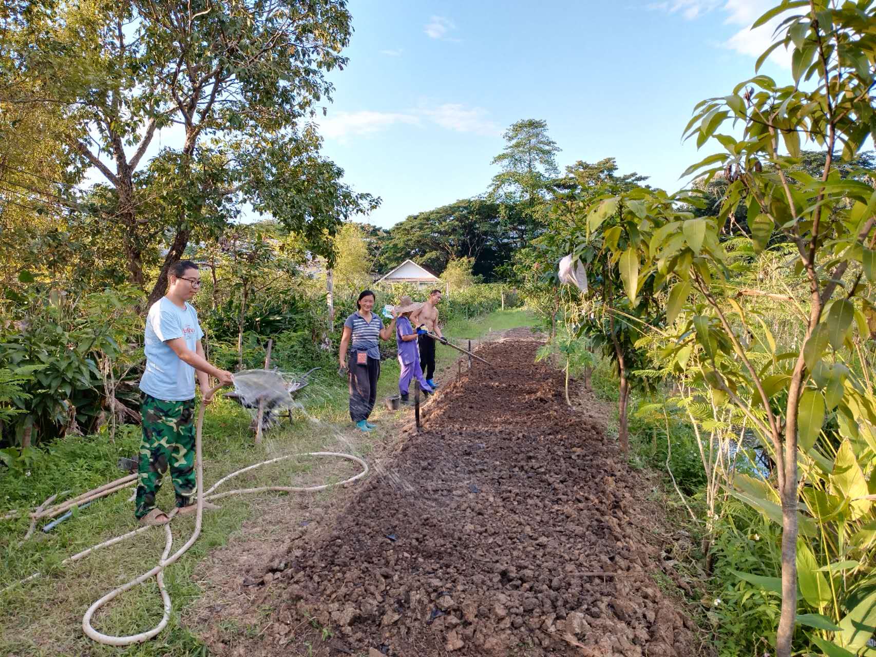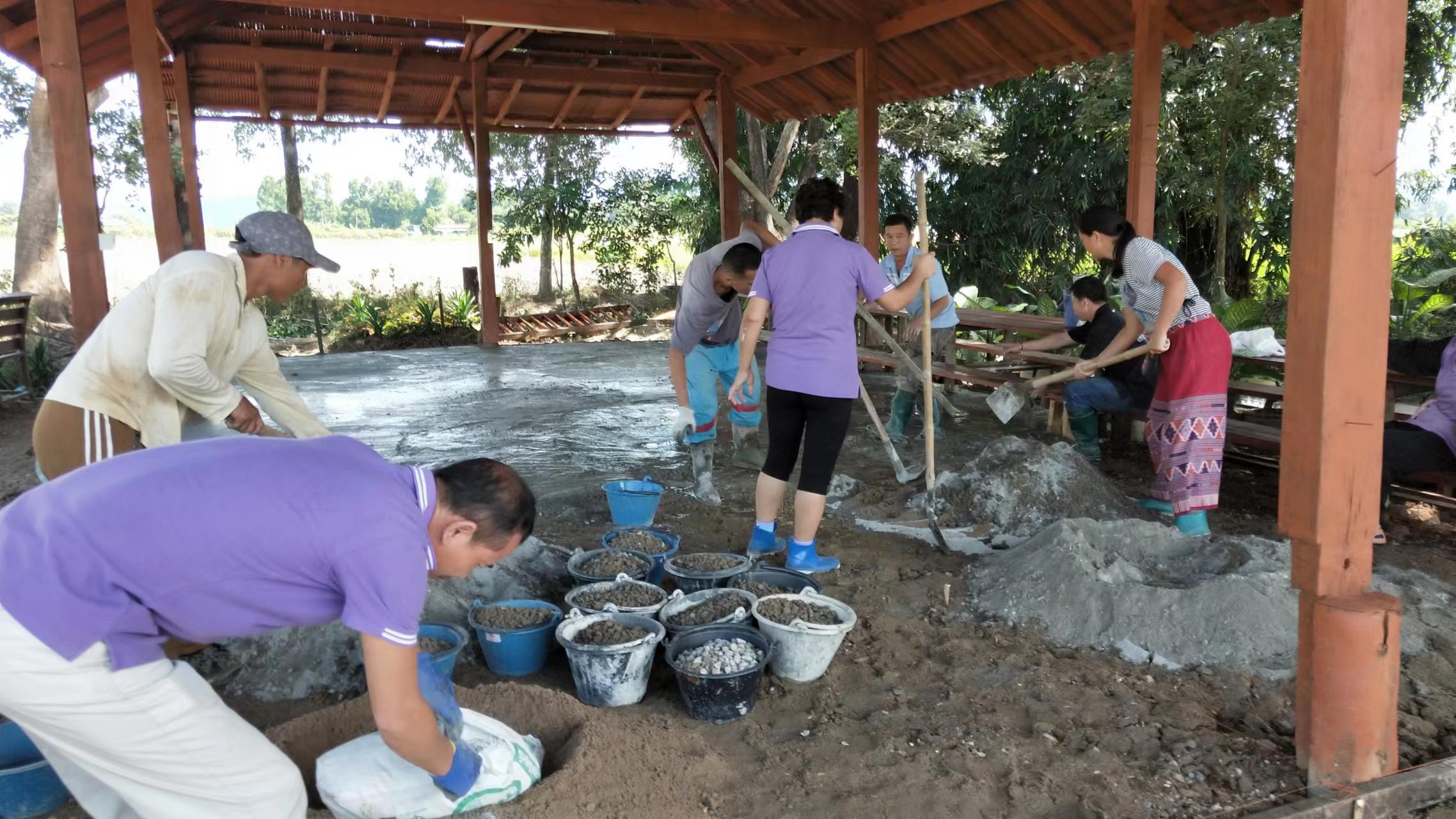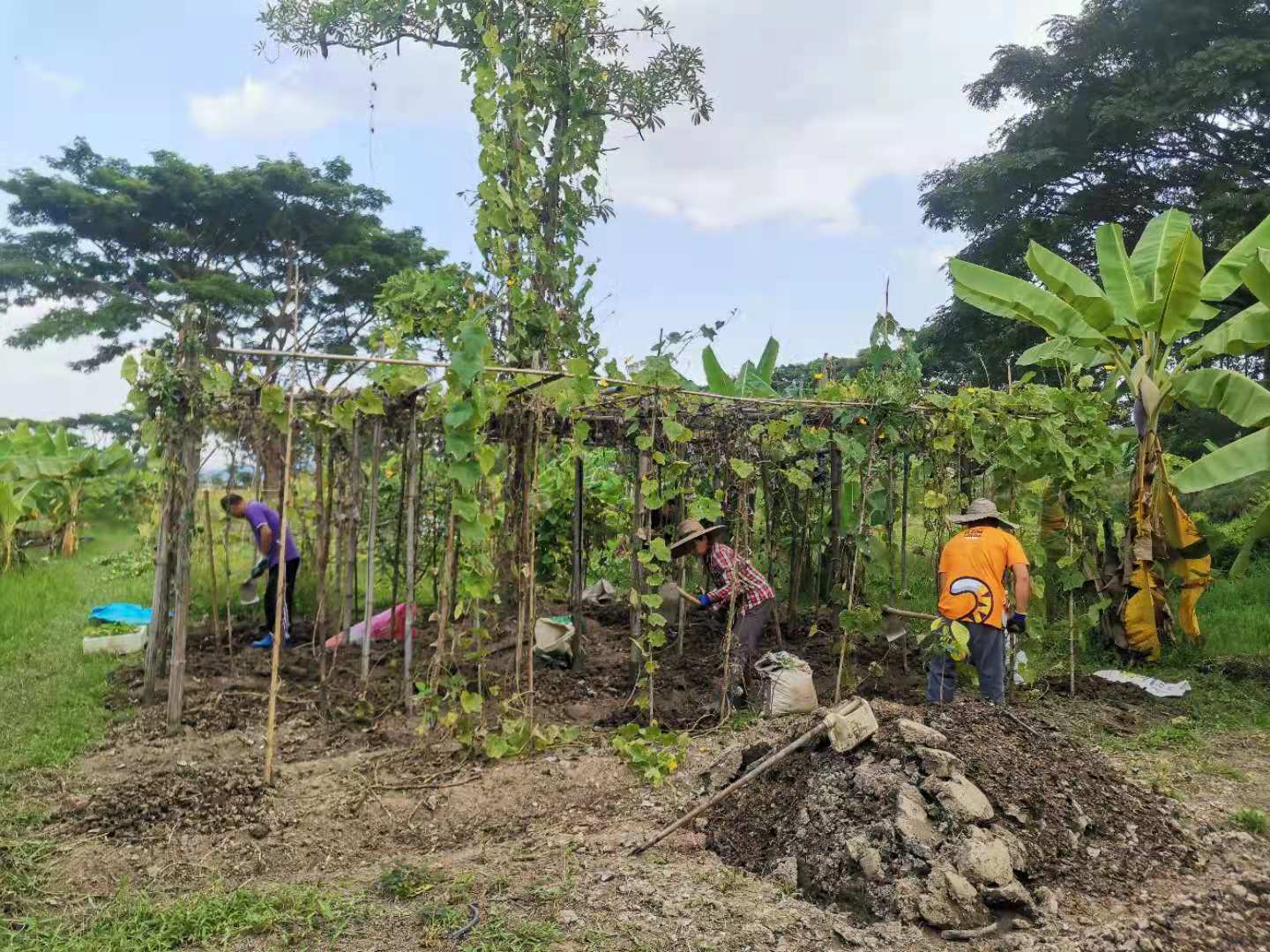 最近我們的主要工作是翻地改良土壤,人多力量大,之前倆人顧不上的,在大家的努力下,對百香果架下,絲瓜架下,育苗室旁的部分土地進行了改良,大家除草、運肥、翻土、拌肥、覆蓋,配合默契,乾的熱火朝天,希望把硬土塊黏土地變成鬆軟的良田。 龍炮安排我們在挖有一條條水渠的田地里自由種植,輝一割草開荒,我們刨坑,穴施拌肥,種上了三塊泰瓜苗。 龍炮新打造的景點旁蓋了一個新亭子,我們和工人們一起為亭子打水泥地面,龍炮親切的問候兩位剛來的仙親:在這裡生活得開不開心?