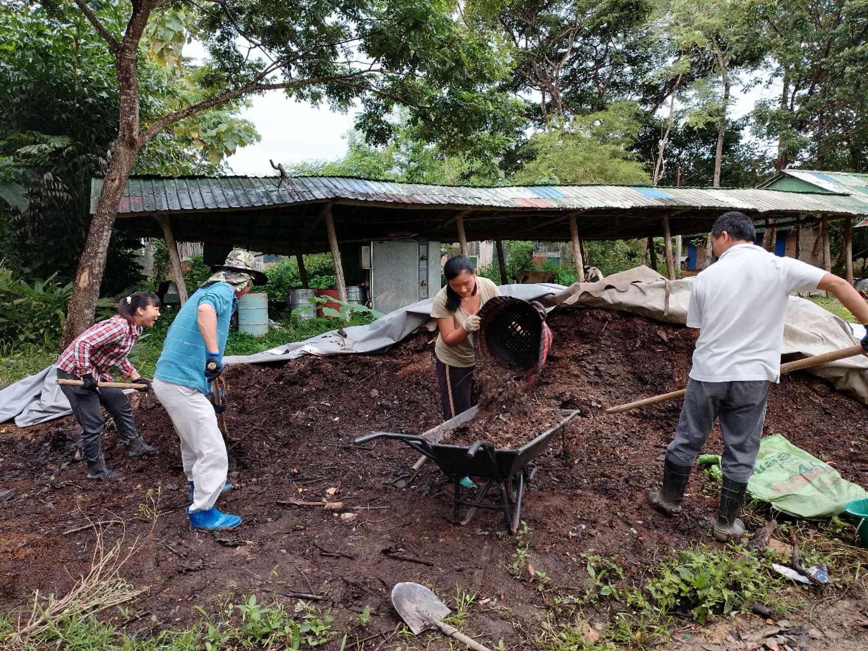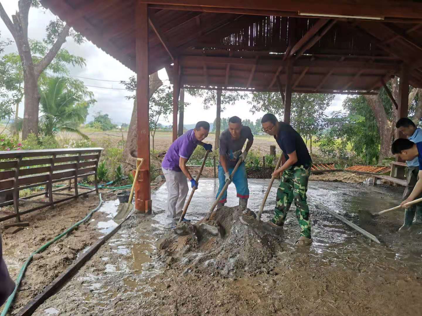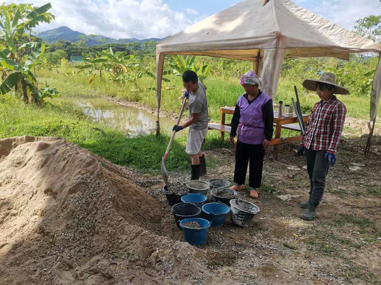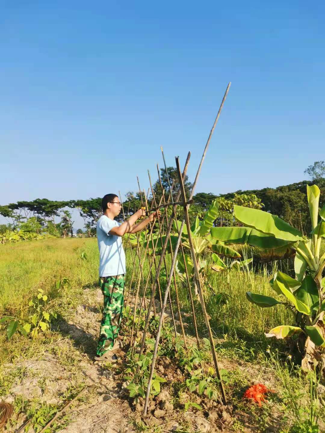 最近我們的主要工作是翻地改良土壤,人多力量大,之前倆人顧不上的,在大家的努力下,對百香果架下,絲瓜架下,育苗室旁的部分土地進行了改良,大家除草、運肥、翻土、拌肥、覆蓋,配合默契,乾的熱火朝天,希望把硬土塊黏土地變成鬆軟的良田。 龍炮安排我們在挖有一條條水渠的田地里自由種植,輝一割草開荒,我們刨坑,穴施拌肥,種上了三塊泰瓜苗。 龍炮新打造的景點旁蓋了一個新亭子,我們和工人們一起為亭子打水泥地面,龍炮親切的問候兩位剛來的仙親:在這裡生活得開不開心?