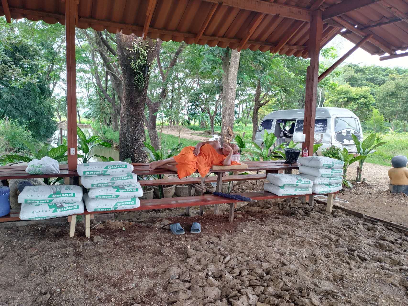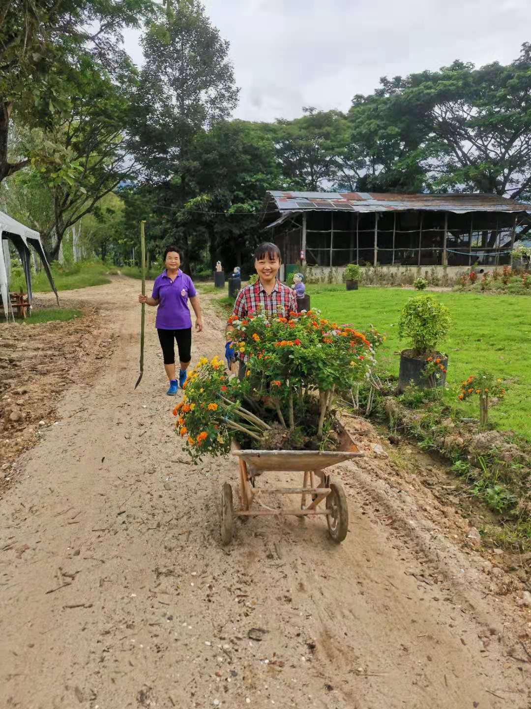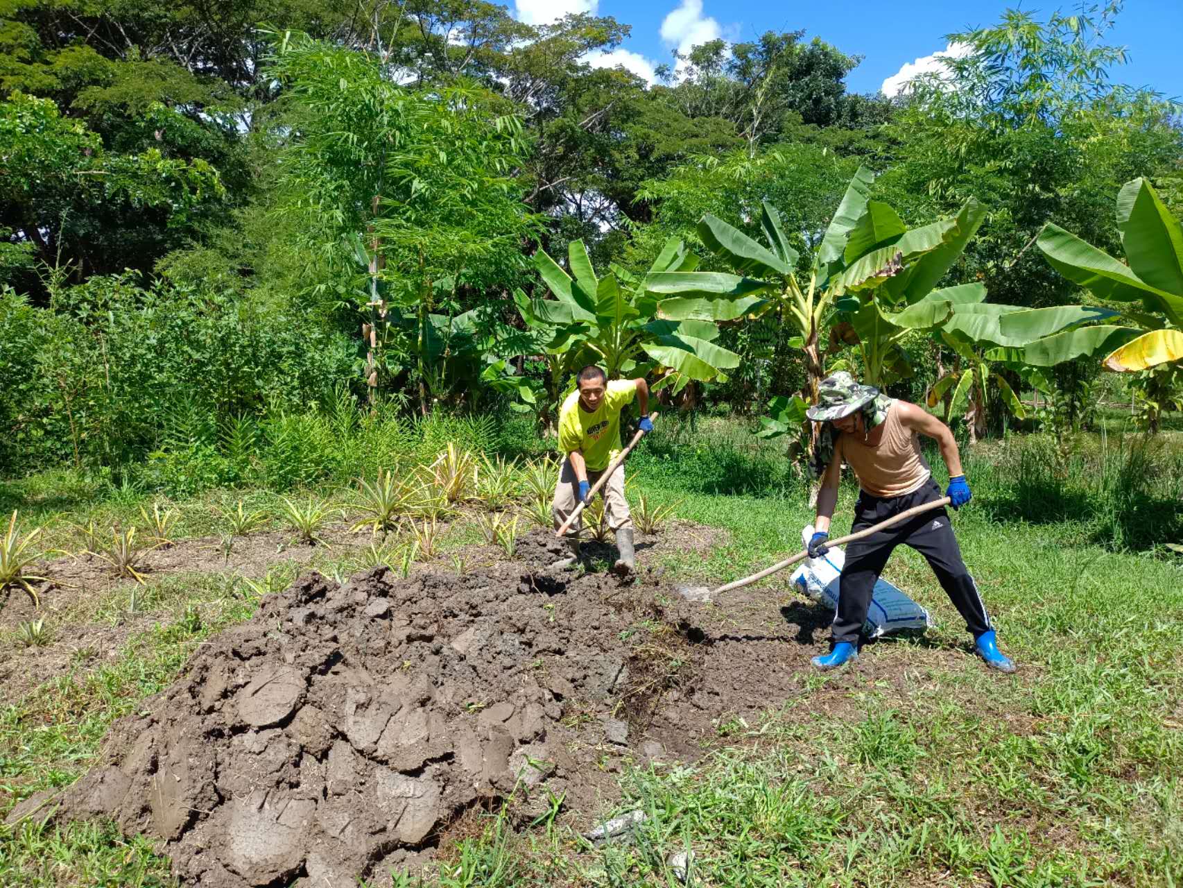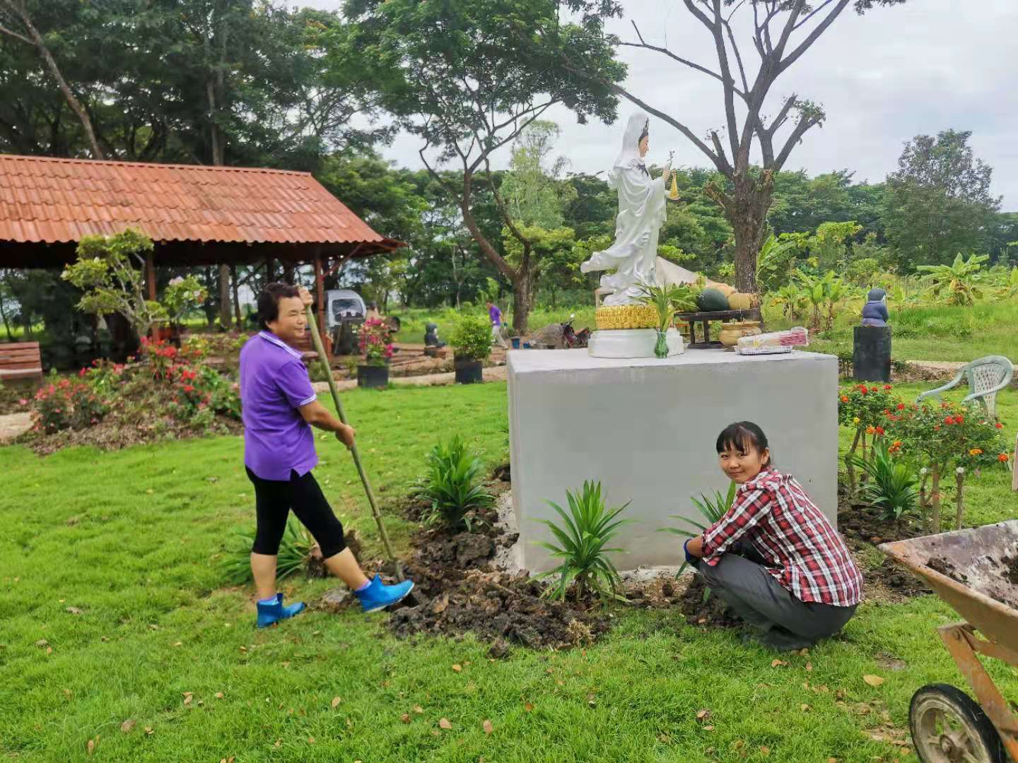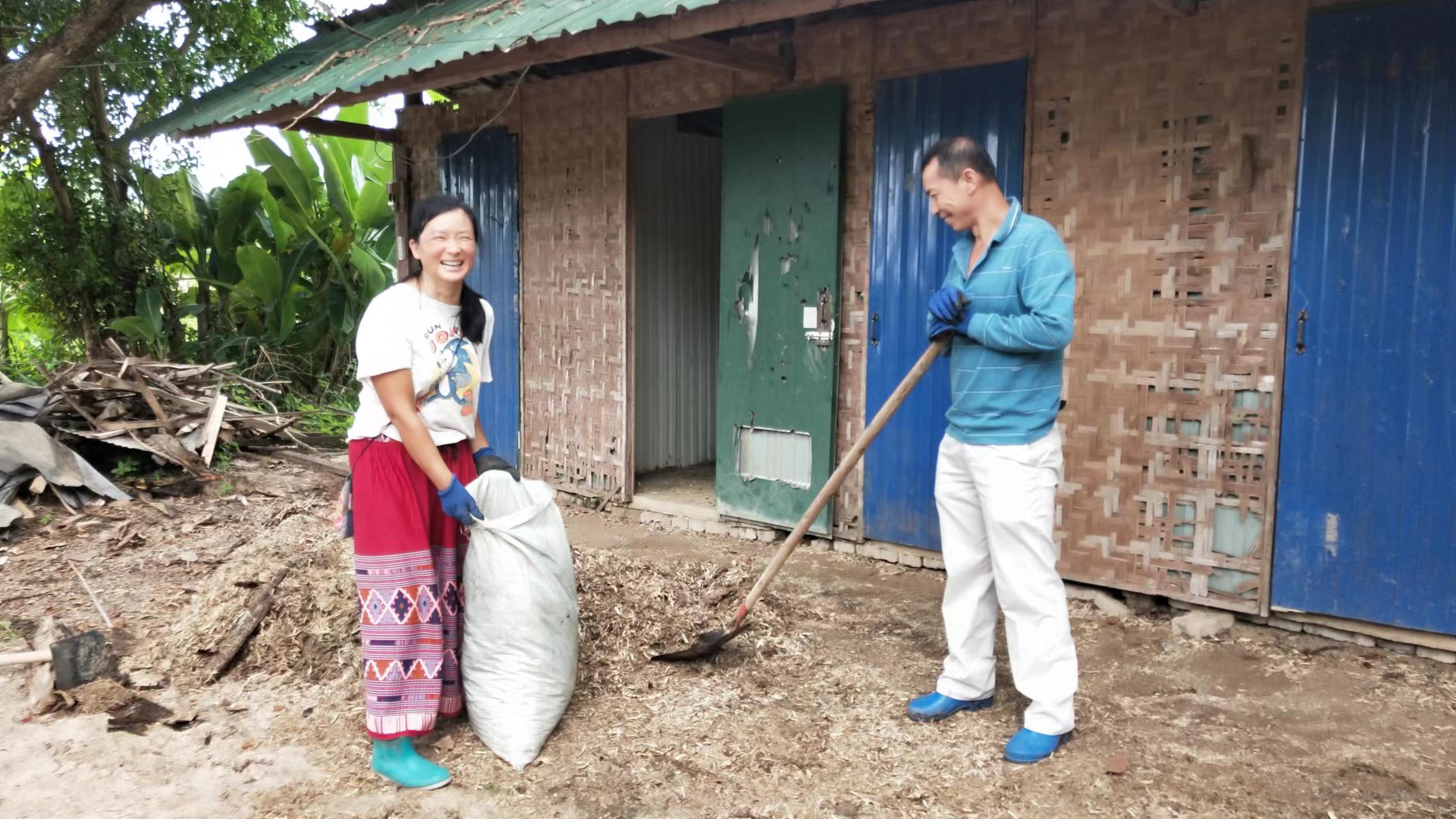 最近我們的主要工作是翻地改良土壤,人多力量大,之前倆人顧不上的,在大家的努力下,對百香果架下,絲瓜架下,育苗室旁的部分土地進行了改良,大家除草、運肥、翻土、拌肥、覆蓋,配合默契,乾的熱火朝天,希望把硬土塊黏土地變成鬆軟的良田。 龍炮安排我們在挖有一條條水渠的田地里自由種植,輝一割草開荒,我們刨坑,穴施拌肥,種上了三塊泰瓜苗。 龍炮新打造的景點旁蓋了一個新亭子,我們和工人們一起為亭子打水泥地面,龍炮親切的問候兩位剛來的仙親:在這裡生活得開不開心?