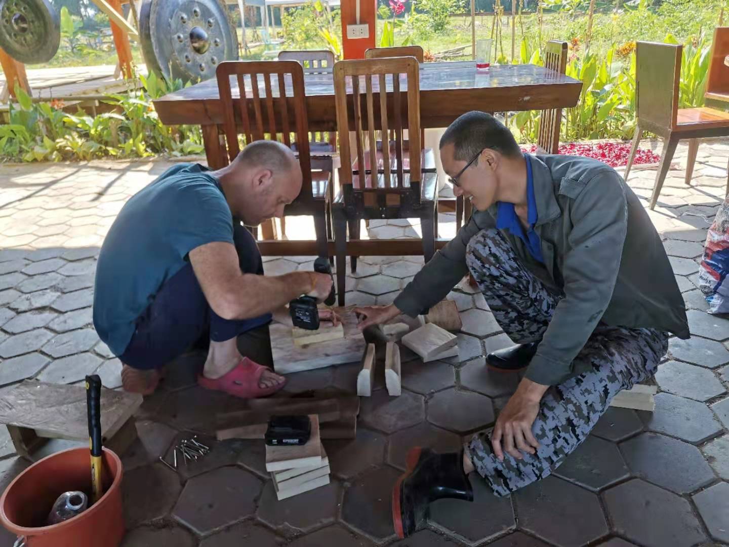 目前這邊擔子最重、壓力最大的人,感覺當屬Noi了。 除了仍然承受著小家庭程式帶來的摧折和無奈,服務主持及主持的客人也是一件很不容易的事,因為主持是一個很隨性且要求相當高的人,宴客計劃經常會隨機變動不說,服務稍不達標如意,廚師還會挨批。 Noi表示比起受命服務貴賓,他更喜歡服務那些工人或是我們的兄弟姐妹們。 他是這麼說,也是這麼做的。 平時,不但會為過往的工人或幹活兒的小和尚們主動準備飲料,要是為我們做個什麼特色飯菜的話,也總是會為工人們或是我們樓下輪椅上的媽媽多做出一份來。 不但大衛有什麼需要與主持或其他泰國人交流接洽時需要Noi幫忙,千姿和我如果提出有什麼需要外出採購或修理的東西,他也會樂意帶我們出去解決。 多才多藝的Noi不僅會專門抽出一天時間,去附近那家我們常去的有機農場為鄉親們義務理髮,也會隨機隨緣地帶著我們外出看日出賞花,在家圍爐夜話。 不但每天為我們準備著各色美食飲料,還會主動買來毛線,為我們編織起帽子和圍脖來。
