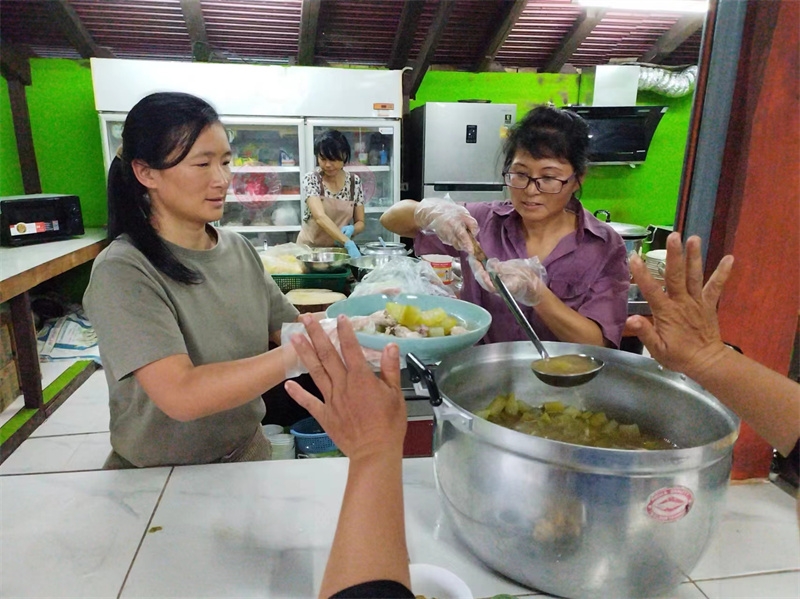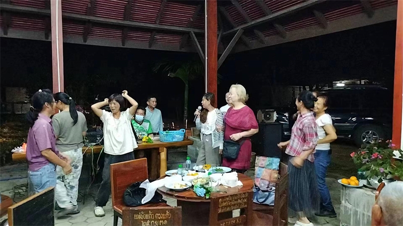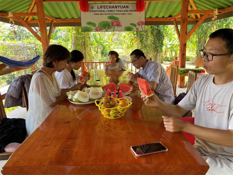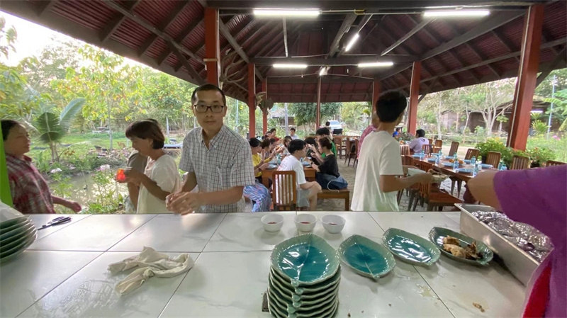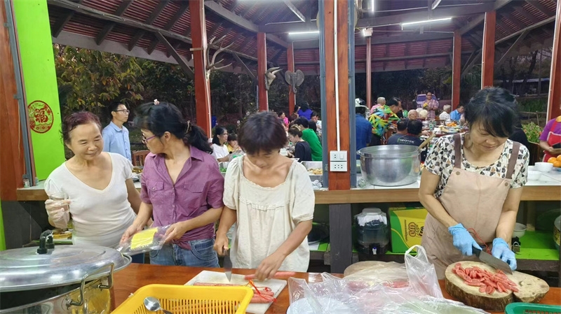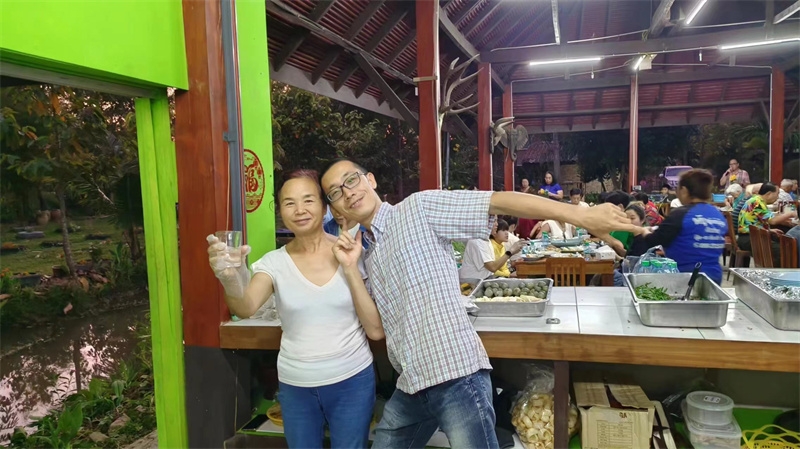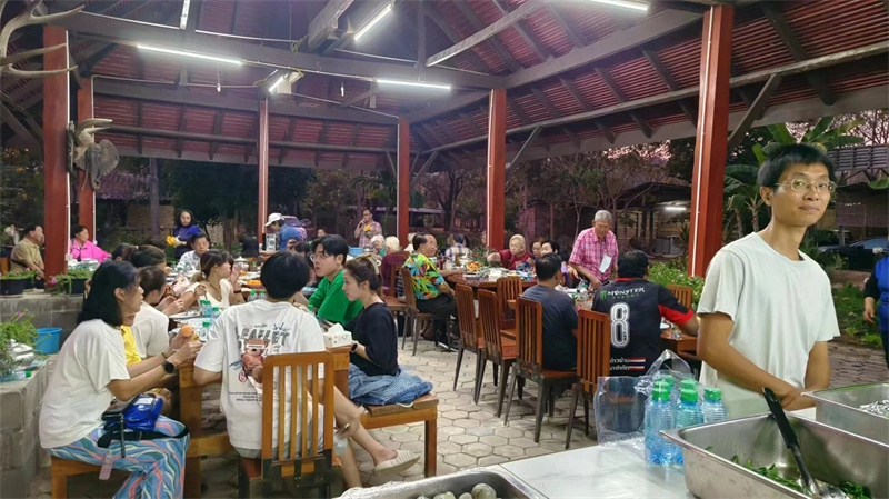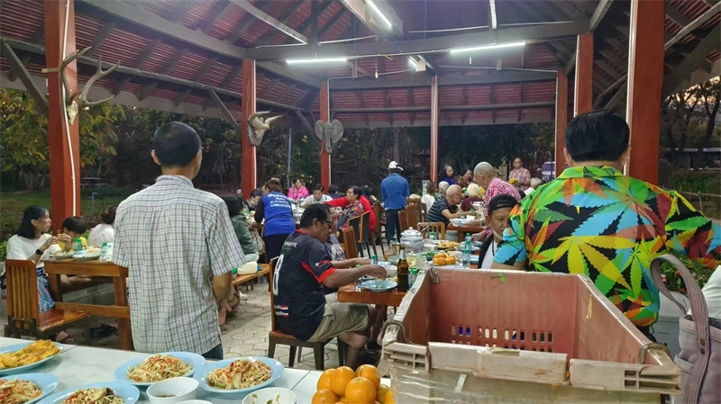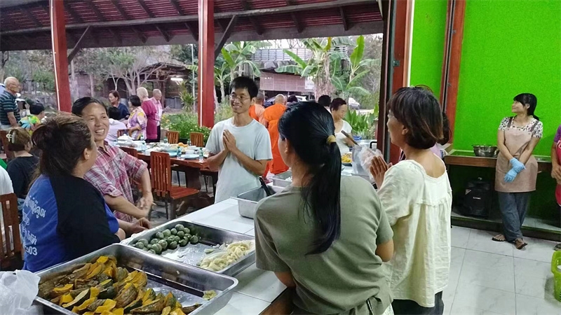 23號龍袍要接待50 位來自曼谷的客人在園子餐廳吃晚飯,提前告知我們打掃並整理餐廳。 宴客那天傍晚,寺廟的廚師們把烹飪好的飯菜運送到園子餐廳,兄弟姐妹們在餐廳説明廚師一起服務客人:擺碗筷,配菜裝盤,上水上菜,以及結束后的洗碗清潔工作,持續了近5個小時,大家一直洋溢著歡快和熱情,每一位像是訓練有素的一流服務員,手腳麻利,配合得默契絲滑,沒有一絲疲倦和懈怠,在歡快高漲的氣氛下,大家還和泰國客人們一起狂歡跳起了舞蹈, 心裡不由的為勤奮服務樂觀浪漫的兄弟姐妹們感到讚歎和自豪。