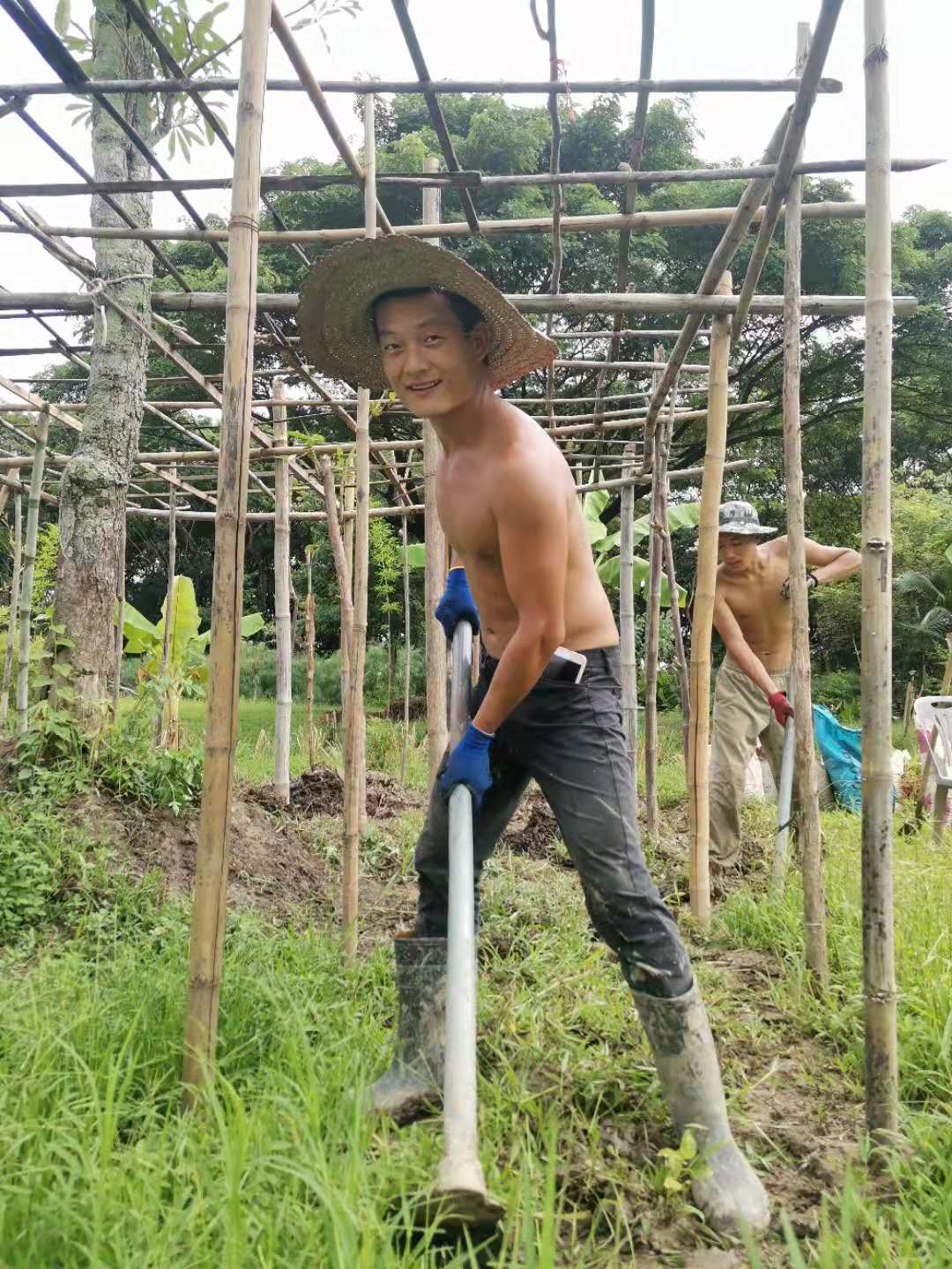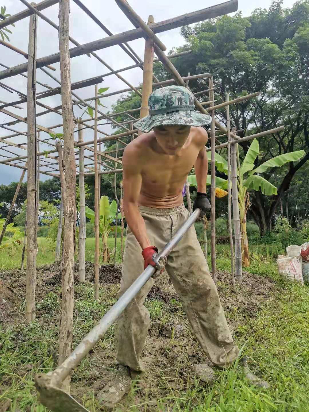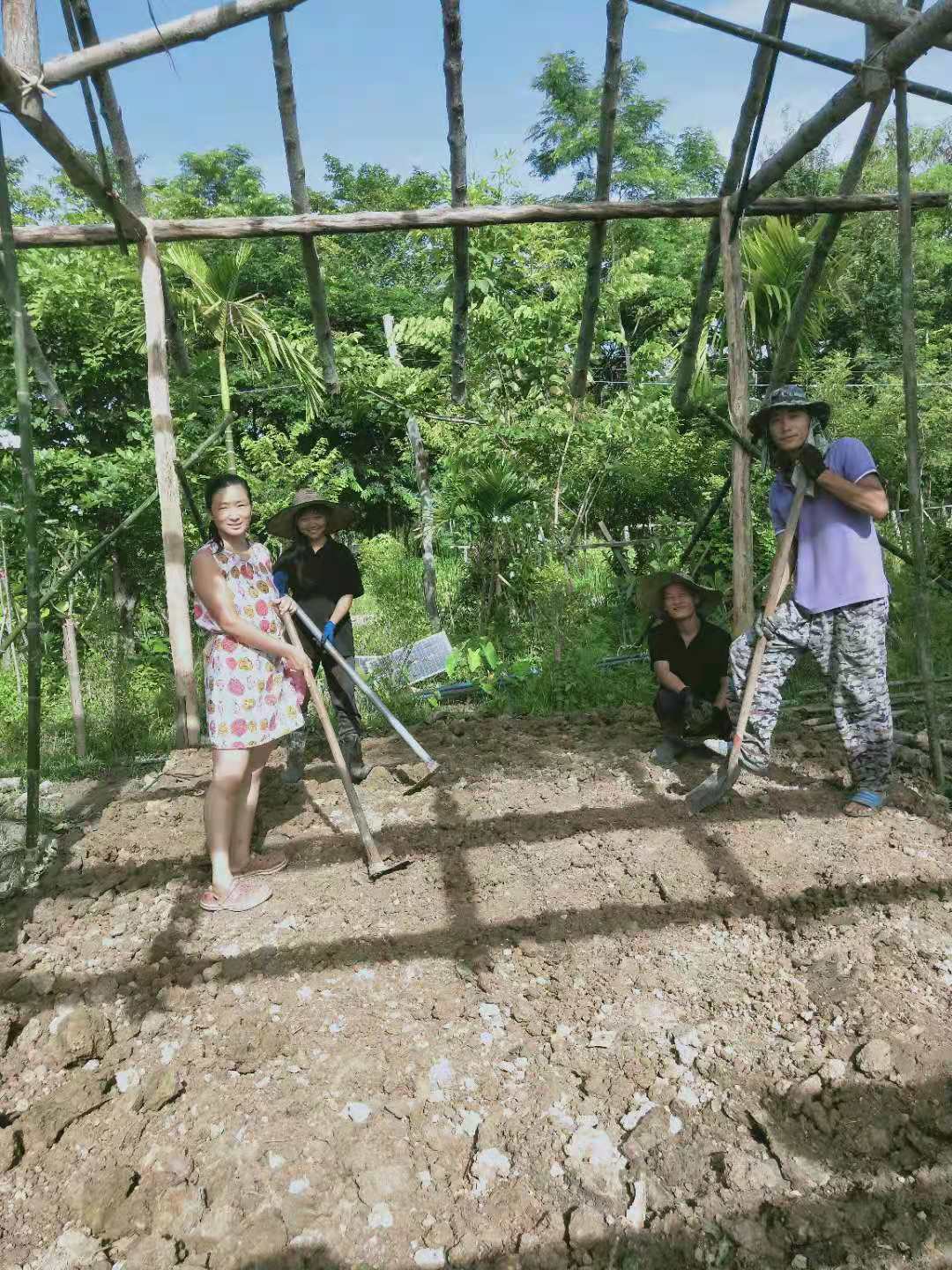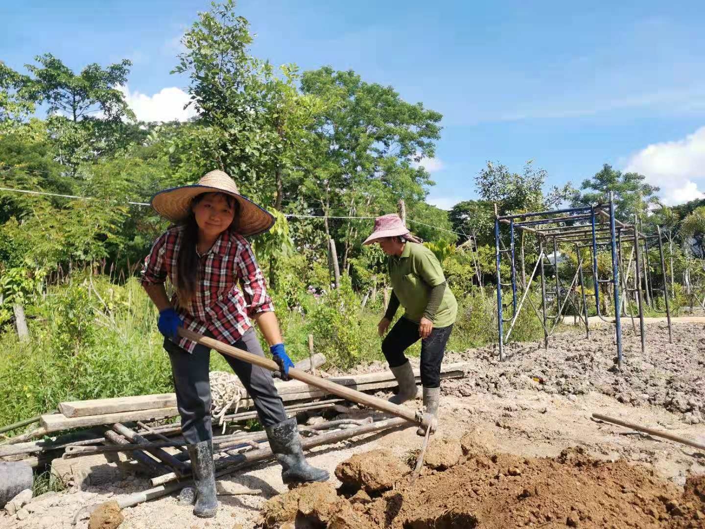 這些天,龍炮領著工人們繼續蓋房子,四間獨立臥室的框架已完成,屋頂上瓦也接近完工,現在又開始建一棟二層樓房子。 蓋房子需要人手,輝一說種菜我們先緩緩,多花些時間幫龍炮把房子建起來。 可能因為我們幹活效率高,龍炮也特別喜歡叫我們去幫忙,搬瓦片,修路平路,卸土把房子裡外的地勢墊高,幹著簡單的體力活,大家大汗淋漓,歡聲笑語不斷。 歡心有時候會幫著Pi露種花種樹,倆人脾氣相投,配合得甚是默契。