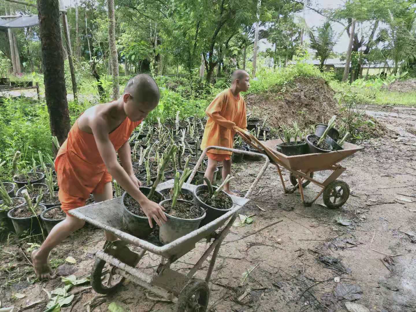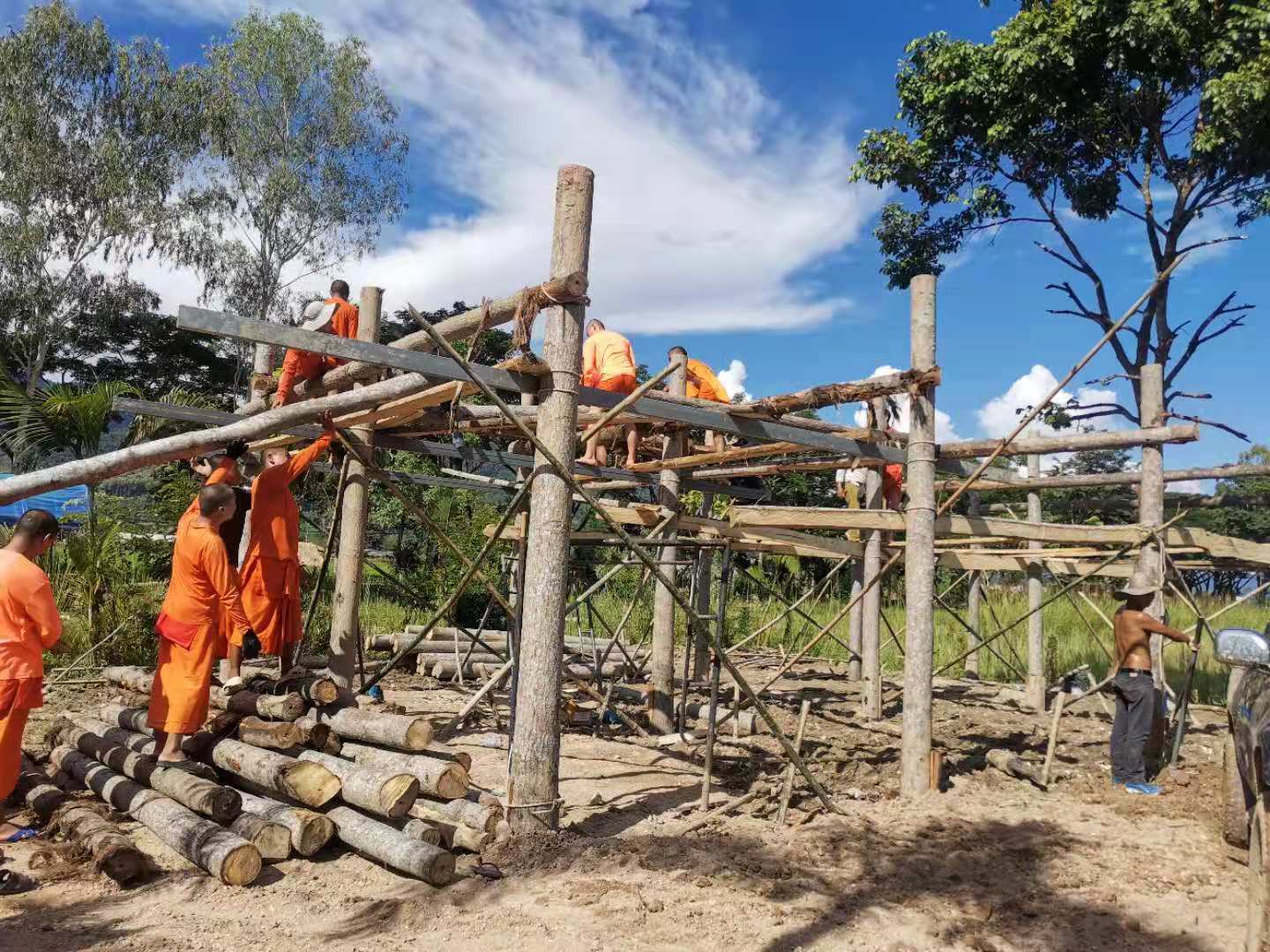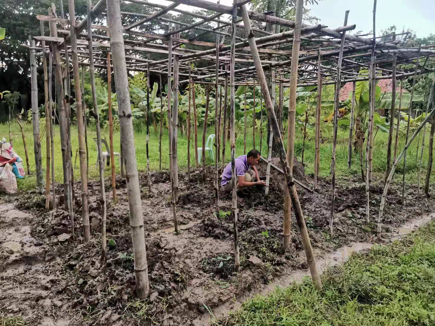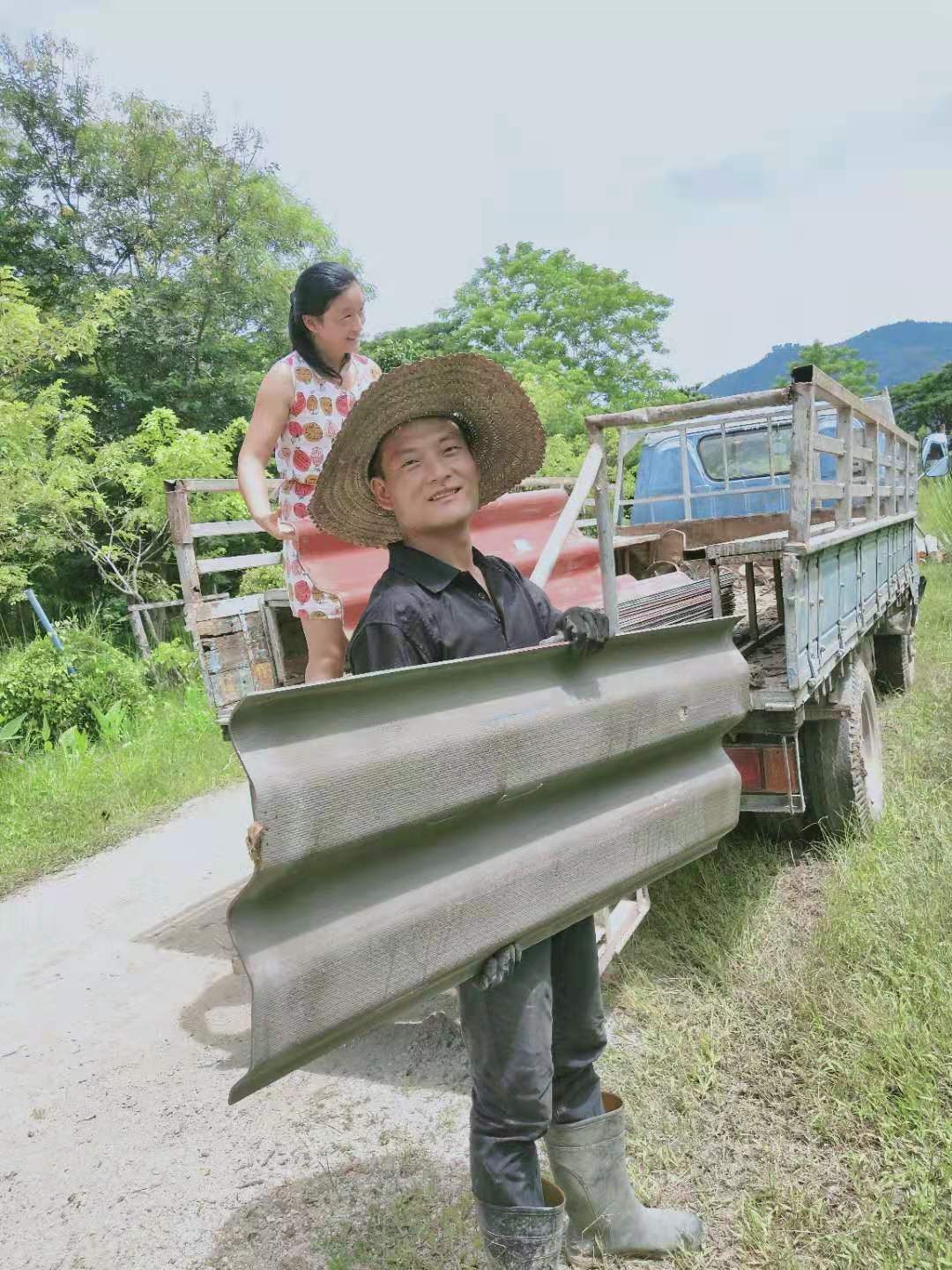 這些天,龍炮領著工人們繼續蓋房子,四間獨立臥室的框架已完成,屋頂上瓦也接近完工,現在又開始建一棟二層樓房子。 蓋房子需要人手,輝一說種菜我們先緩緩,多花些時間幫龍炮把房子建起來。 可能因為我們幹活效率高,龍炮也特別喜歡叫我們去幫忙,搬瓦片,修路平路,卸土把房子裡外的地勢墊高,幹著簡單的體力活,大家大汗淋漓,歡聲笑語不斷。 歡心有時候會幫著Pi露種花種樹,倆人脾氣相投,配合得甚是默契。
