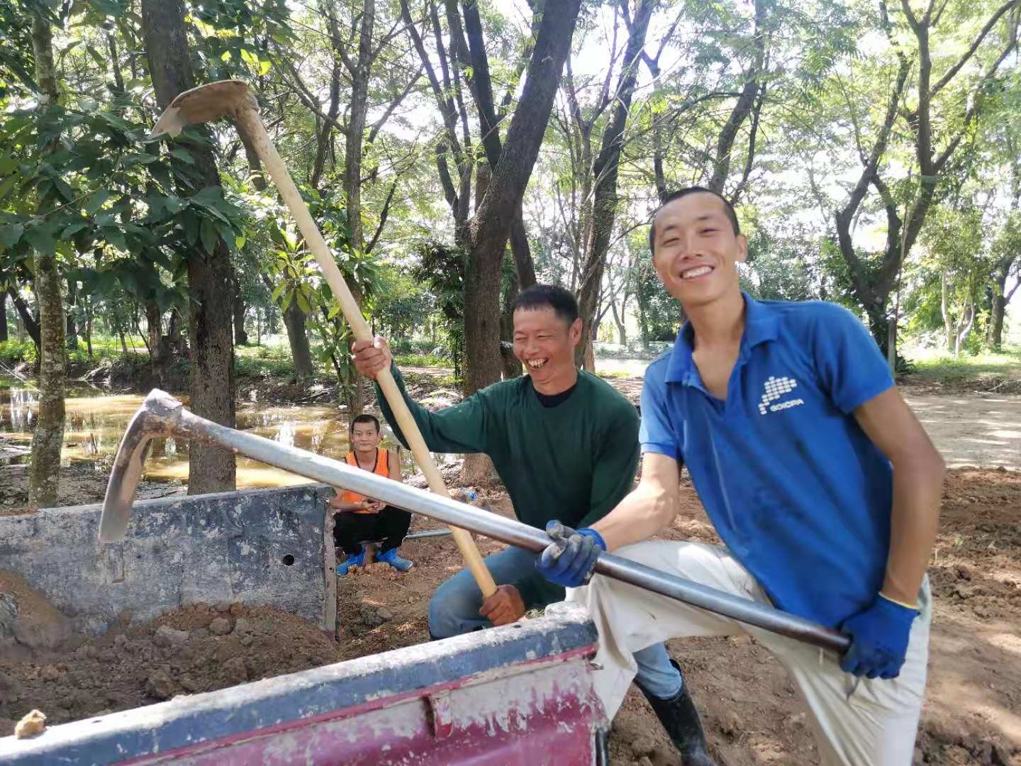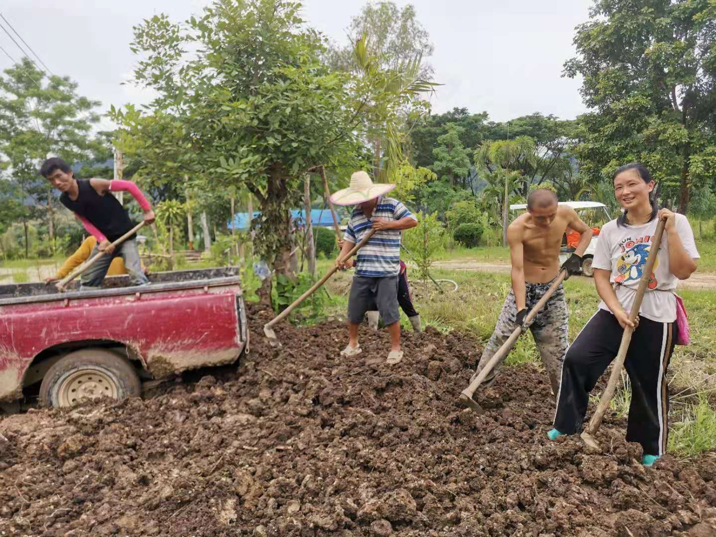 不需要幫忙時,仰樂輝一歡心去撿牛糞,摟草,堆肥,整地,移菜苗,千姿有時也和他們一起。 這裡的土壤是黏土,之前好幾位師傅嘗試種菜都未成功。 關於黏土改良,之前仰樂與千姿探討過好多次,也向有機種植專家Gei學到了一種改良方法。 最後仰樂決定,廚房前的小片菜地上,使用Gei教的方法,把黏土鏟碎和大量有機質拌勻,覆蓋稻草,噴灑液體肥和em液。 七天后便可在土壤上種植蔬菜,讓土壤慢慢變鬆軟。 廚房後的大片菜地,仰樂打算用穴施的辦法,在木料加工廠的地面上收集鬆軟的土壤,再與有機質和有機肥拌勻,拉運到菜地里,在準備種菜苗的位置把黏土刨出,用拌好的土替換掉原來的黏土。 不管用哪種方法,黏土問題不是一時半會可以解決的,需要有耐心,沉下心來,讓時間見證大家的努力!
