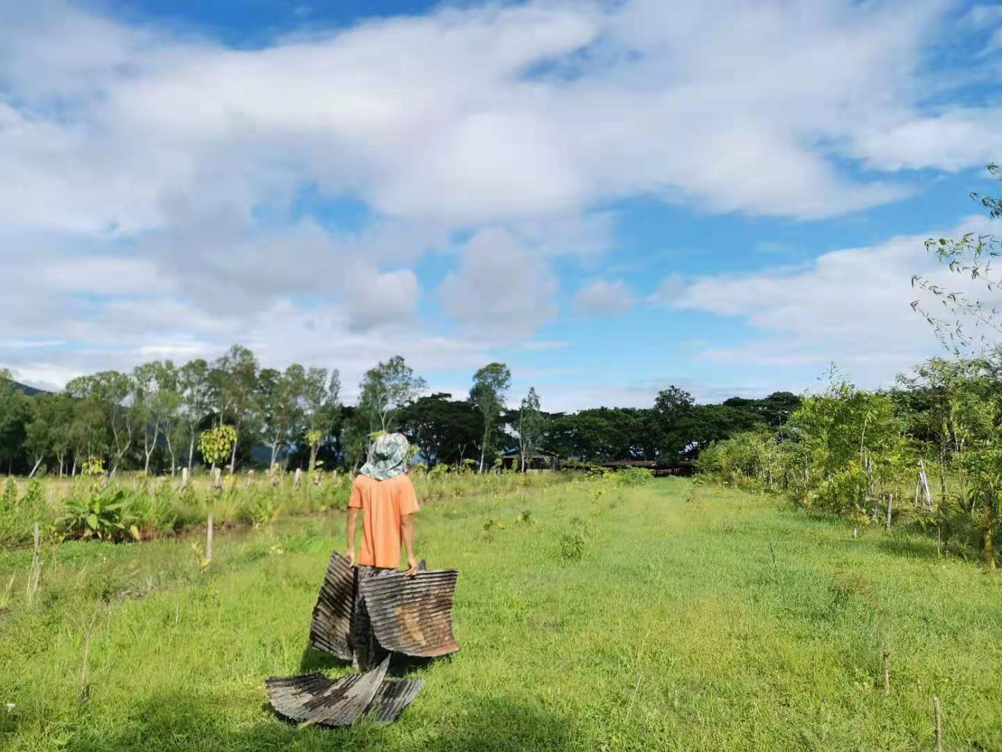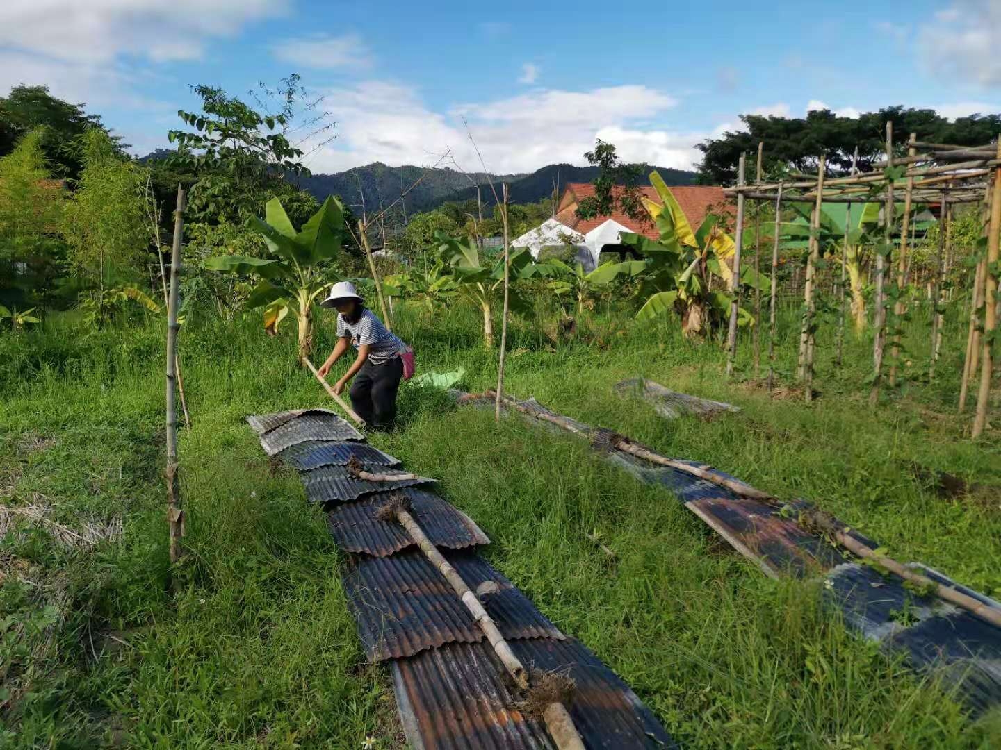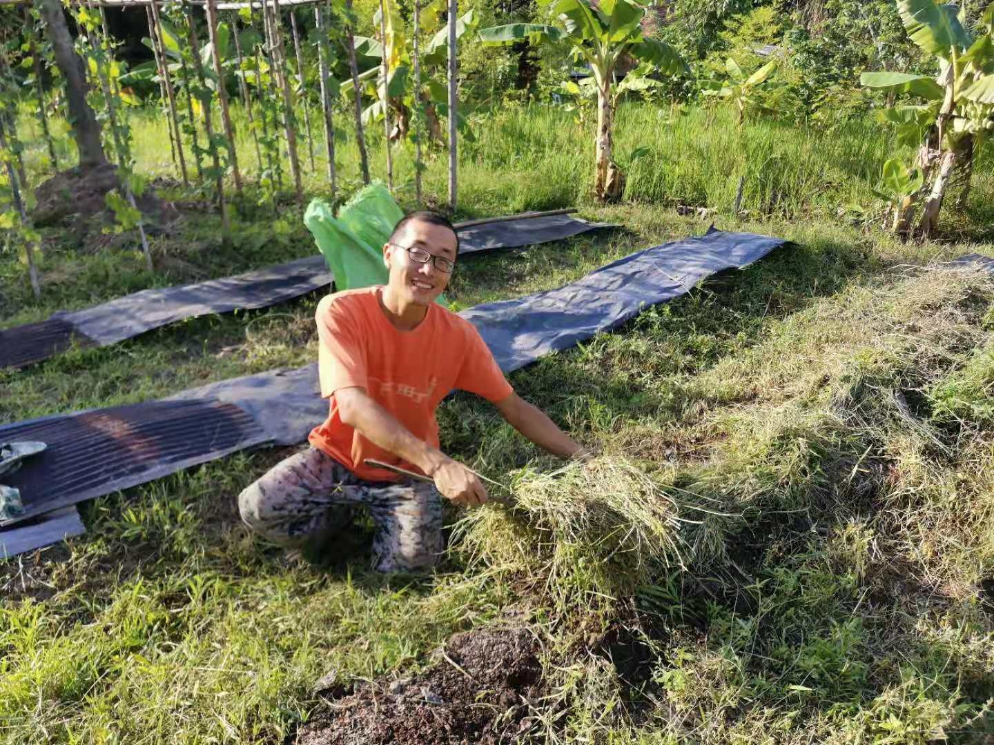 仰樂參照網上別人的種植經驗又加上自己的實地實踐摸索,開墾長滿雜草的荒地時,把草割了直接鋪在原地,再加上一些牛糞和沒漚好的樹葉肥,在地裡直接做堆肥。 無意中又發現,被不透氣的雨布遮蓋過的土地上不僅不長草還能很快把下面的有機質分解成團粒結構的土壤,於是我們搬來廢棄的鐵皮瓦片,給地里的堆肥做了覆蓋,等下面的有機質漚好,就可以在上面種菜了。 這個方法省了運草運肥翻地等好幾個步驟,符合最小阻力原則,仰樂說我們只有兩個人,力氣就這麼多,要多動腦子才行。