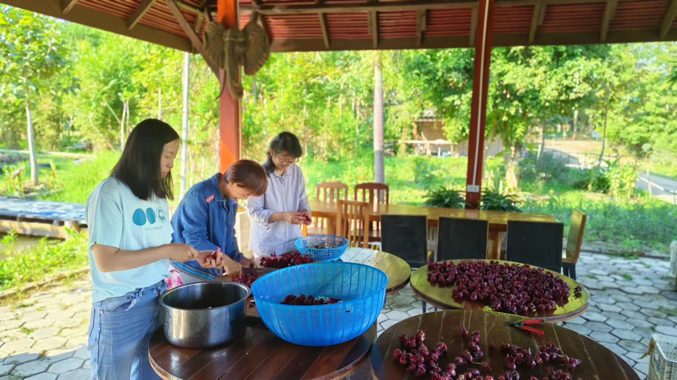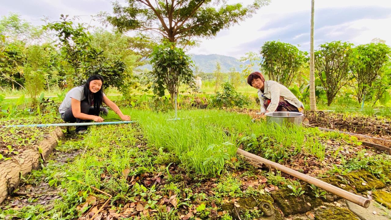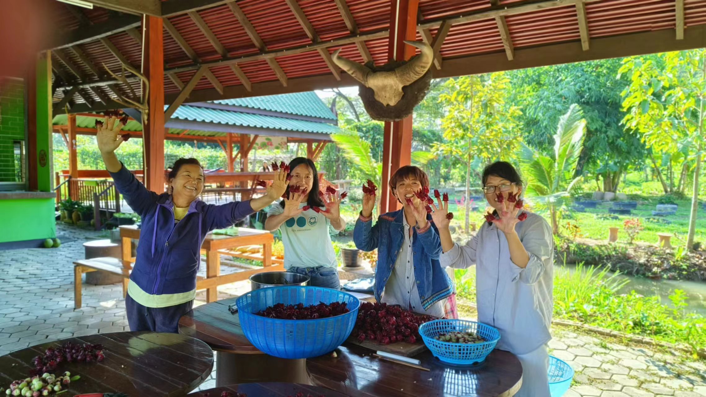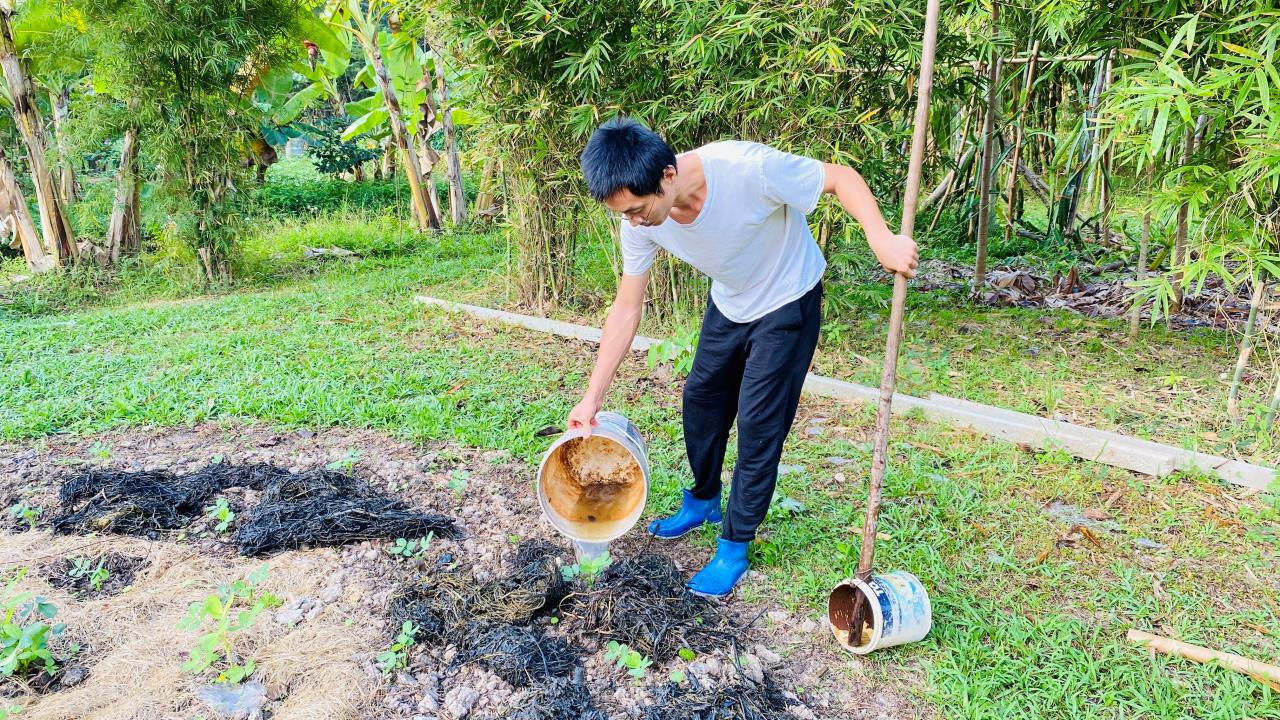 回來後見到龍袍格外想念親切,大佛給我們送了方便麵和各種零食和生活用品,幾位朱拉隆功大學的老師學生跟龍袍來園子看土地,他們打算以後在這裡實驗種植水稻。 龍袍讓拖拉機耕出了更多可以種菜的土地,我們今天一起去拉牛糞,仰樂準備在大片地里穴施拌牛糞種上南瓜冬瓜絲瓜苗。 逸仙仰樂收拾餐廳附近堆積閑置的木頭竹子,拉去芒果園給大氣做生態種植床用,也把功德園生活環境清理得更加乾淨整潔,曲丹在慧光教練的説明下拿到了泰國駕照,泰國家園又多了一位司機。 玉林姐姐用洛神花研發出了果丹皮,味道口感都不錯,適合當小零食吃。