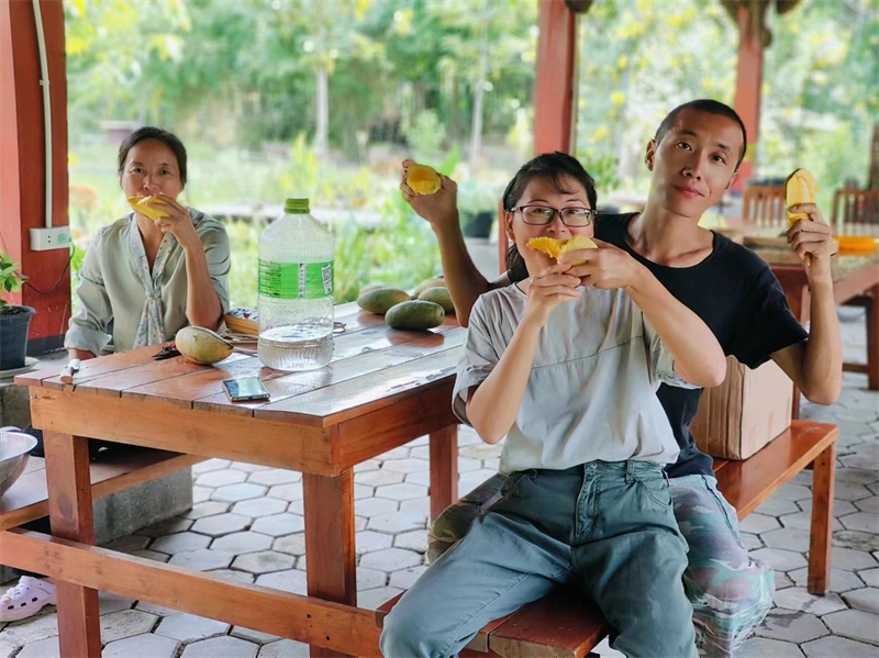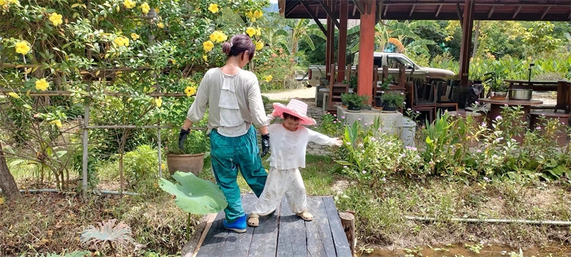 登登從芒果園來到功德園,小傢伙的到來給我們的生活增添了很多歡樂。 泰國家園現在暫時沒有合適的親人專門負責照看孩子,所以登登晚上跟柔美媽媽或者曲丹爸爸睡,白天由大家共同靈活照看,在室外勞作的親人們誰有空閒,誰便帶他邊勞作邊玩耍。 仰樂爸爸對孩子的教育非常上心,耐心教孩子在稱呼上要懂禮貌,好好吃飯,培養節約糧食的意識。 為了給孩子創造一個良好的學習氛圍,更是每天帶領大家分享學習日常英語,還舉辦了詩詞大會,讓孩子從小就接受國際氛圍和仙文化的薰陶。 大家多了一位玩伴道友,把登登當成一冠小小禪院草,以禪院理念對待相處,尊重他愛護他,曉之以理動之以情,每一位親人覺得這個孩子非常懂事可愛有靈性,一般只要大人做得恰當合適,他是不會給大家添麻煩的。