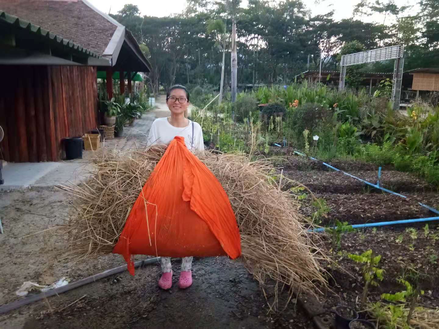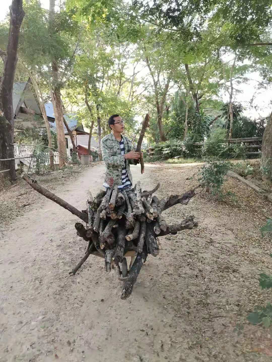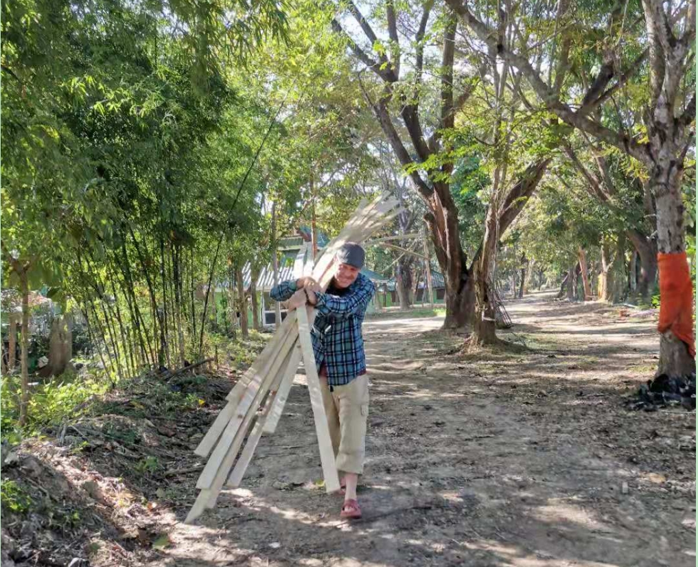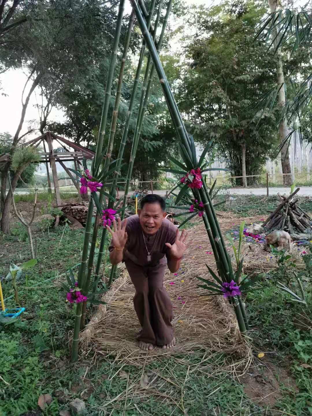 其他時間日常照管菜地,移苗澆水施肥,仰樂收集了一些竹竿,準備為廚房後面大片菜地的攀爬類蔬菜做架子。 餐廳前的菜地上,我們一開始使用的肥是這裡師傅快速做成的,樹葉和木屑等有機質基本沒有分解,這種肥的主要作用是與黏土攪拌均勻疏鬆土質,但並沒有多少肥力。 所以除了使用液肥和自己儲存的尿液,仰樂還拉牛糞稻草繼續做堆肥,希望用有機的方法讓這裡貧瘠的黏土變得疏鬆有肥力。 期間Doiskate的阿讚素貼來過一次,關心詢問我們在這的生活和工作是否開心如意,並安慰我們,廚房前的新土需要時間改良,不要著急。 他還給我們帶來了一位教泰餐的美女老師,對我們這裡感興趣來這參觀一下,忘了給他們拍照了。