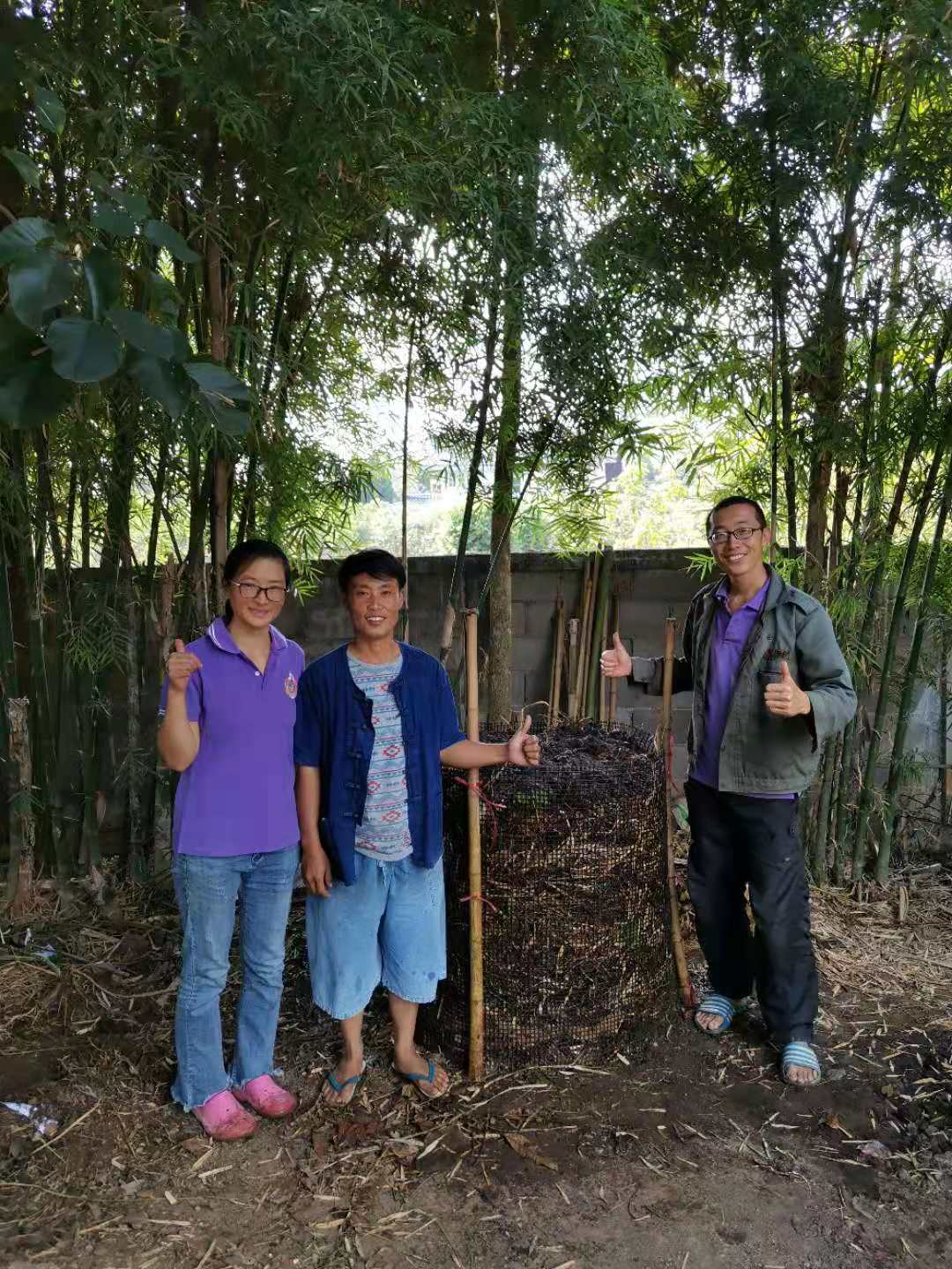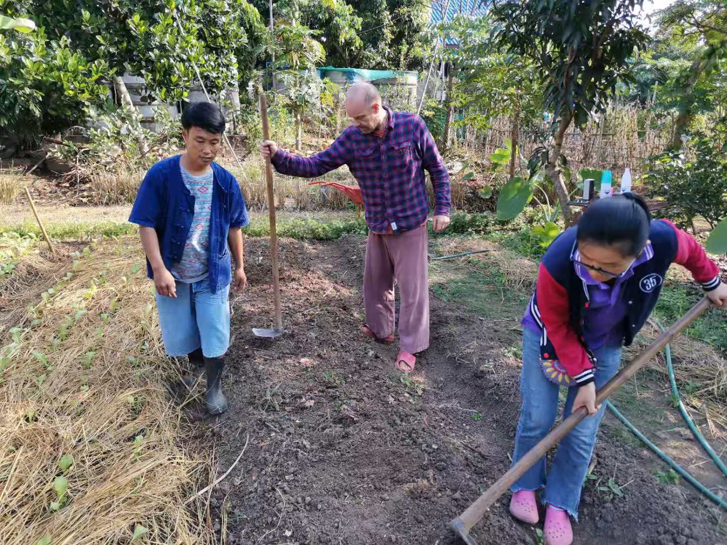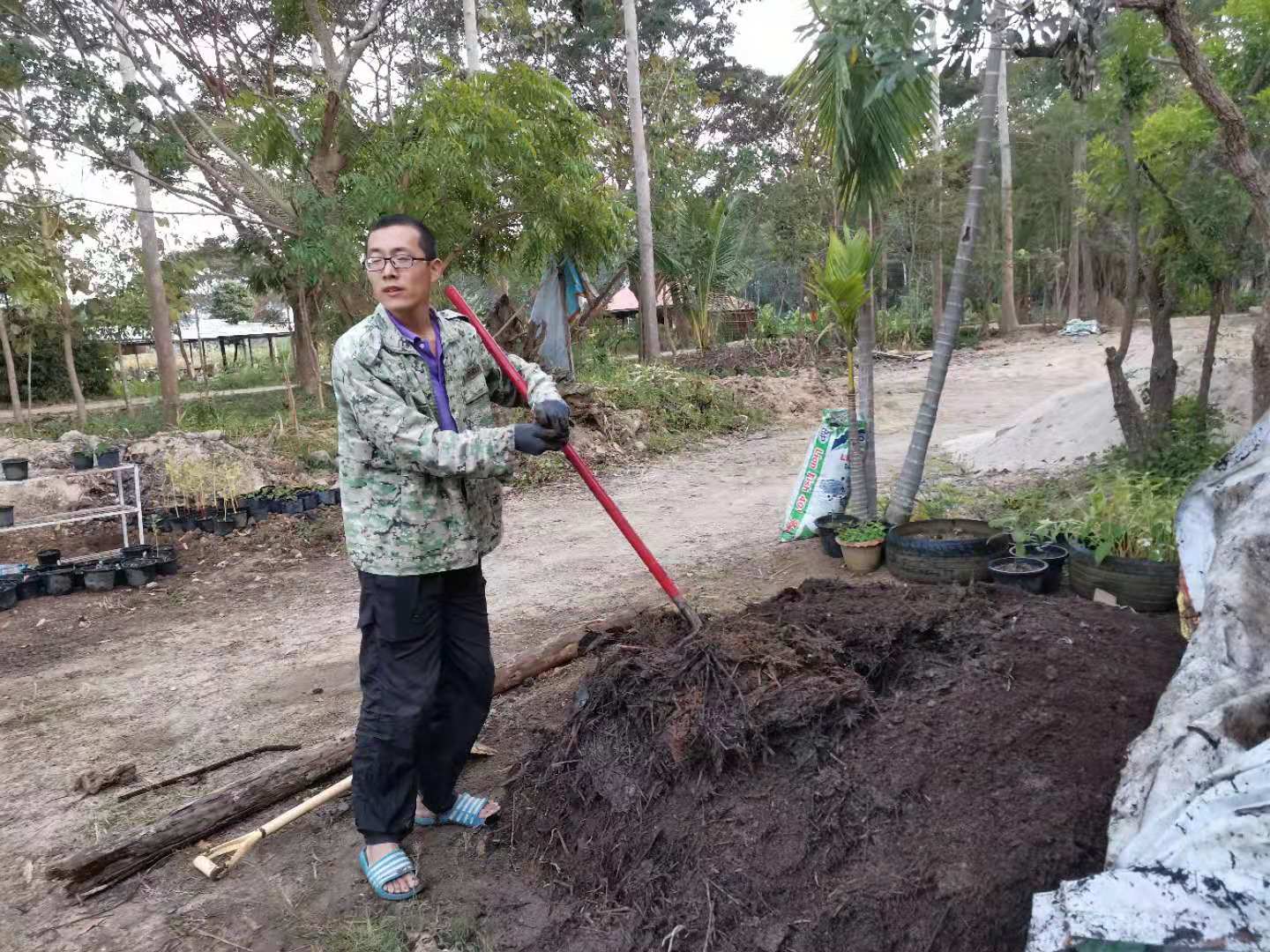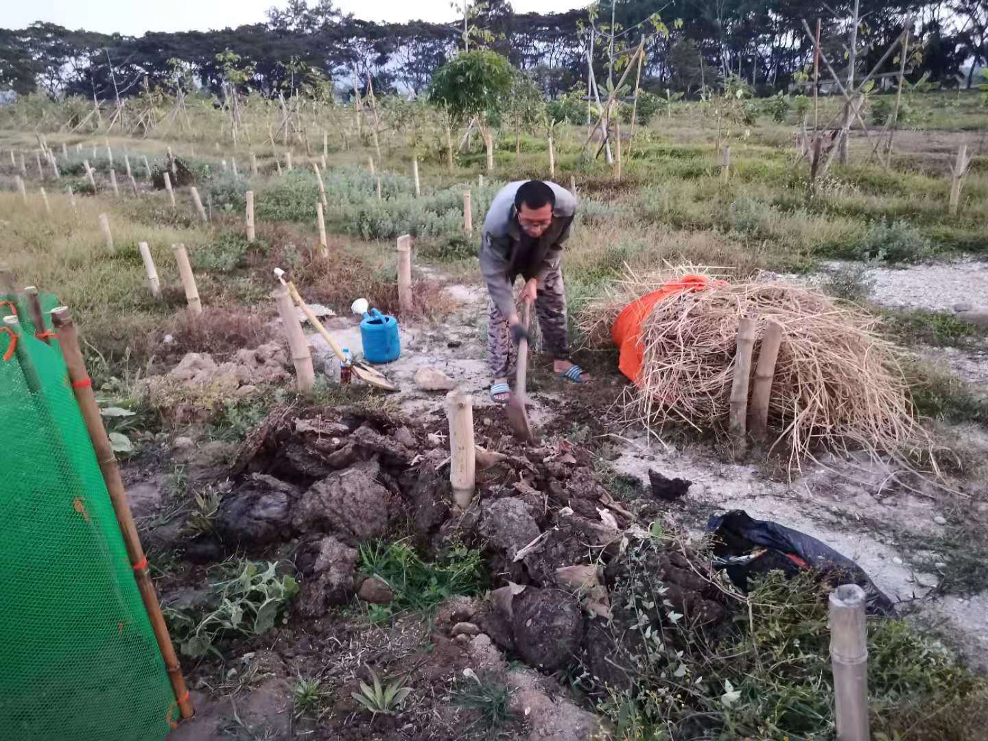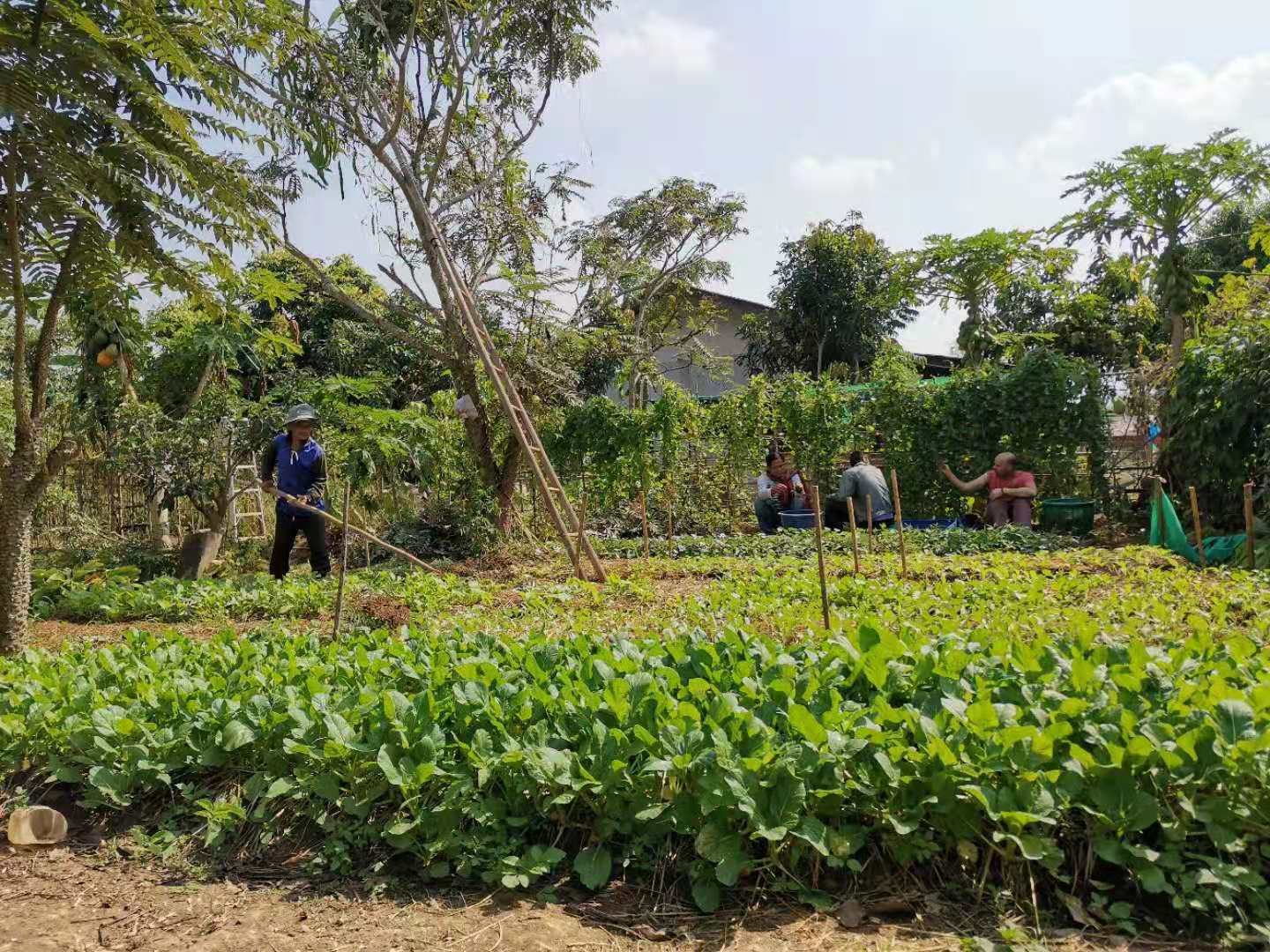 其他時間日常照管菜地,移苗澆水施肥,仰樂收集了一些竹竿,準備為廚房後面大片菜地的攀爬類蔬菜做架子。 餐廳前的菜地上,我們一開始使用的肥是這裡師傅快速做成的,樹葉和木屑等有機質基本沒有分解,這種肥的主要作用是與黏土攪拌均勻疏鬆土質,但並沒有多少肥力。 所以除了使用液肥和自己儲存的尿液,仰樂還拉牛糞稻草繼續做堆肥,希望用有機的方法讓這裡貧瘠的黏土變得疏鬆有肥力。 期間Doiskate的阿讚素貼來過一次,關心詢問我們在這的生活和工作是否開心如意,並安慰我們,廚房前的新土需要時間改良,不要著急。 他還給我們帶來了一位教泰餐的美女老師,對我們這裡感興趣來這參觀一下,忘了給他們拍照了。