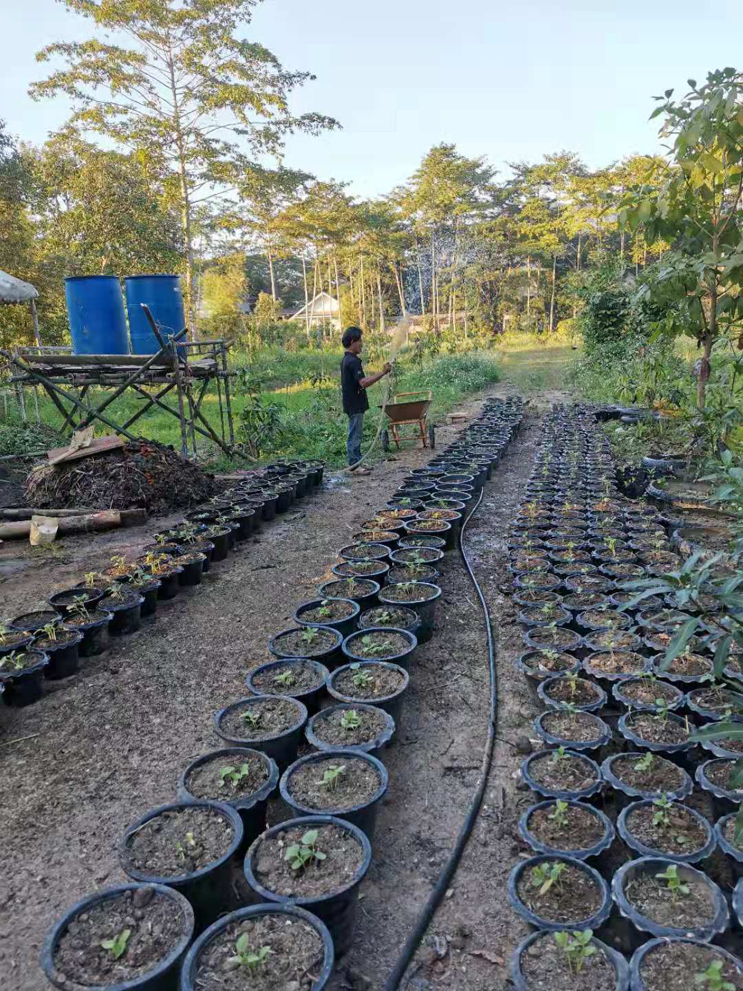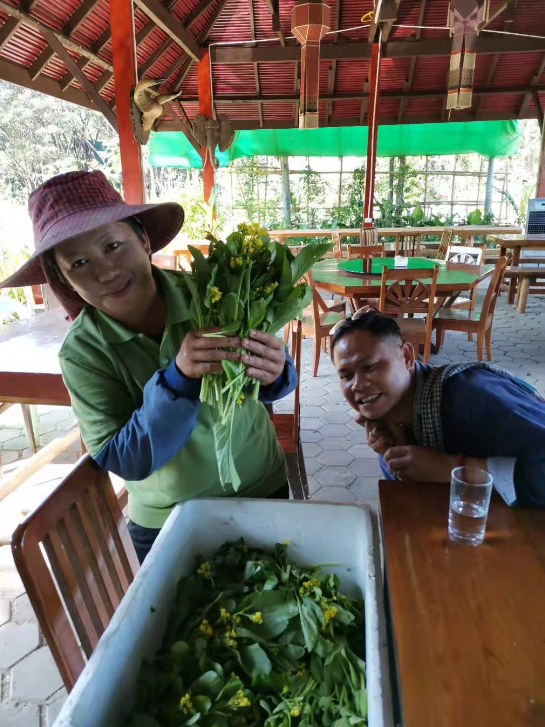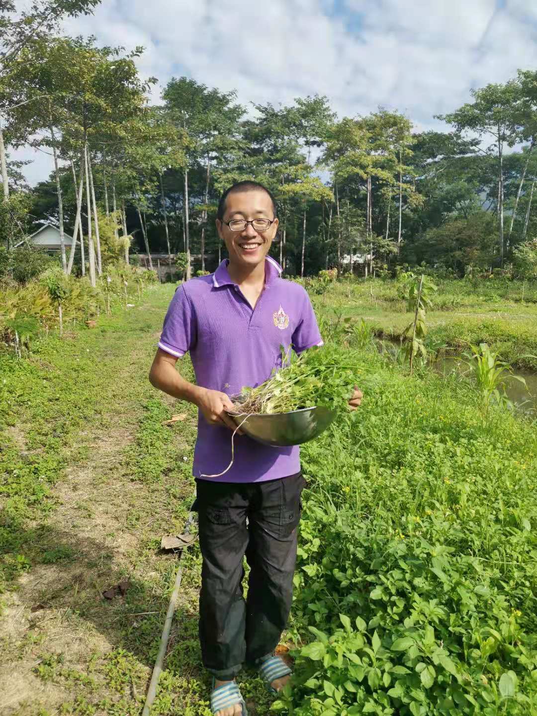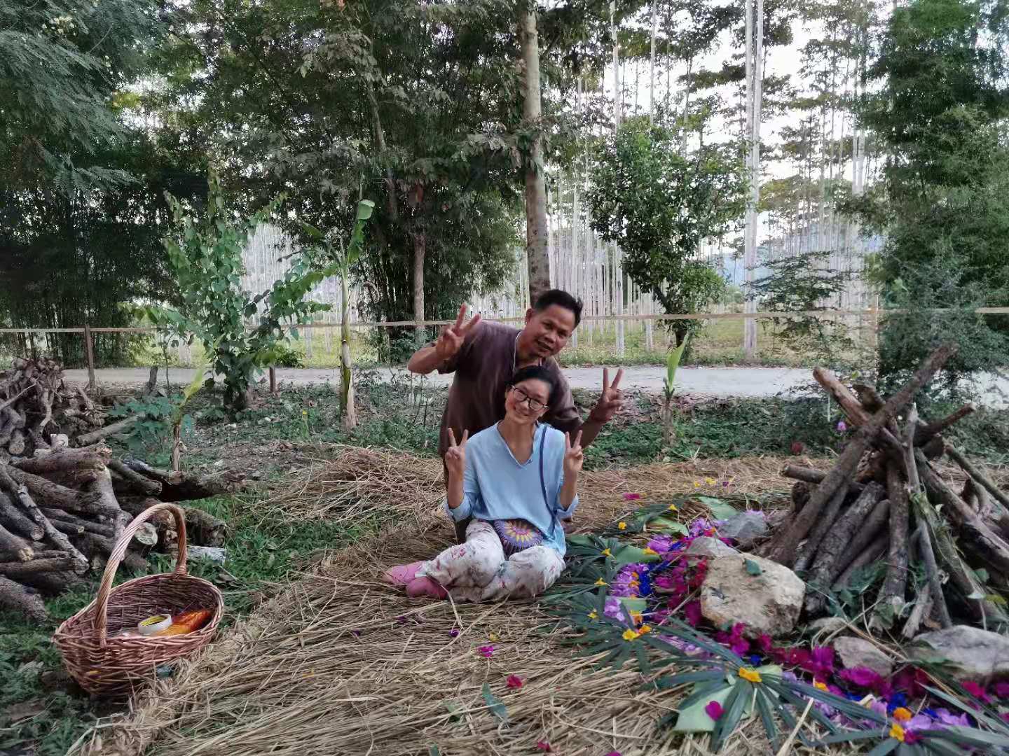 其他時間日常照管菜地,移苗澆水施肥,仰樂收集了一些竹竿,準備為廚房後面大片菜地的攀爬類蔬菜做架子。 餐廳前的菜地上,我們一開始使用的肥是這裡師傅快速做成的,樹葉和木屑等有機質基本沒有分解,這種肥的主要作用是與黏土攪拌均勻疏鬆土質,但並沒有多少肥力。 所以除了使用液肥和自己儲存的尿液,仰樂還拉牛糞稻草繼續做堆肥,希望用有機的方法讓這裡貧瘠的黏土變得疏鬆有肥力。 期間Doiskate的阿讚素貼來過一次,關心詢問我們在這的生活和工作是否開心如意,並安慰我們,廚房前的新土需要時間改良,不要著急。 他還給我們帶來了一位教泰餐的美女老師,對我們這裡感興趣來這參觀一下,忘了給他們拍照了。