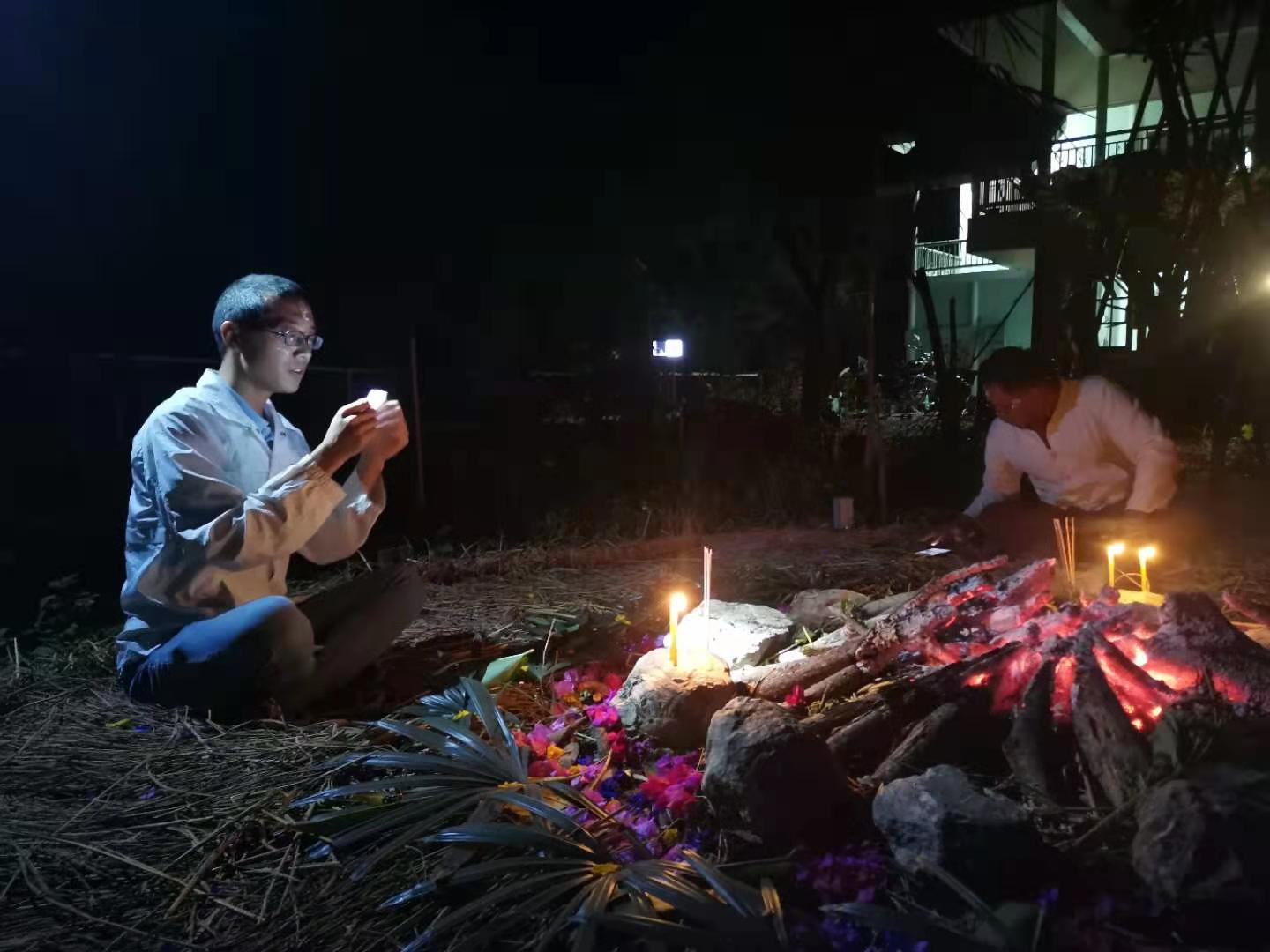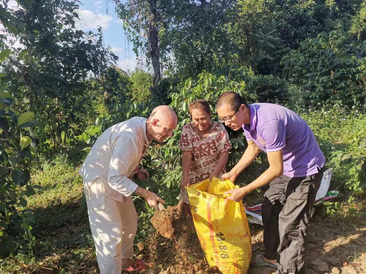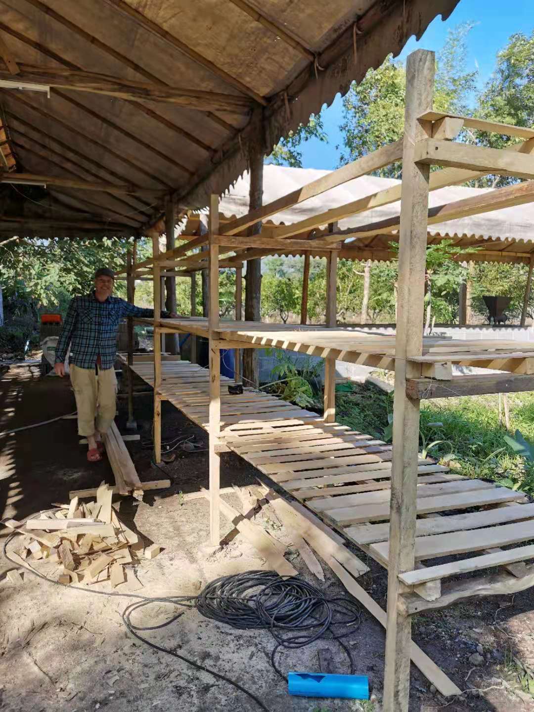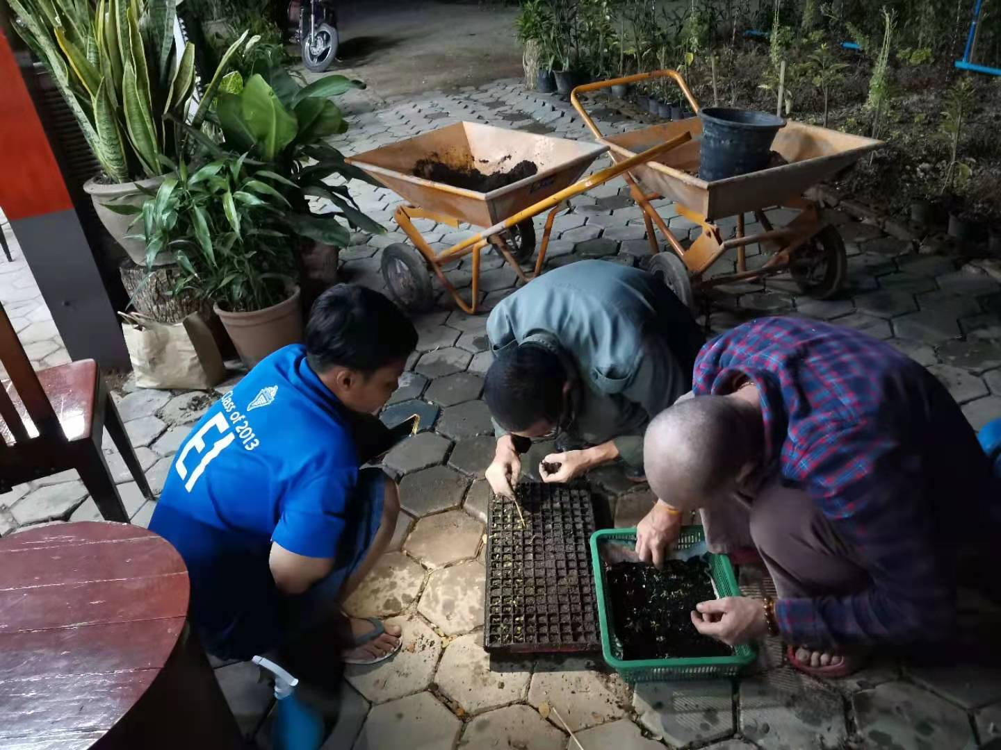 其他時間日常照管菜地,移苗澆水施肥,仰樂收集了一些竹竿,準備為廚房後面大片菜地的攀爬類蔬菜做架子。 餐廳前的菜地上,我們一開始使用的肥是這裡師傅快速做成的,樹葉和木屑等有機質基本沒有分解,這種肥的主要作用是與黏土攪拌均勻疏鬆土質,但並沒有多少肥力。 所以除了使用液肥和自己儲存的尿液,仰樂還拉牛糞稻草繼續做堆肥,希望用有機的方法讓這裡貧瘠的黏土變得疏鬆有肥力。 期間Doiskate的阿讚素貼來過一次,關心詢問我們在這的生活和工作是否開心如意,並安慰我們,廚房前的新土需要時間改良,不要著急。 他還給我們帶來了一位教泰餐的美女老師,對我們這裡感興趣來這參觀一下,忘了給他們拍照了。