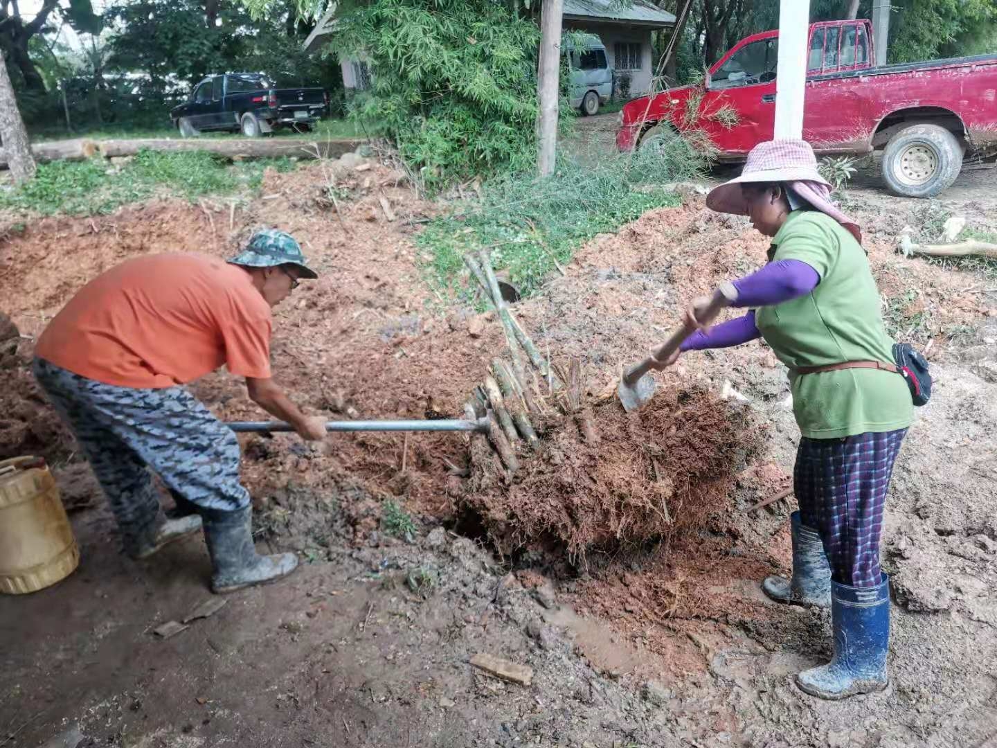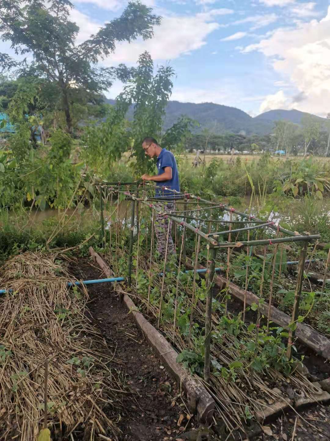 說起創造的快樂,龍炮大頑童玩得最嗨了,多年前種的樹,現在可以鋸掉蓋房子,70多歲的老人家現場指揮挖土機如何動土,如何移動重木板搭桌子等,施工時的每一個細節都在他的設計規劃計算中,工人們按照指令配合他即可。 我們幫忙移栽竹子,在新房子旁邊種植景觀小灌木,清理工地不需要的木料。 龍炮分工鮮明,不讓女子幹重活,仰樂哥哥全力以赴的樣子太帥太迷人了! 龍炮在工地看到我們很開心的說“wanni chuay longpao”(今天幫龍炮幹幹活哈! )我們倆只管在地里自己幹活總覺得缺些什麼,有機會和工人一起配合說說笑笑,更有大家庭的感覺,當然也很樂意説明一位老人家實現他的願望,讓他開心了。