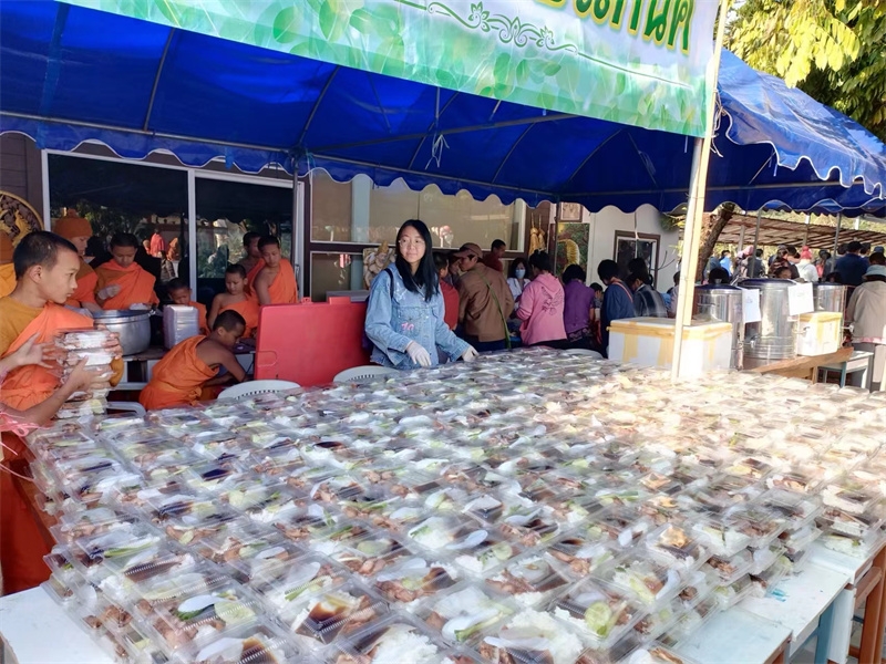 泰國兒童節,龍袍讓大家去寺廟一層觀賞了泰國孩子們跳舞,每當寺廟有盛大的節日都會有免費的佈施,我們每次去都會有霜淇淋麵條等小吃,看哪裡需要便主動幫忙,這次大家幫服務人員和小和尚們打包盒飯。