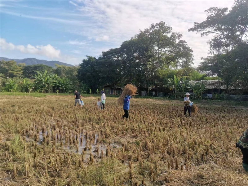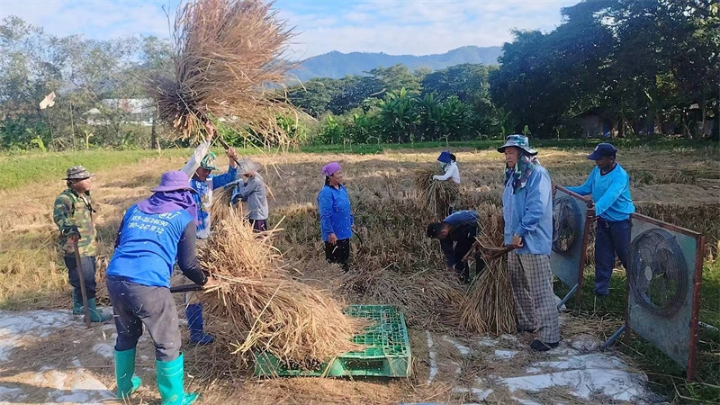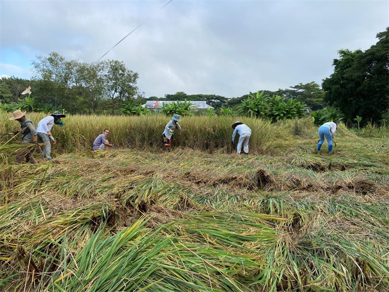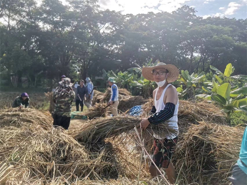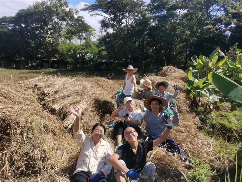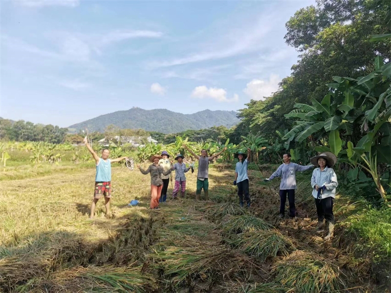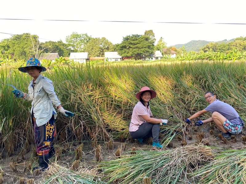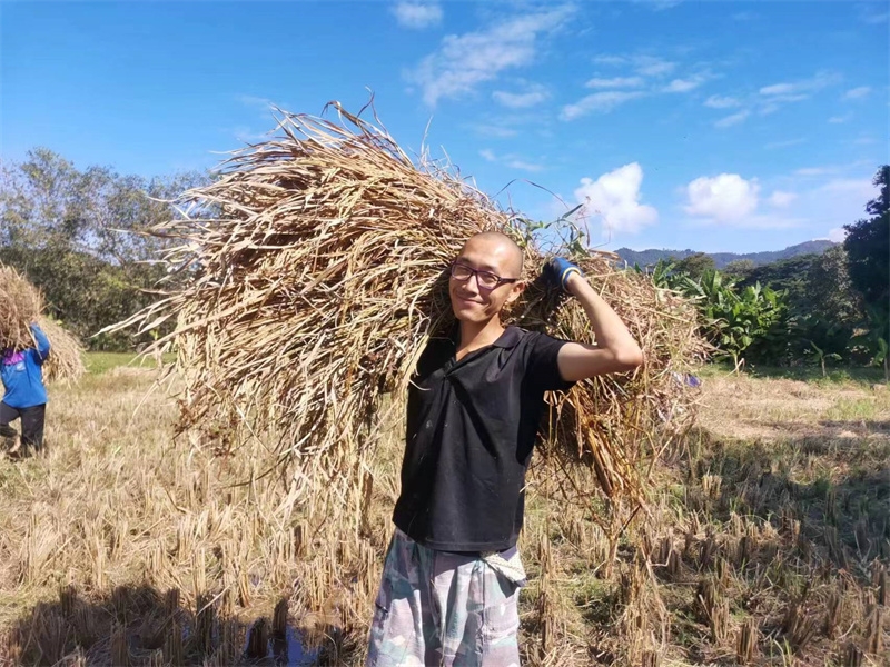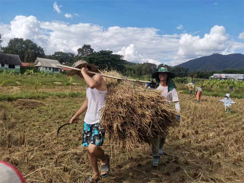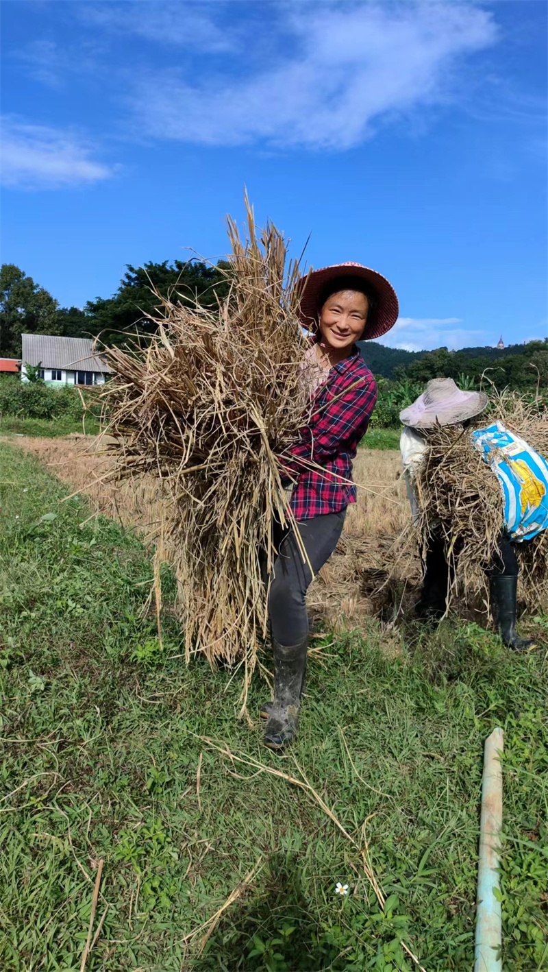 快樂自在的日子一天天過得很快,不知什麼時候房前綠油油的稻田變成了黃澄澄的色彩,配上藍天白雲青山綠竹,猶如一副絢麗又樸實的水彩畫。 龍袍在自己的地里也種植了幾畝水稻,這些天我們和工人們一起收割水稻:大家每人一把小鐮刀,把稻子割倒放在陽光下暴曬,兩天后再把稻子收集在一處,工人們手工甩稻子脫粒,我們幫著抱稻子,大家體驗了幾天農忙時期的激情燃燒,也再次感受到禪院草們勤奮吃苦耐勞的品質。