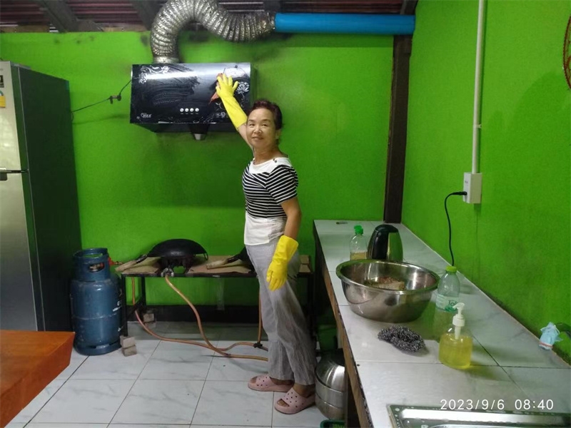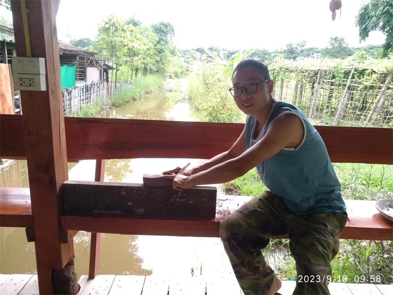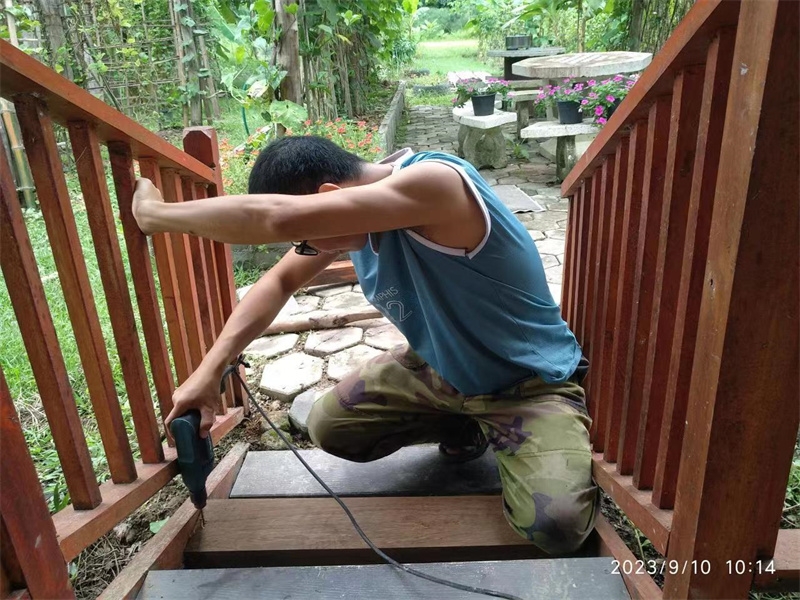 慧光從園中找來舊房子拆下的舊木頭,經加工變成了嶄新的木條木板,翻新加固了廚房前亭子的欄杆和樓梯。 芒果園為防止蚊子進入客廳洗澡間以及廚房,慧光給外界與房內通透處都安裝了紗網。
