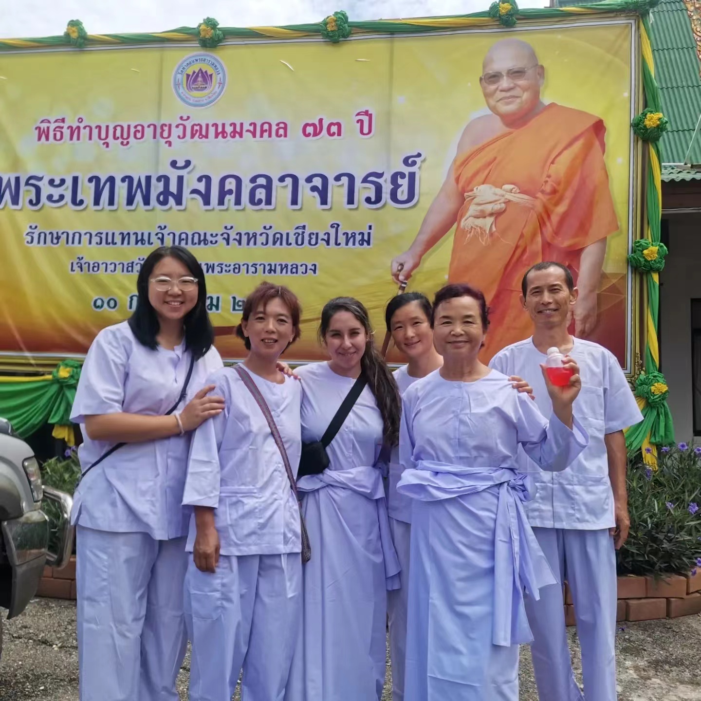 七月十號龍袍生日是寺廟的盛大節日,早上大家穿上白衣服去為龍袍慶祝生日。 寺廟一層擺滿了各種小吃攤位,零食、甜點,霜淇淋、飲料、麵條等,凡去參與節日的都可以隨意取用。 上午在寺廟吃吃玩玩,偶爾幫點小忙,下午我們一起用英語為龍袍唱了生日快樂歌,可能是第一次接受到國際大家庭不一樣祝福,龍袍先是愣怔了一下,眼眶隨著歌聲紅潤起了,祝壽結束后他給我們每人送了一支筆作為禮物,還拿出大袋的開心果和巴達木堅果等送予大家。 百川仰樂前些天咯噔發起“騷”來,龍袍得知他倆不能前來參加節日,晚上便讓阿男和尚給他們帶來了燕窩雞精水果等補品,現在他倆都大好了,能吃能喝,能睡能玩,也能對肚臍眼了。