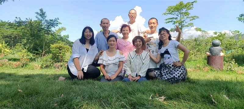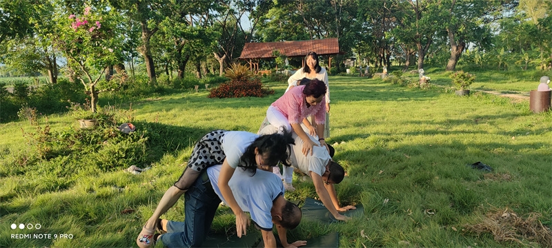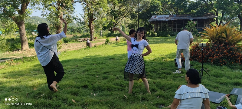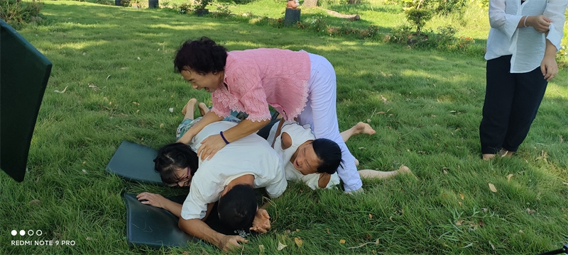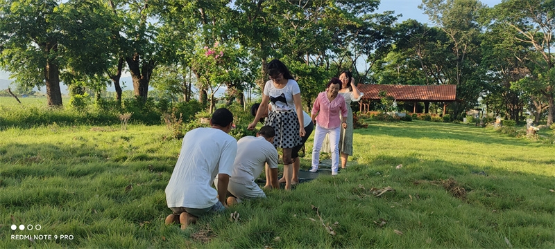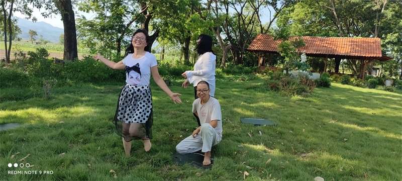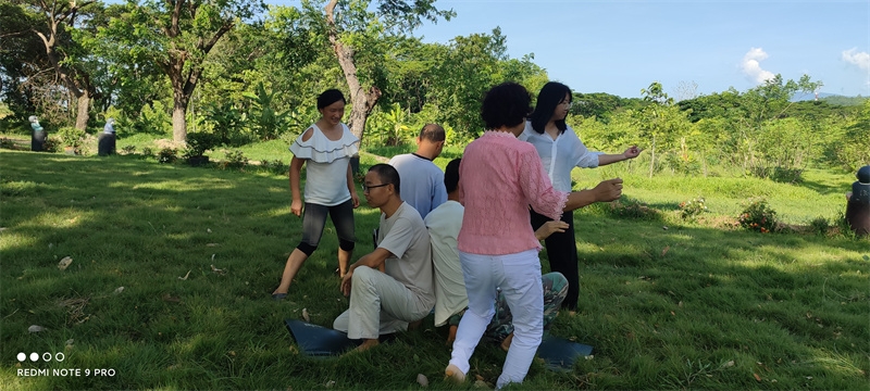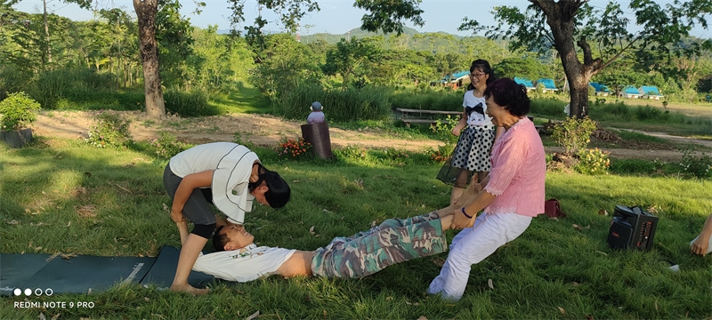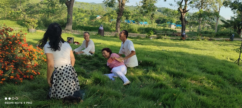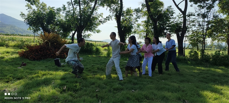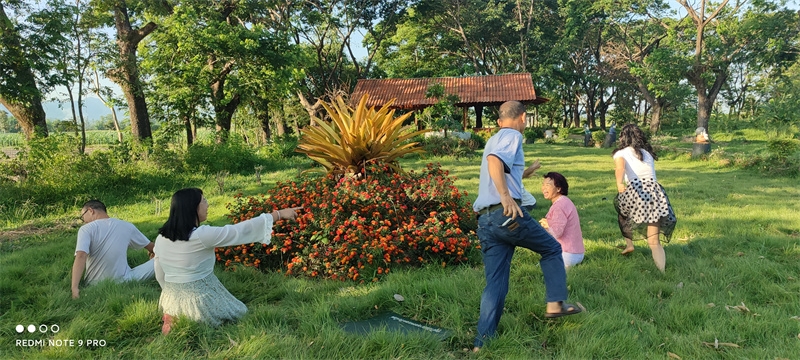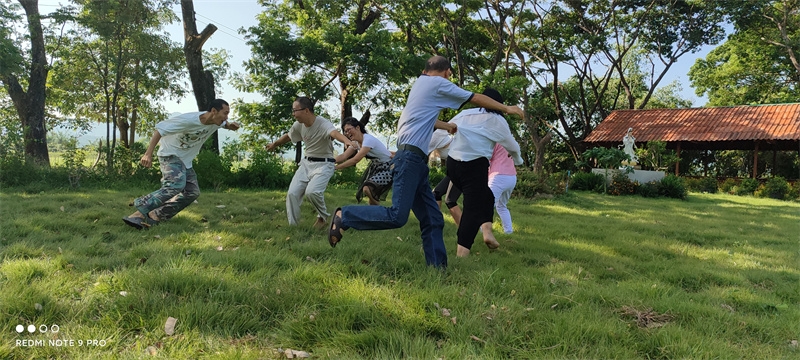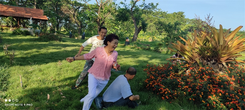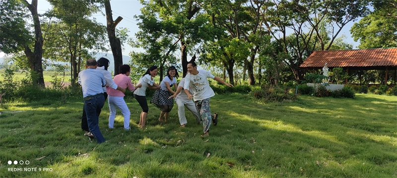 早晨六點,八仙坐在一起誦讀了“入住第二家園祈禱詞”,向上帝爺爺祈禱感恩。 接下來,迎著朝陽伴著盛開的花兒,激情昂揚跳了綠旋風開場舞,之後大家興高采烈來到青翠柔軟的“紐西蘭草原”,先後玩了“翻山越嶺鑽山洞”,“丟手絹”,“老鷹捉小雞”,“搶凳子”,“鑽拱門”,“五毛一塊”,後來回到餐廳附近,又進行了“躲瓜瓜”,“盲眼餵香蕉”等新的遊戲。 遊戲內容層出不窮,懲罰方式花樣百出,大家追逐打鬧,笑跌草叢,藍天白雲下一陣陣歡聲笑語,一浪浪激情高潮在田間上演著,大家在大自然懷抱中盡情玩耍撒歡,沉浸在歡樂中像是回到了孩童時代,又好似重溫了天國故鄉的美好時光。