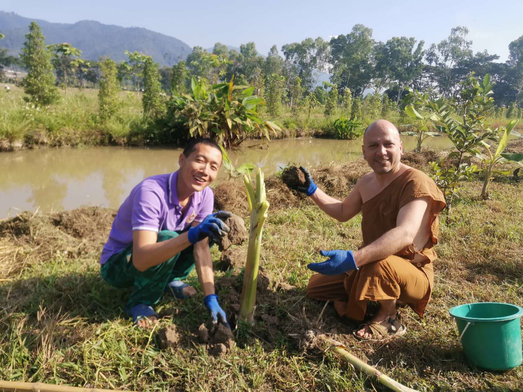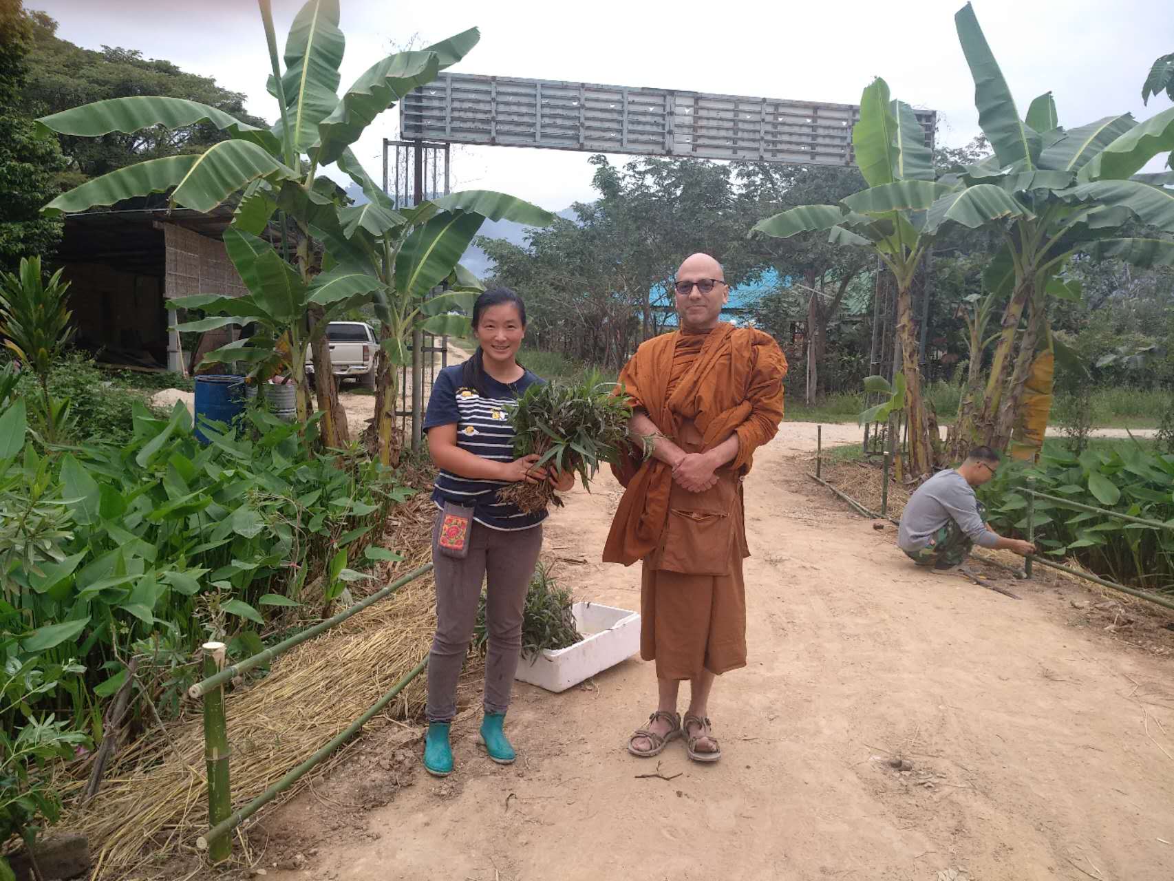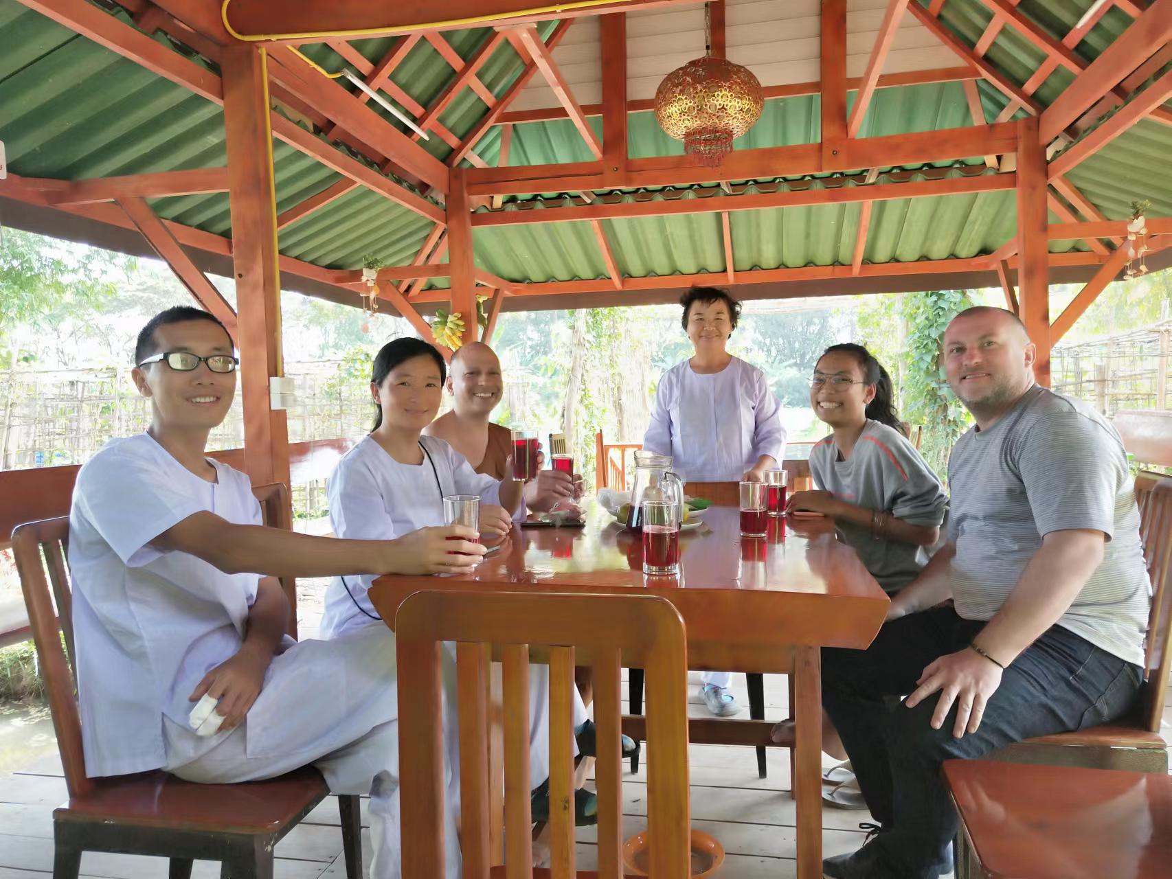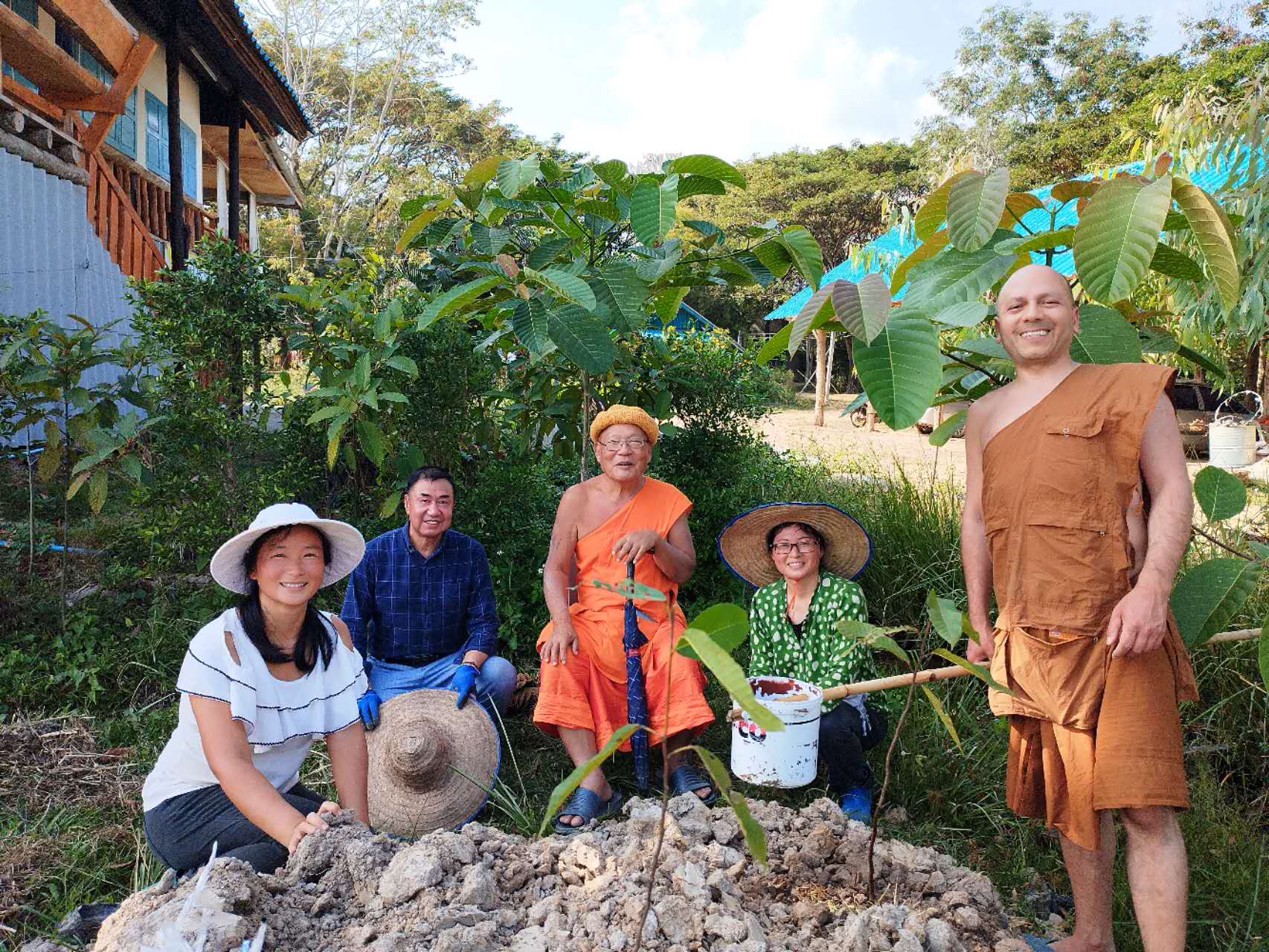 龍袍帶著兩位會講中文的新加坡客人去餐廳,玉林接待他們,與龍袍和客人們聊起了家園歷史:中國政府的遣散,龍袍大佛對我們的收留,並把我們當成孩子一樣疼愛,說到動情處哽咽起來,感染得龍袍大佛也抹起了眼淚。 下午大家去種樹,龍袍大佛特意讓兄弟姐妹們和他一起拍合照,並囑託讓把照片發到中國去。
