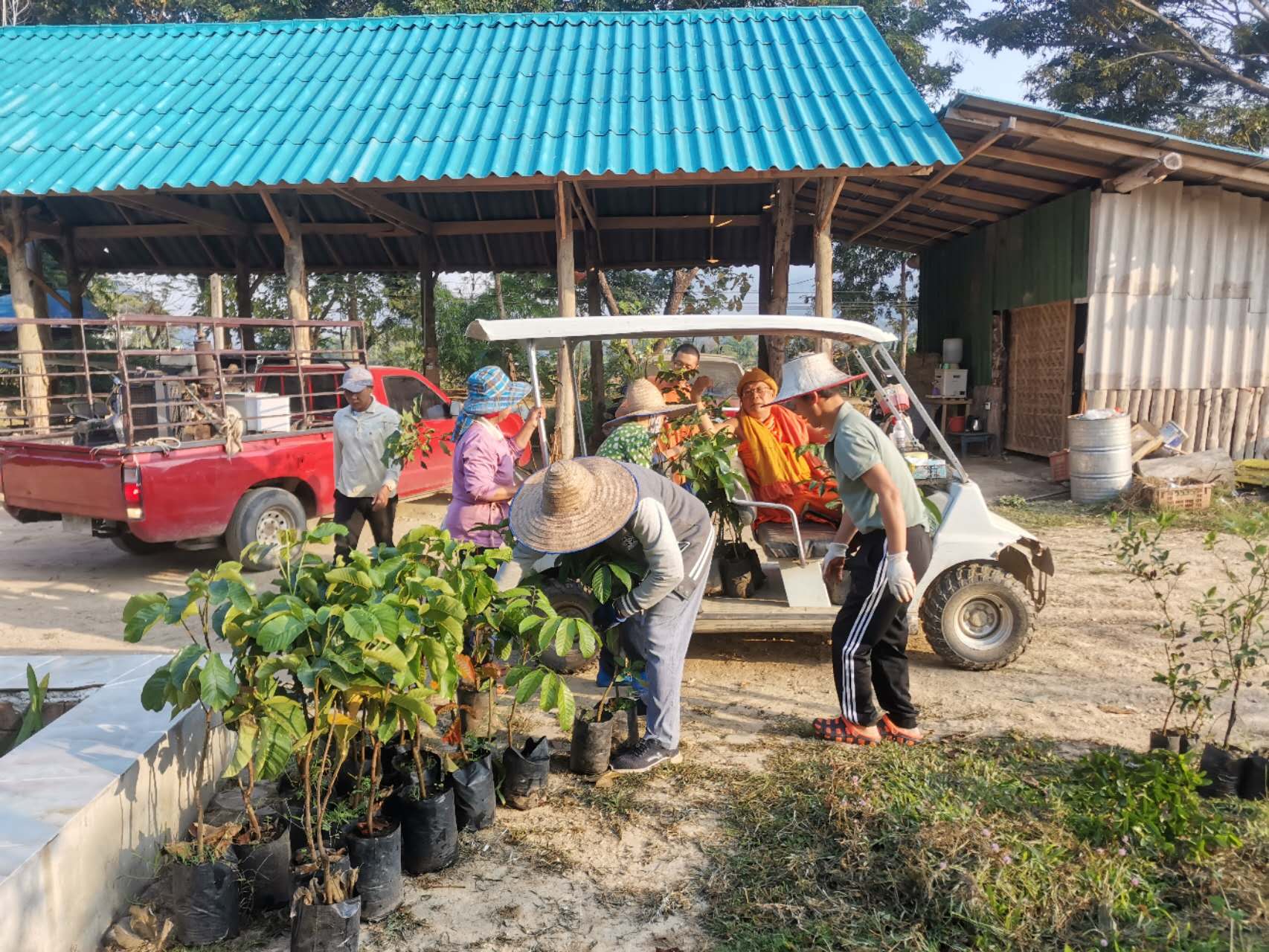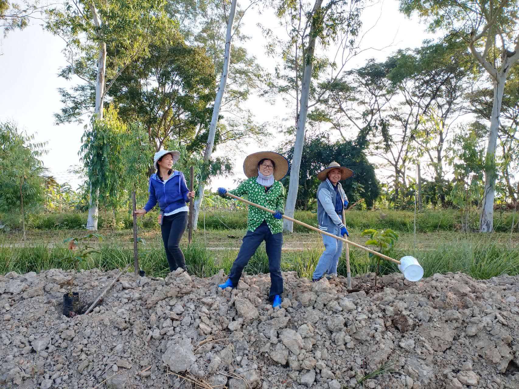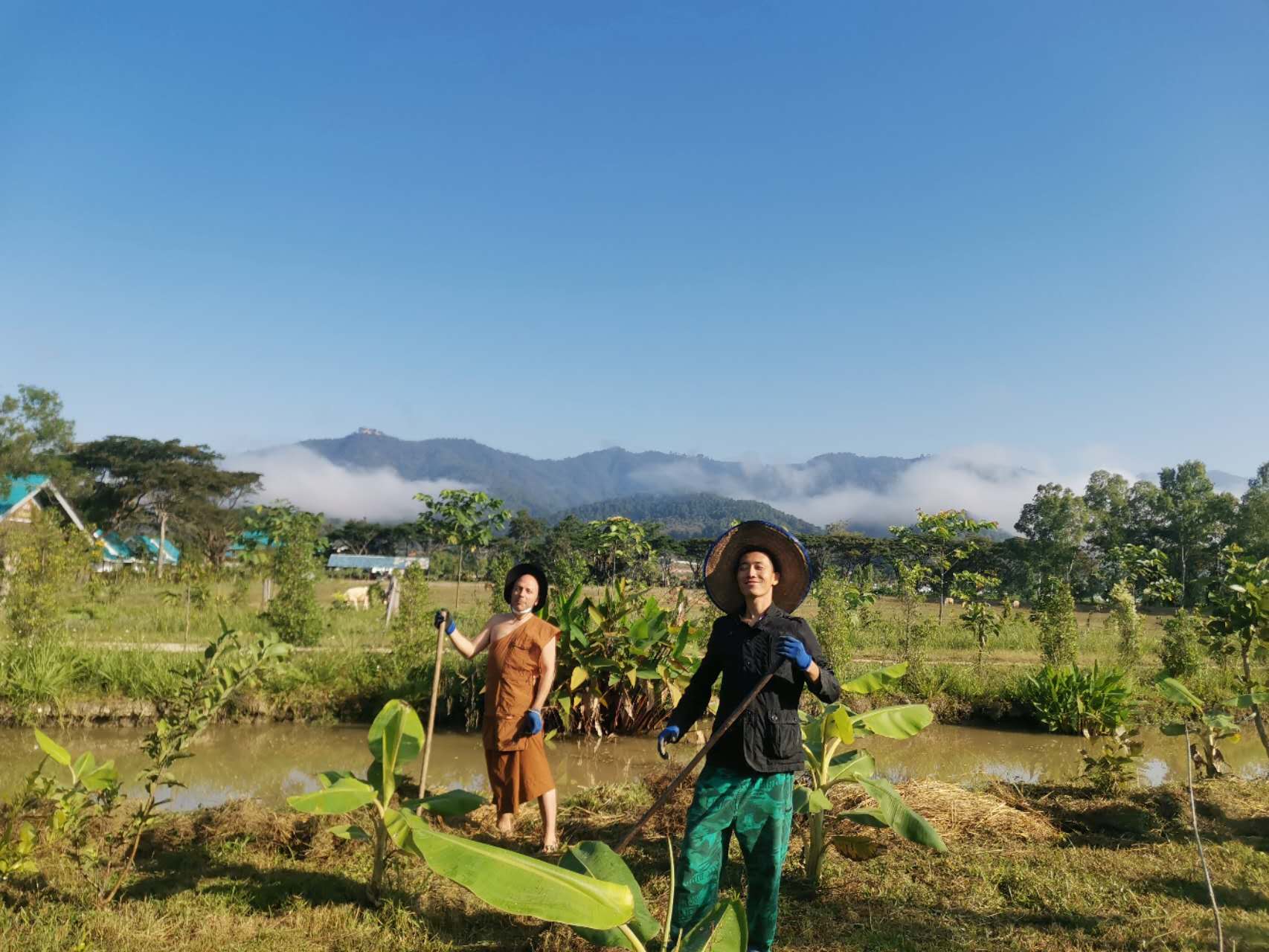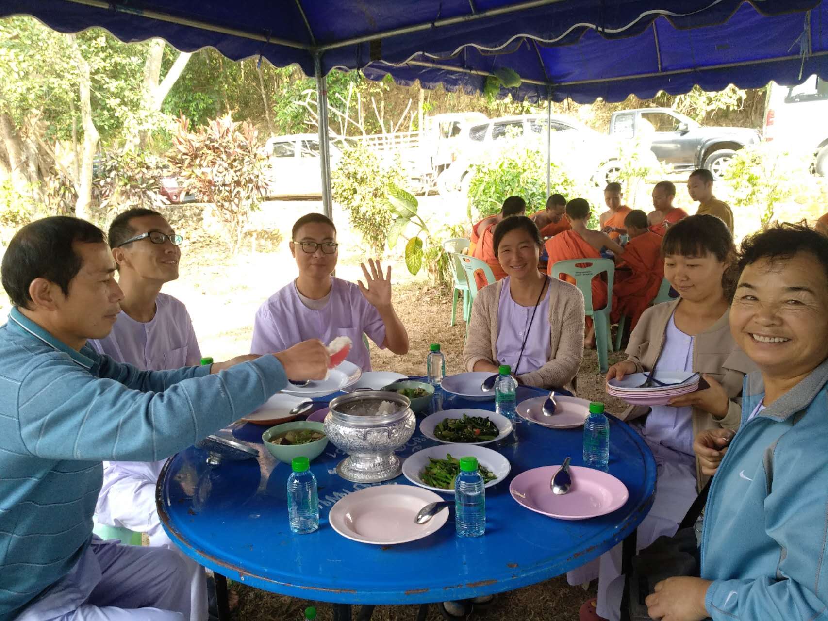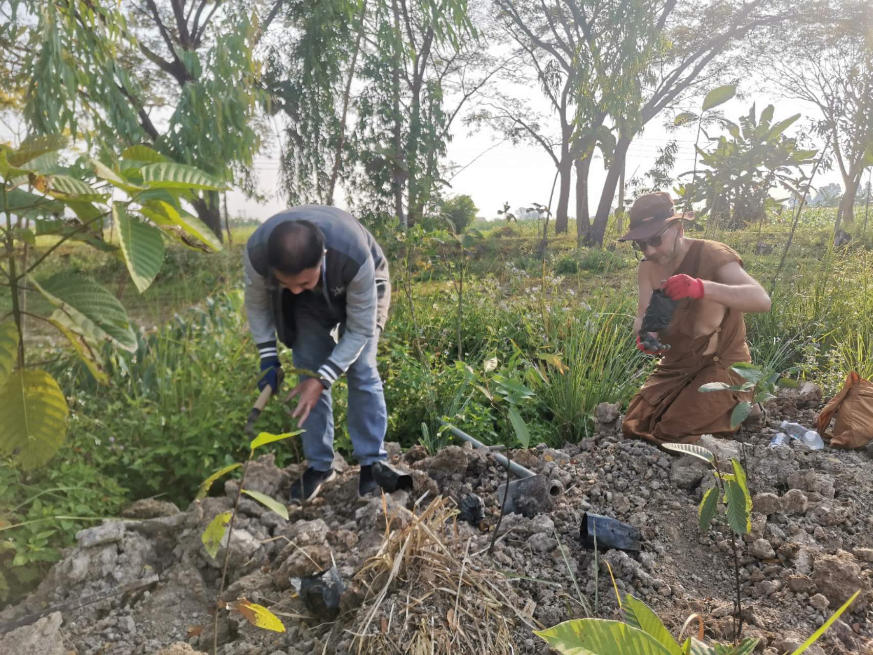 龍袍帶著兩位會講中文的新加坡客人去餐廳,玉林接待他們,與龍袍和客人們聊起了家園歷史:中國政府的遣散,龍袍大佛對我們的收留,並把我們當成孩子一樣疼愛,說到動情處哽咽起來,感染得龍袍大佛也抹起了眼淚。 下午大家去種樹,龍袍大佛特意讓兄弟姐妹們和他一起拍合照,並囑託讓把照片發到中國去。