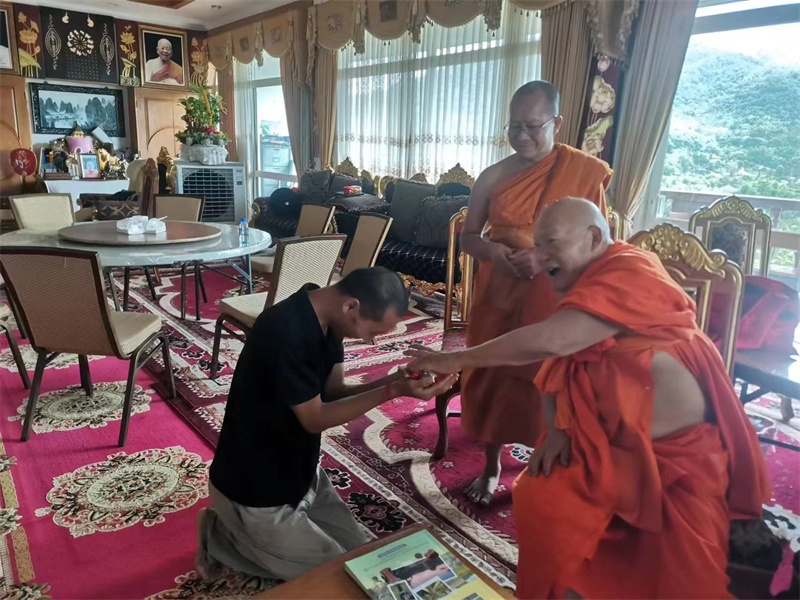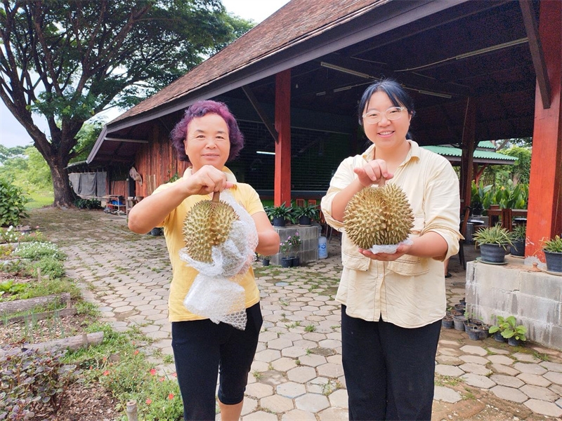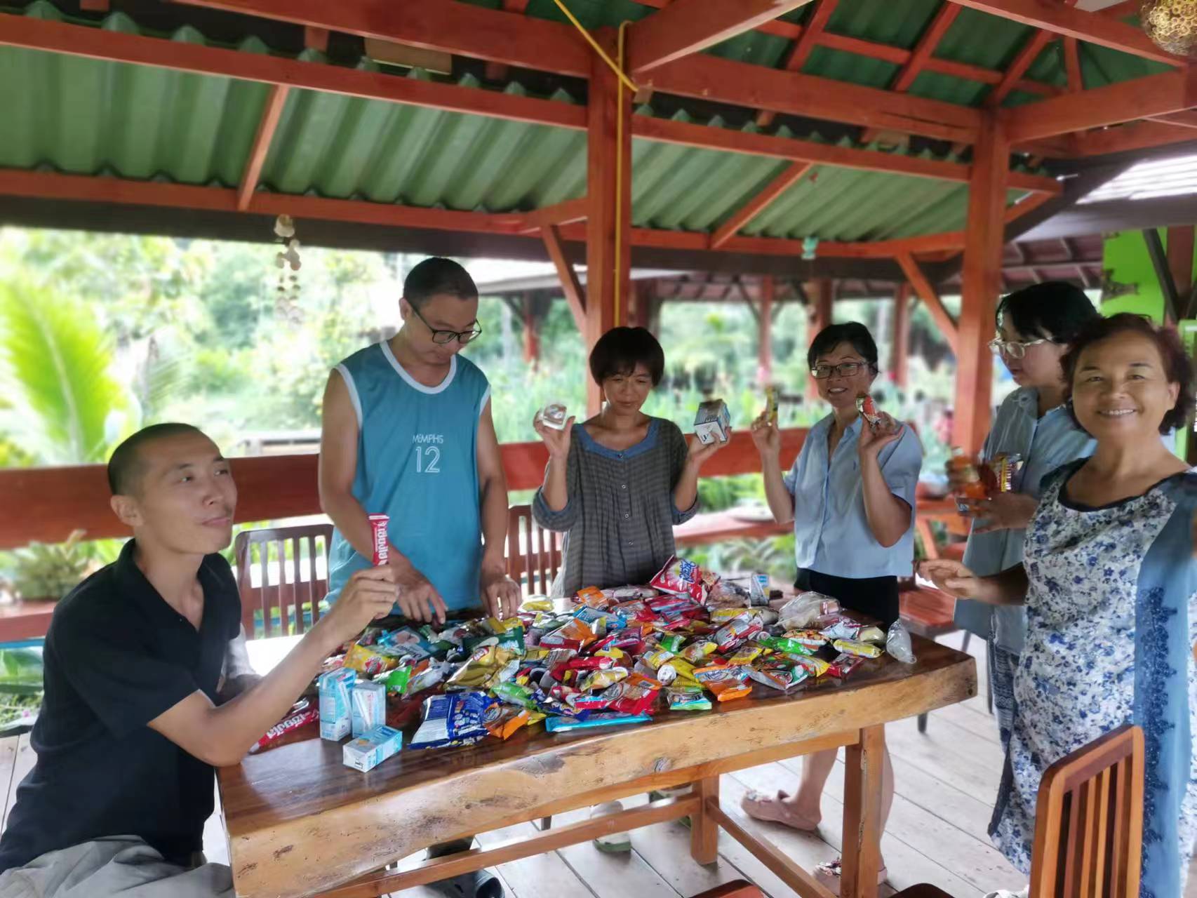 工人們裝卸木材採收芒果,會叫上我們,人多力量大,大家說說笑笑打打鬧鬧很快就把活幹完,現在大氣芒果園的芒果已經被大家採收完畢,一筐筐被送到龍袍清邁的寺廟。 自從被提升為清邁一把手主持后,龍袍常住清邁,很少見到他面,偶爾從清邁回來,成箱給我們帶回各類餅乾,巧克力,麵包,果凍,烤豬肉,海鮮等好吃的,他知道我們喜歡吃榴槤,還特意帶了有機榴槤,我們感恩感歎到,這一箱箱全是龍袍爸爸對我們的關愛啊!