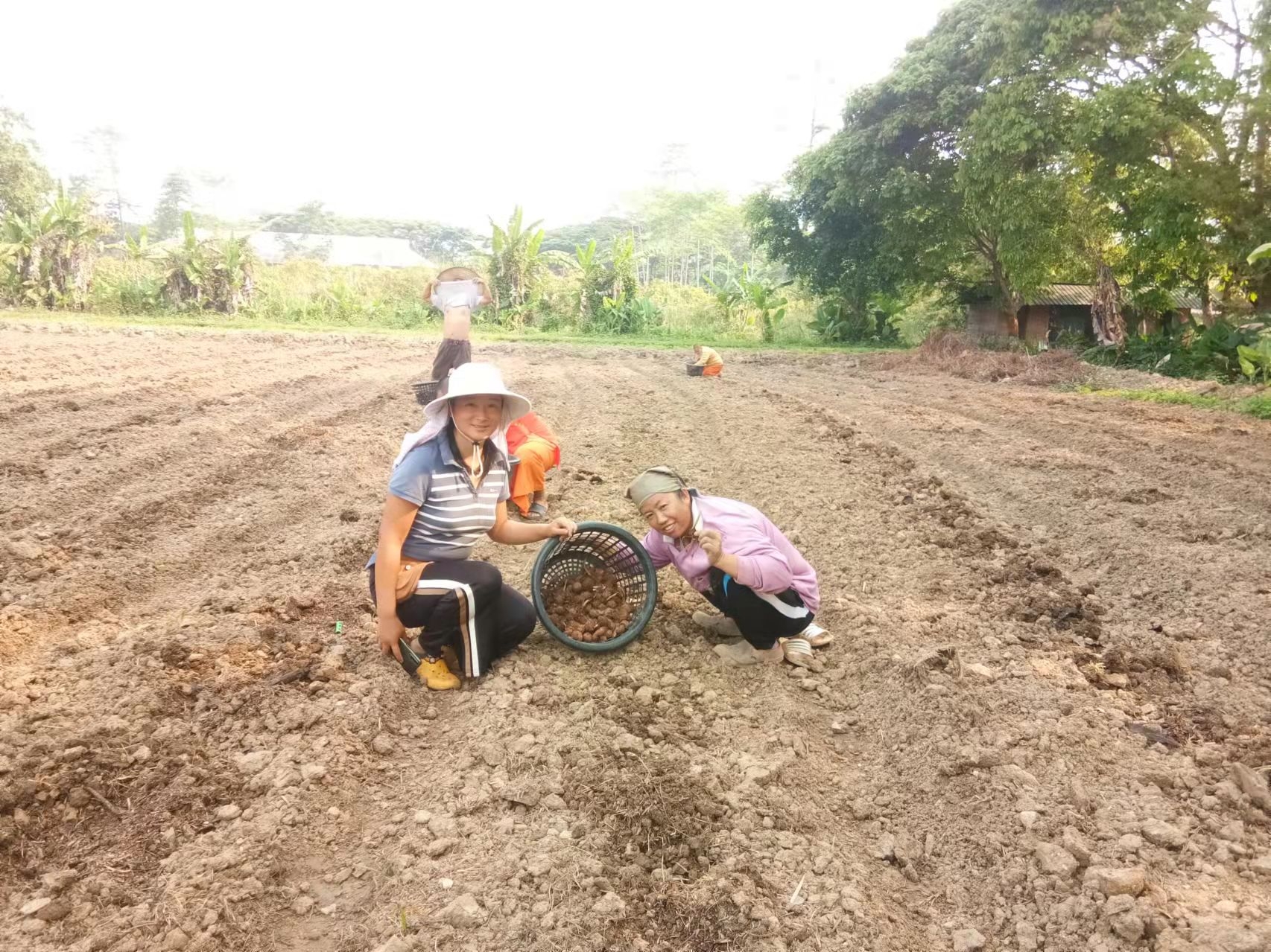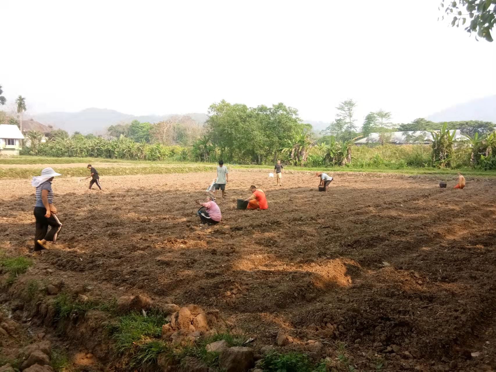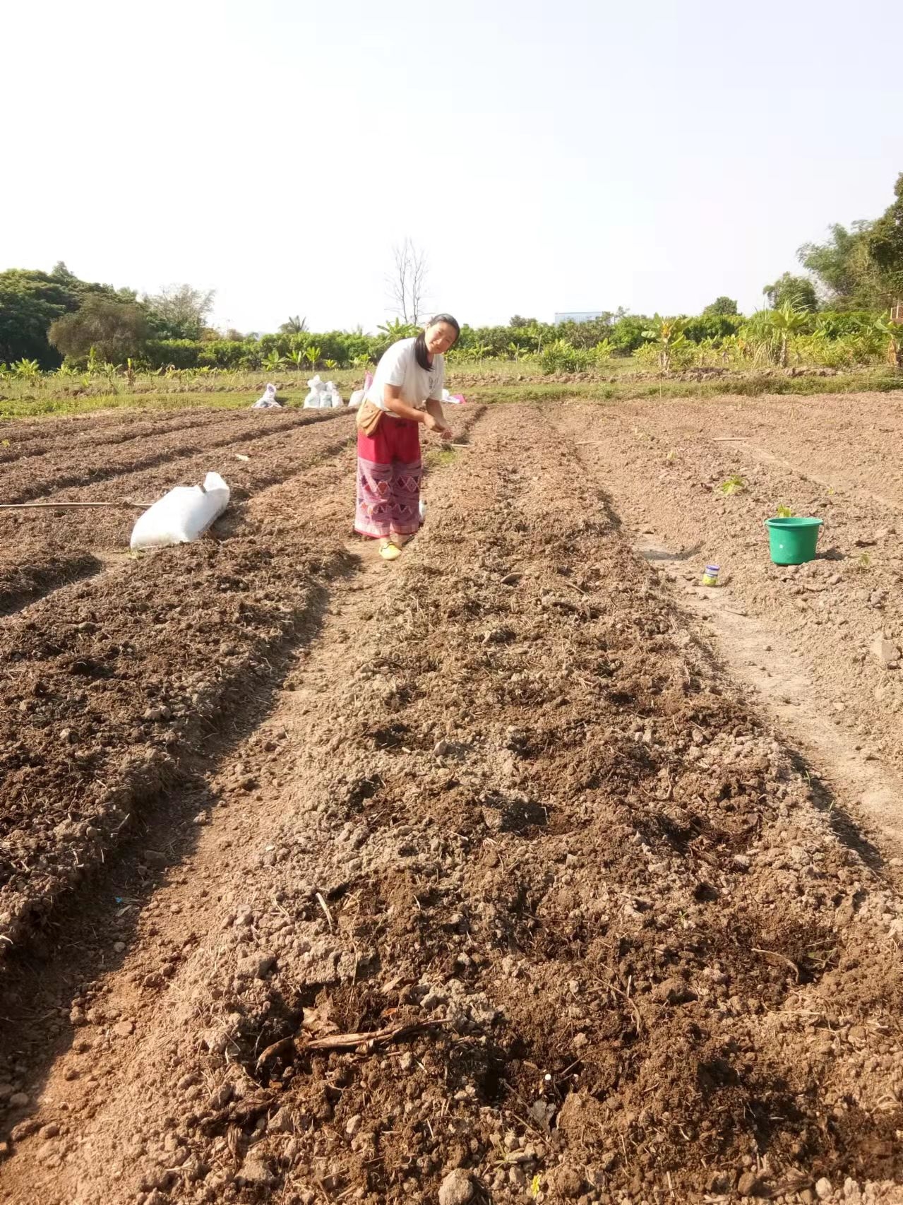 香蕉園旁被開墾的大片田地,三分之二龍炮讓工人和小和尚們種上了芋頭,交給我們的三分之一自由種植,先起隴,順便留出主幹和四通八達的小路,菜床上除了芋頭,還種上了紅薯,木瓜,百香果,玉米,南瓜,泰瓜,黃瓜,茄子,西紅柿等。 用心規劃一番,我們這邊菜地的格局看起來更加整齊美觀。