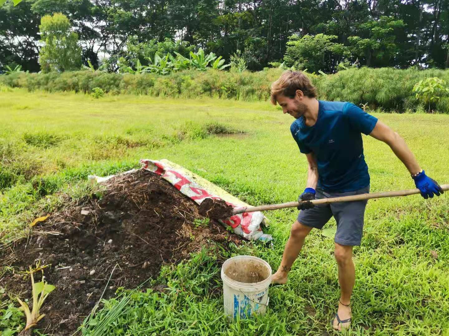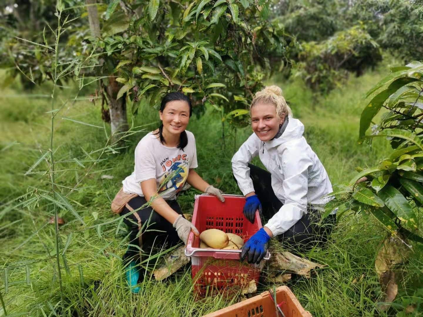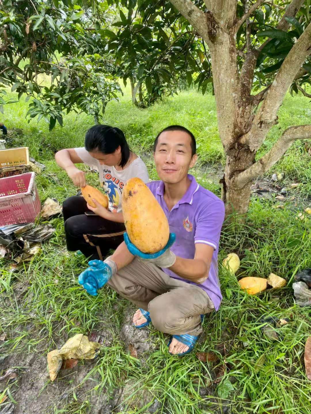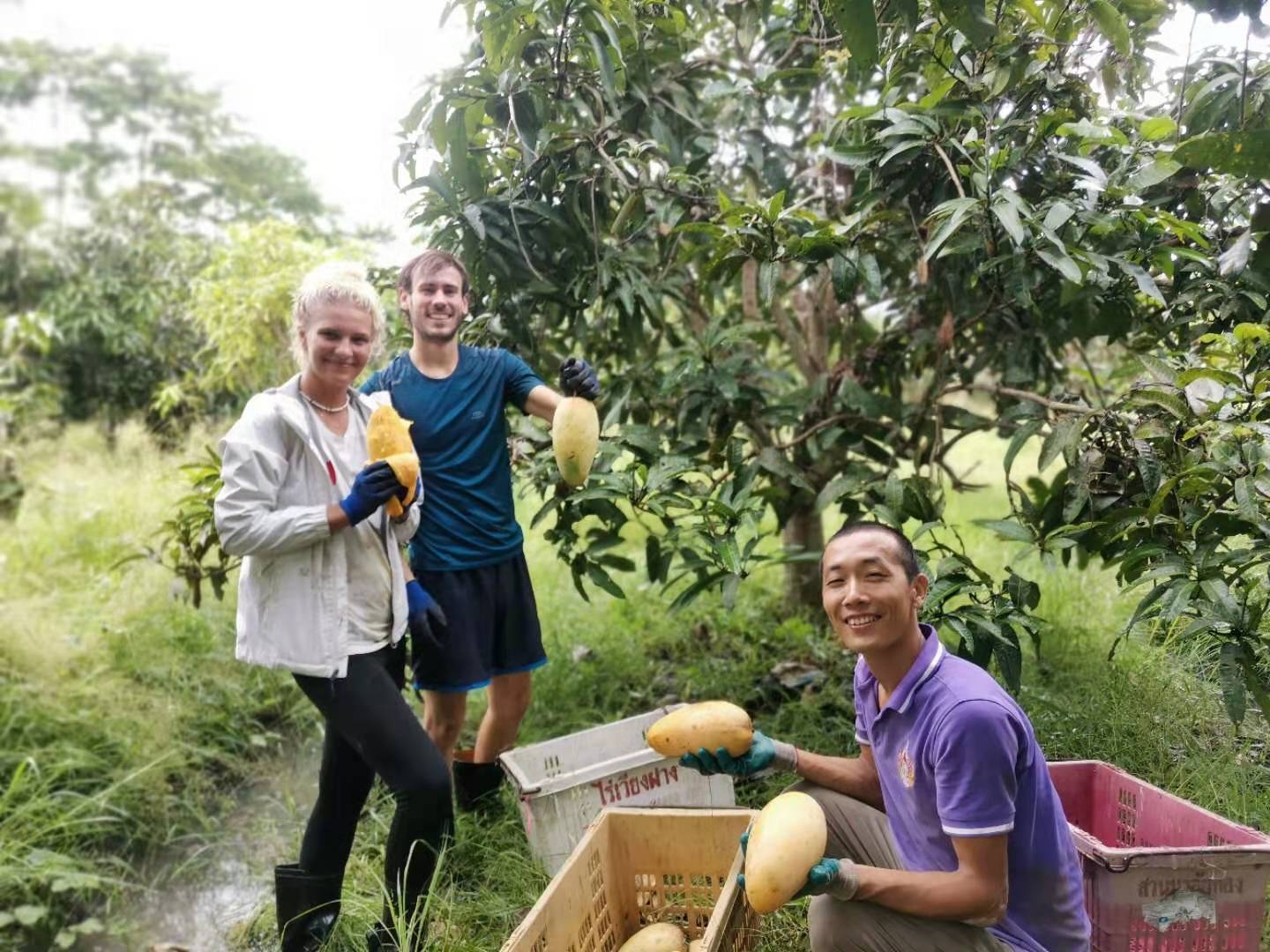這幾天下雨較多,雨停時我們帶他們在菜地里拔草,移栽生菜和魚腥草,種木瓜樹,摟草; 還去芒果園和工人們一起採摘芒果,冒著雨,趟著水,在雜草叢中挑揀放牛大姐用鐮刀從樹上割下的芒果放進筐裡,仰樂和中國大哥負責把滿筐的芒果搬運到車上,團隊協作,不到一下午功夫摘了一車芒果,平時享受到太多芒果的美味,現在也體會到了果農們收穫芒果的幸福,Sophie和Mati也覺得這對他們來說是一次很好很有意義的體驗。