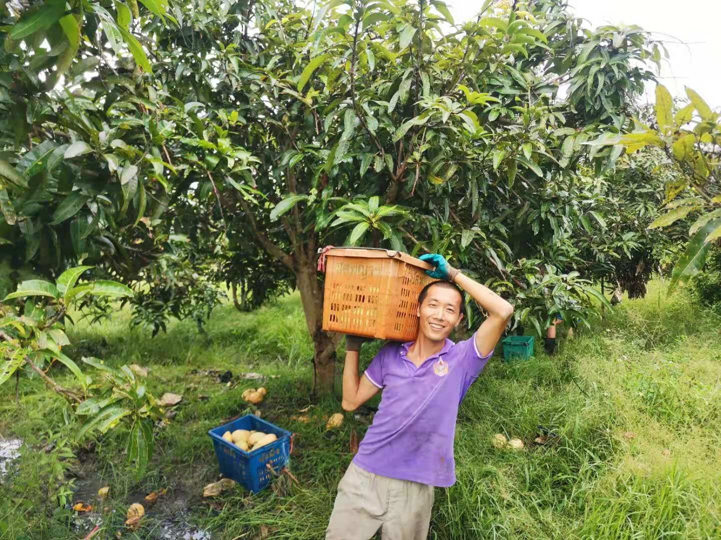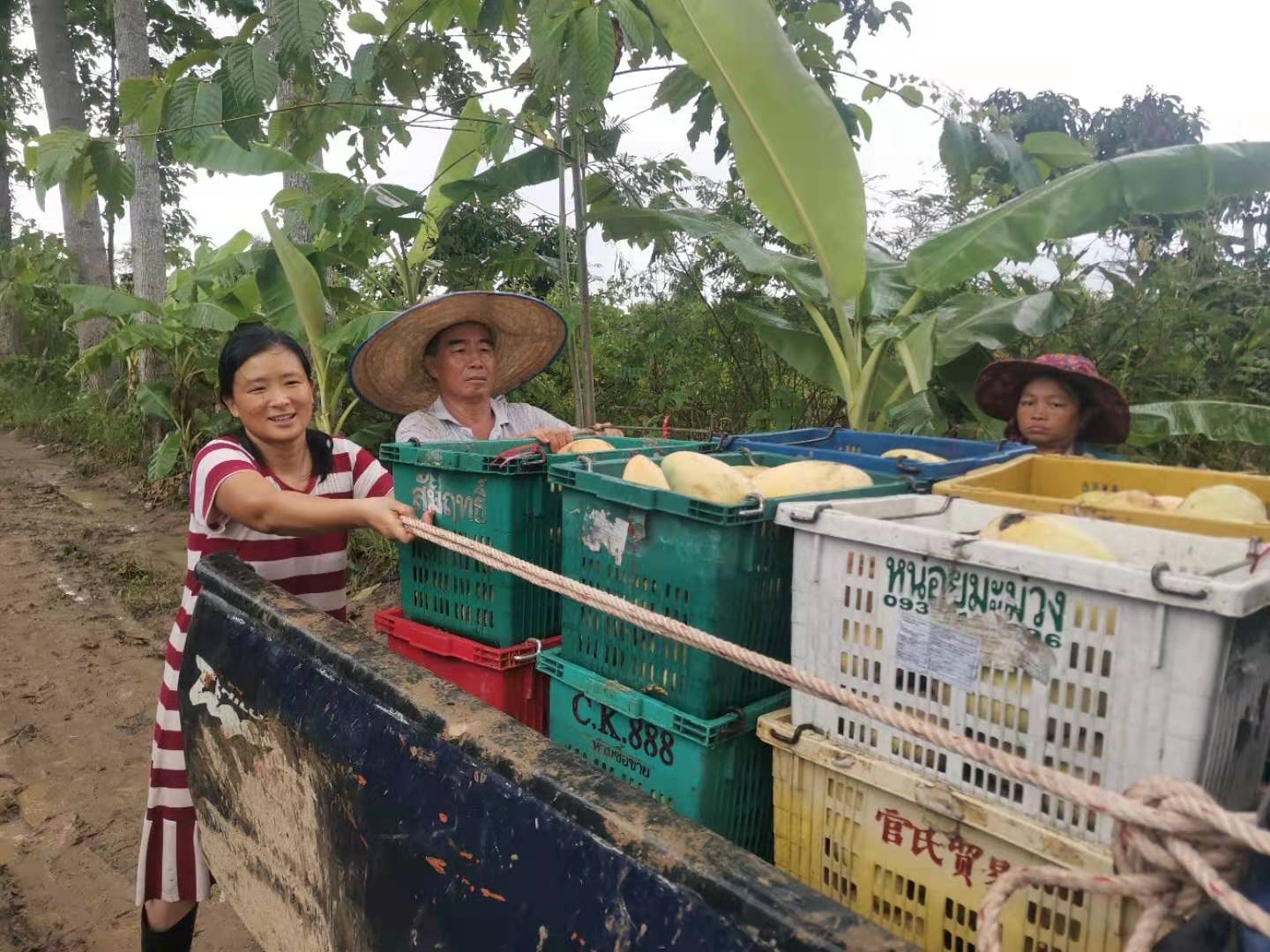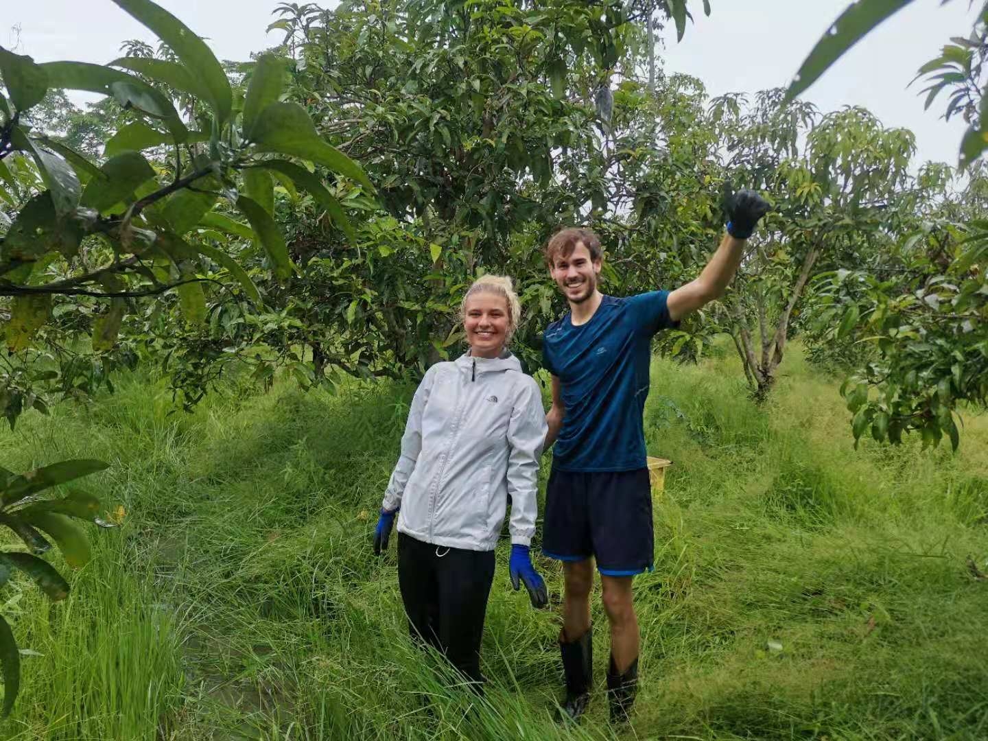 這幾天下雨較多,雨停時我們帶他們在菜地里拔草,移栽生菜和魚腥草,種木瓜樹,摟草; 還去芒果園和工人們一起採摘芒果,冒著雨,趟著水,在雜草叢中挑揀放牛大姐用鐮刀從樹上割下的芒果放進筐裡,仰樂和中國大哥負責把滿筐的芒果搬運到車上,團隊協作,不到一下午功夫摘了一車芒果,平時享受到太多芒果的美味,現在也體會到了果農們收穫芒果的幸福,Sophie和Mati也覺得這對他們來說是一次很好很有意義的體驗。