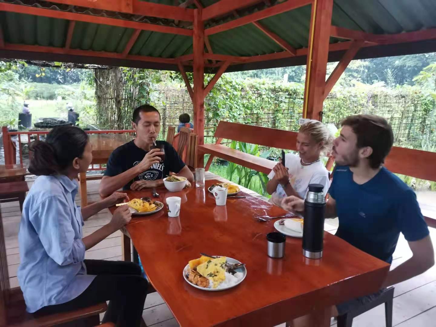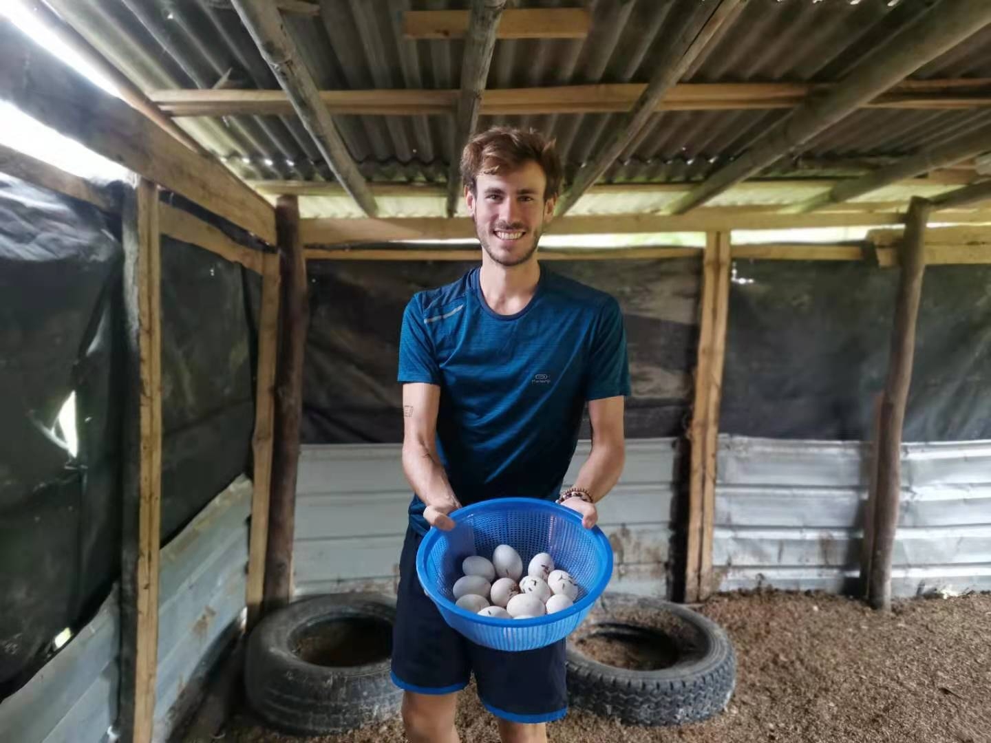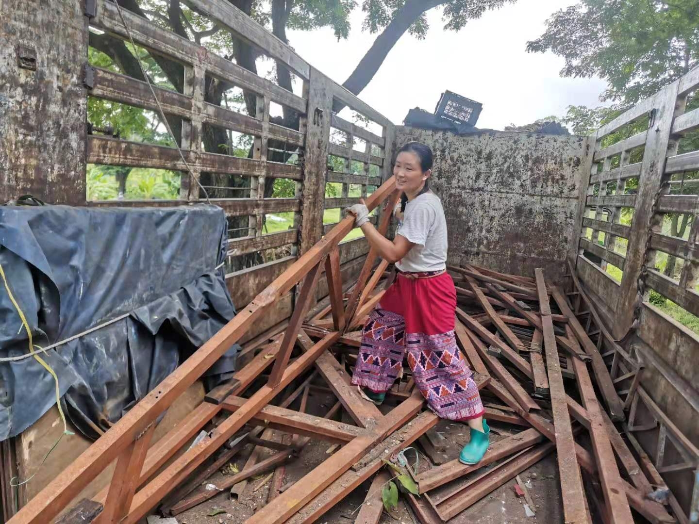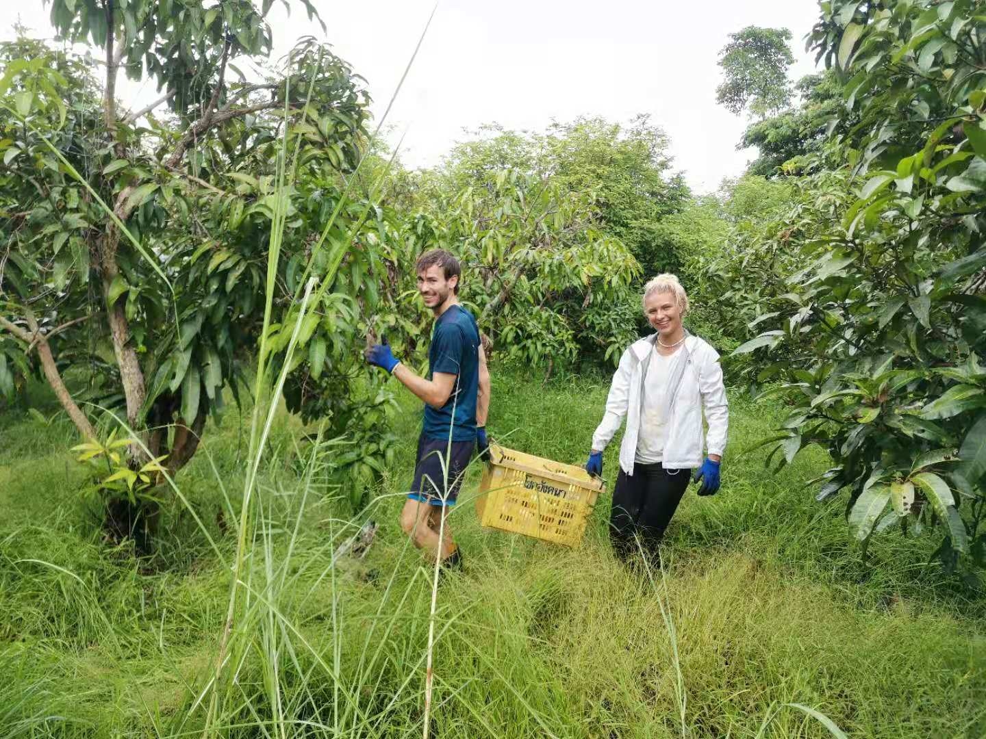 這幾天下雨較多,雨停時我們帶他們在菜地里拔草,移栽生菜和魚腥草,種木瓜樹,摟草; 還去芒果園和工人們一起採摘芒果,冒著雨,趟著水,在雜草叢中挑揀放牛大姐用鐮刀從樹上割下的芒果放進筐裡,仰樂和中國大哥負責把滿筐的芒果搬運到車上,團隊協作,不到一下午功夫摘了一車芒果,平時享受到太多芒果的美味,現在也體會到了果農們收穫芒果的幸福,Sophie和Mati也覺得這對他們來說是一次很好很有意義的體驗。