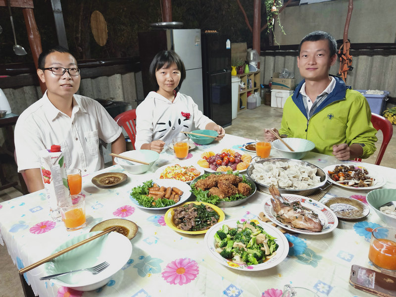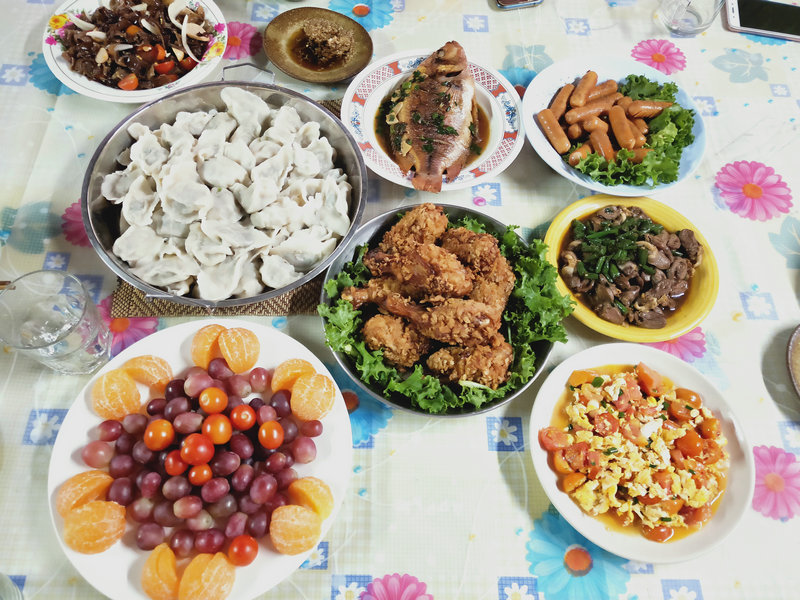 接下來請親愛的們欣賞我們過年前去花卉市場採購鮮花裝飾品的情景和年夜飯時的準備情景,這一次輝一邀請了我們的pitoy房東和隔壁龍炮與我們共度大年三十,表示對他們的感激之情,我們三個人一起參與製作年夜飯過程,還挺有集體生活熱鬧喜氣的感覺呢,光哥製作了經典美食炸香蕉片,還承包了大部分的包餃子活動,輝一一如既往的是擀餃子皮高手, 擀得皮薄好看,基本每次都會找他幫忙,我主要負責烹飪一些小菜,我們共同準備的晚餐功能表有水果拼盤、糖果零食拼盤、白菜蘿蔔豬肉餡餃子、孜然粉煎香腸、西紅柿炒蛋、年年有魚(餘)、雞心炒辣椒、炸雞腿、涼拌木耳、西藍花炒杏鮑菇,還有果汁飲料,之後一起觀看了央視春節聯歡晚會,如意、滿足、開心、喜悅,感謝上帝時時呵護, 讓我們度過了一個幸福快樂的夜晚。