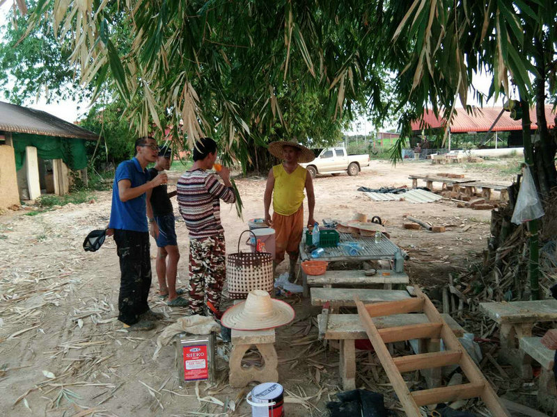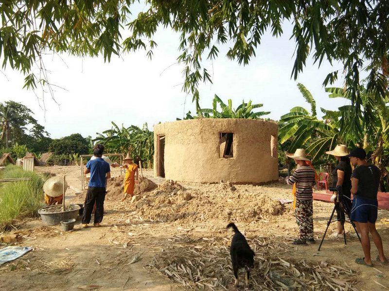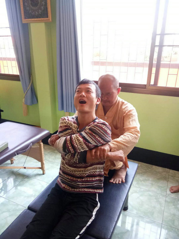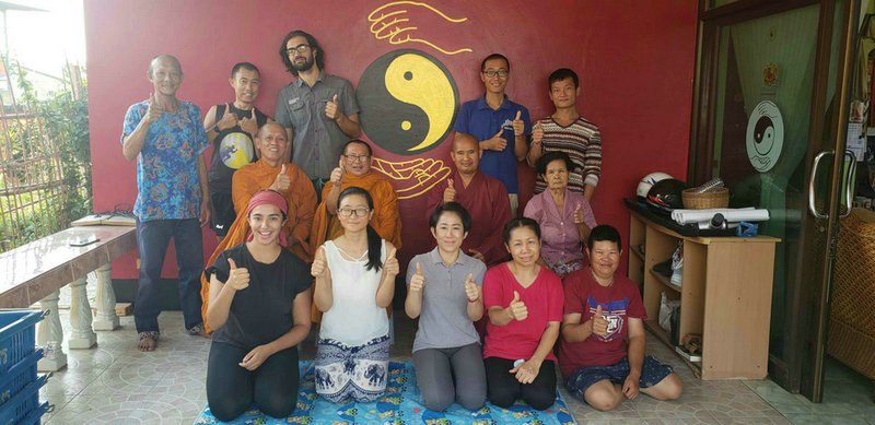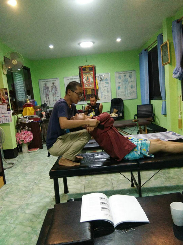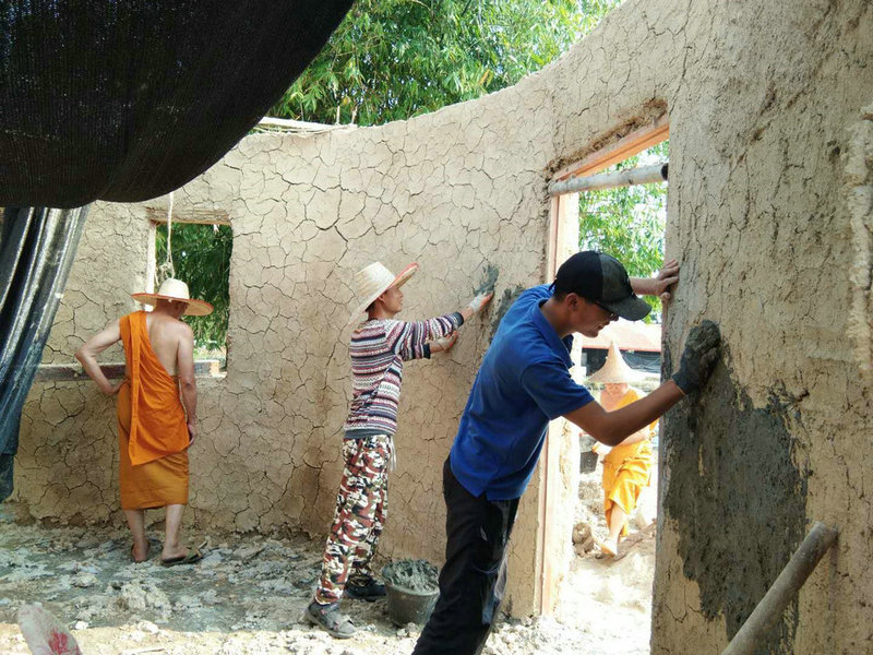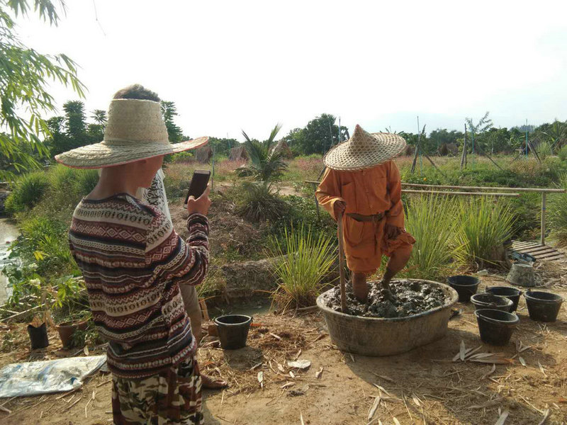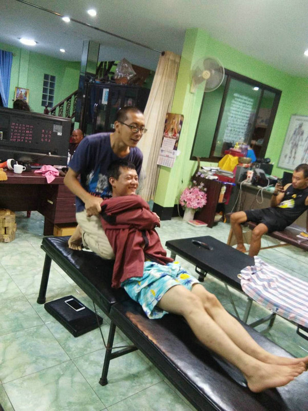 前段時間,輝一受隔壁寺院主持的邀請,特約去拜訪了達隆師傅,他是正宗的泰國人,但在台灣當大和尚生活修行了二十幾年,最近返回家鄉處理事情,專業是搞正骨按摩,業餘時間還會幫別人測生命密碼,會說一口流利的中文,輝一、仰樂、千姿三人小組一起去體驗了他家裡的類似農場,利用三天的時間學習了一套正骨按摩手法,據說有幾十個動作,每天要反覆練習多次, 順便還參與體驗了蓋土房子的建築工作。