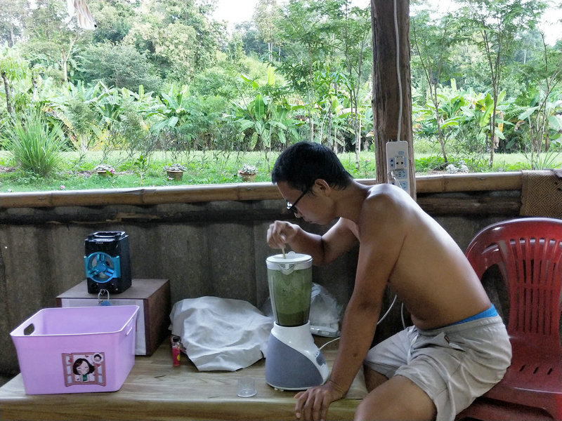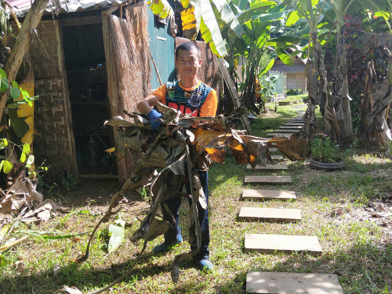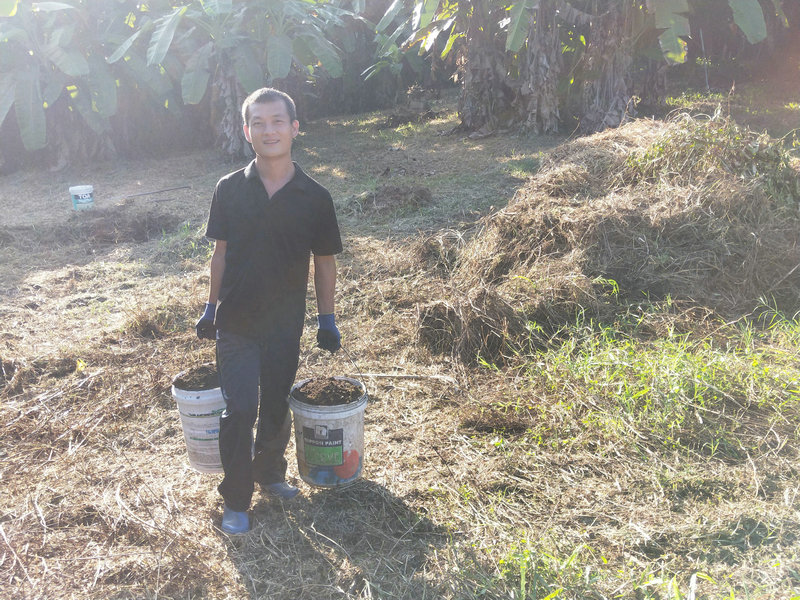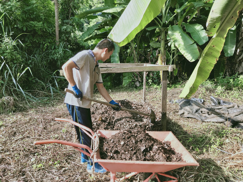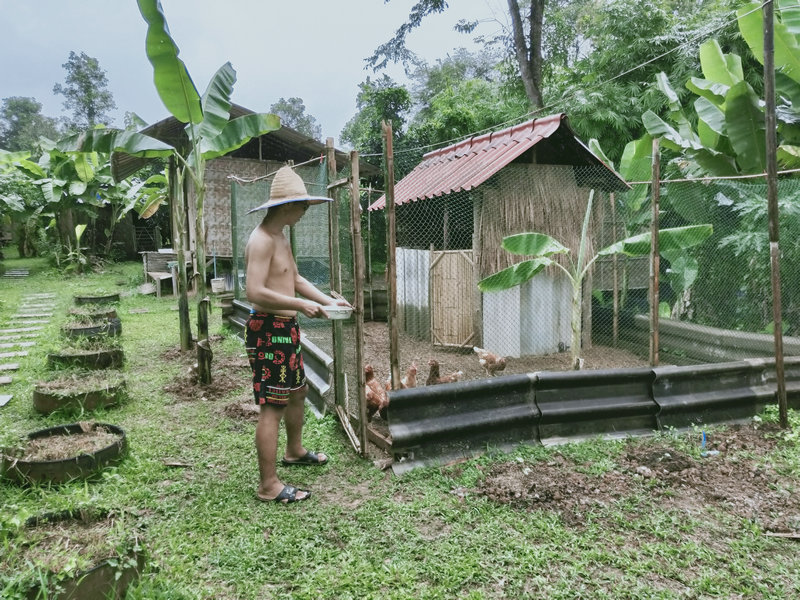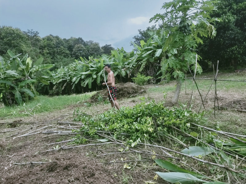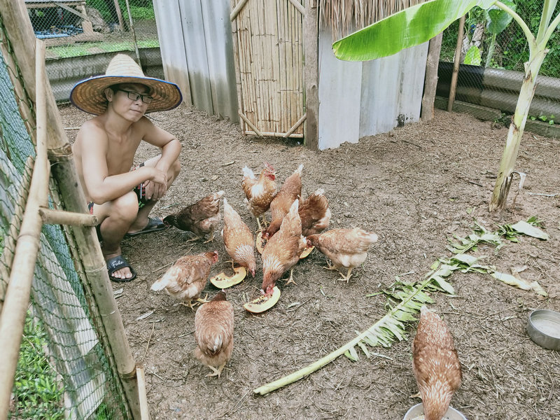 光哥屬能工巧匠,善於思想動手創造,比如最近設計晾衣架、翻修新台階、修復洗衣房地板、維護雨水過濾系統、自製洗潔精、自製蚊香、切菜板、菜地用叉子、鐮刀等等,只要需要維修造點啥房子傢俱或基礎設施之類的那就找光哥出馬,如此生活更便利舒適了。 雞寶寶們遇到了光哥也是好福氣,光哥每天小心伺候著,研究它們的喜好和需求,主食是玉米碎和稻子,每天水果蔬菜有木瓜香蕉和各種葉子,為了怕它們曬太陽熱,特意在雞舍旁邊種植了三株芭蕉樹,並且我們按他的提議周圍栽植了一些各種瓜苗,如此既可以遮陰也是一道風景。