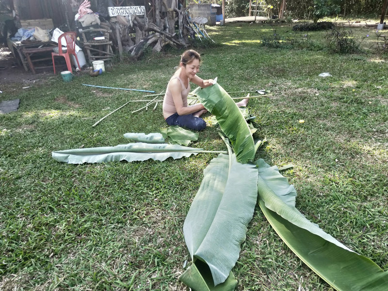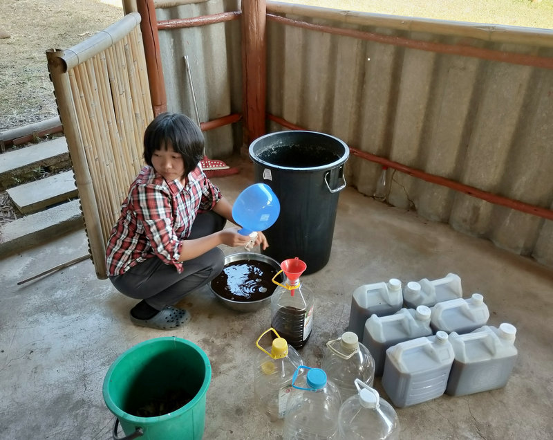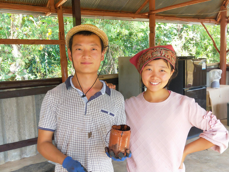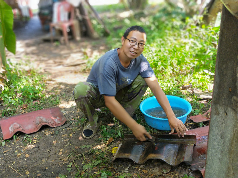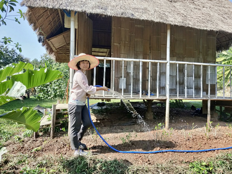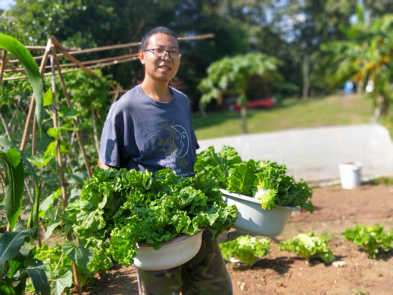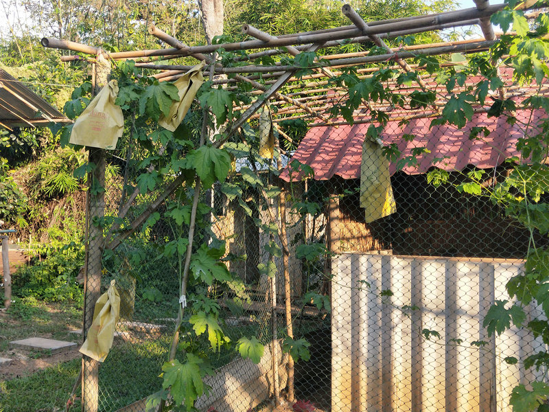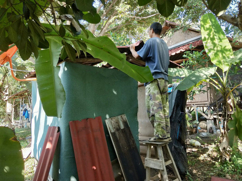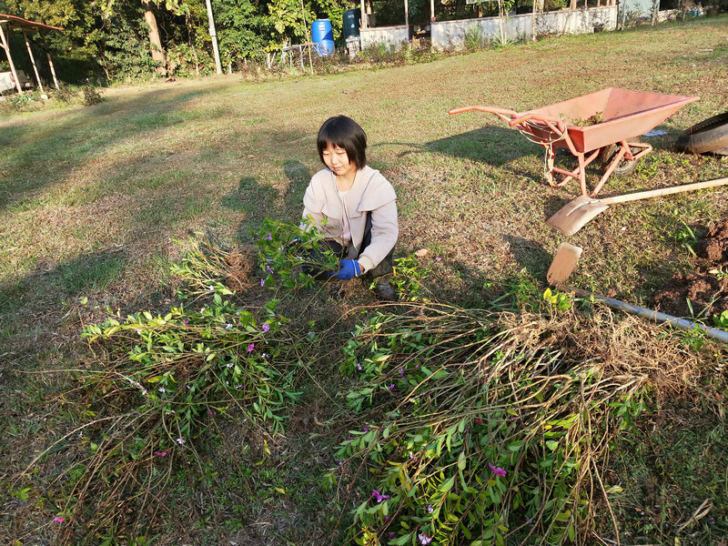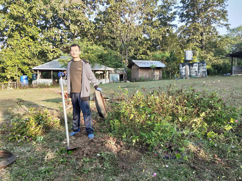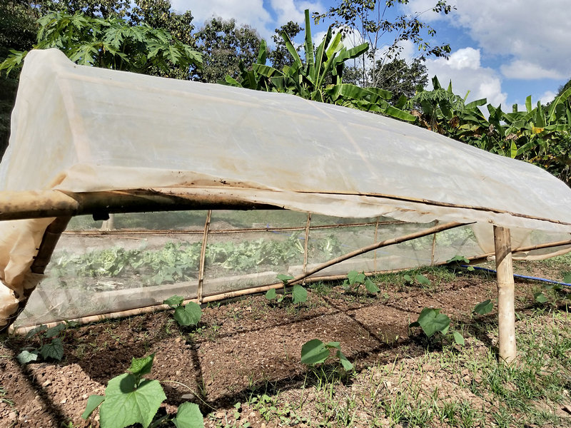 除了這項工作外,輝一有空就扛著割草機上山漫山遍野地繼續清理雜草以及各種灌木,摟草製作堆肥,據pinan之前說這裡大概有40畝的地,他總是很有耐心毅力把山上山下只要長草的地方,不管是在山溝里還是陡坡上,一律馬不停蹄地衝上去一掃而光,泰國這邊割草是很重要的一項工作,因為大多地方沒有地契,誰管理預設就是誰的地盤, 若是哪塊地荒草叢生管理不周了,好像很快就會被當地政府沒收回去,所以這是一項不得不做的艱巨任務。 光哥每天也默默地創造著各種手工藝品,短短時間製作出了4個堆肥框,包括三個草肥框(主要是輝一收集他割下來的雜草)和一個廚餘雞糞框,6個蔬菜架子,1個防蟲網罩,給房東維修衛生間的房頂和製作桌子,有些還沒來得及拍攝製作過程,就已經驚喜地擺放好了。 我的主要工作是做飯種菜,南國自然氣候好,蔬菜長勢迅速,但病蟲害跟著也不少,有些喜涼蔬菜貌似並不適合在熱帶種植,蟲子吃菜的速度驚人,但又不願使用農藥,為了防止它們鑽進去偷菜吃,給部分蔬菜套上了仰樂之前種菜用的袋子,這下效果還可以,至少能享用一些無蟲蔬菜了。