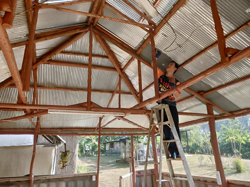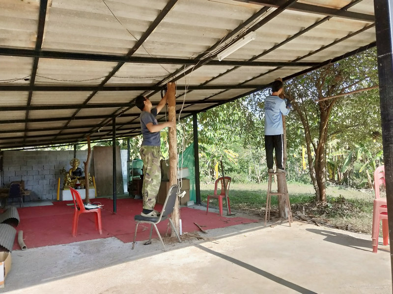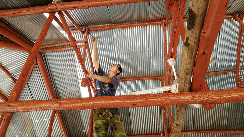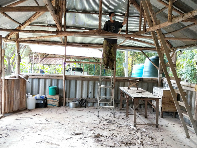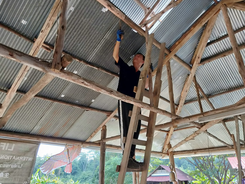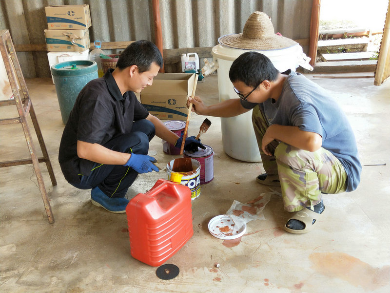 最近在忙著維修廚房,廚房餐廳一體,價值很大,是我們的主要活動場所,是由前期過來的一些兄弟姐妹們合力建設完成。 當時主要採用的是木質架構,經過了兩年多的時間,木頭遭遇螞蟻和蟲蛀的現象,這一段時間每天木頭上唰唰唰會掉下一層木屑,影響了廚房的乾淨整潔,因此我們決定徹底維修一番,先是集體刮刮樹皮,把所有樹皮全部刮一遍,然後吹乾淨,光哥先是用空壓機進行噴漆一遍,輝一接著用刷子再細刷一遍,本來購買的棕色漆刷出了紅泥土的接地氣效果, 買的黑色油漆刷出了紫紅的暗色調美感,經過維修刷漆一番後,感覺廚房瞬間變得高大上起來了,格調都不一樣了,新鮮舒適。 這兩天他們繼續又在維修更換冥想廳的柱子。